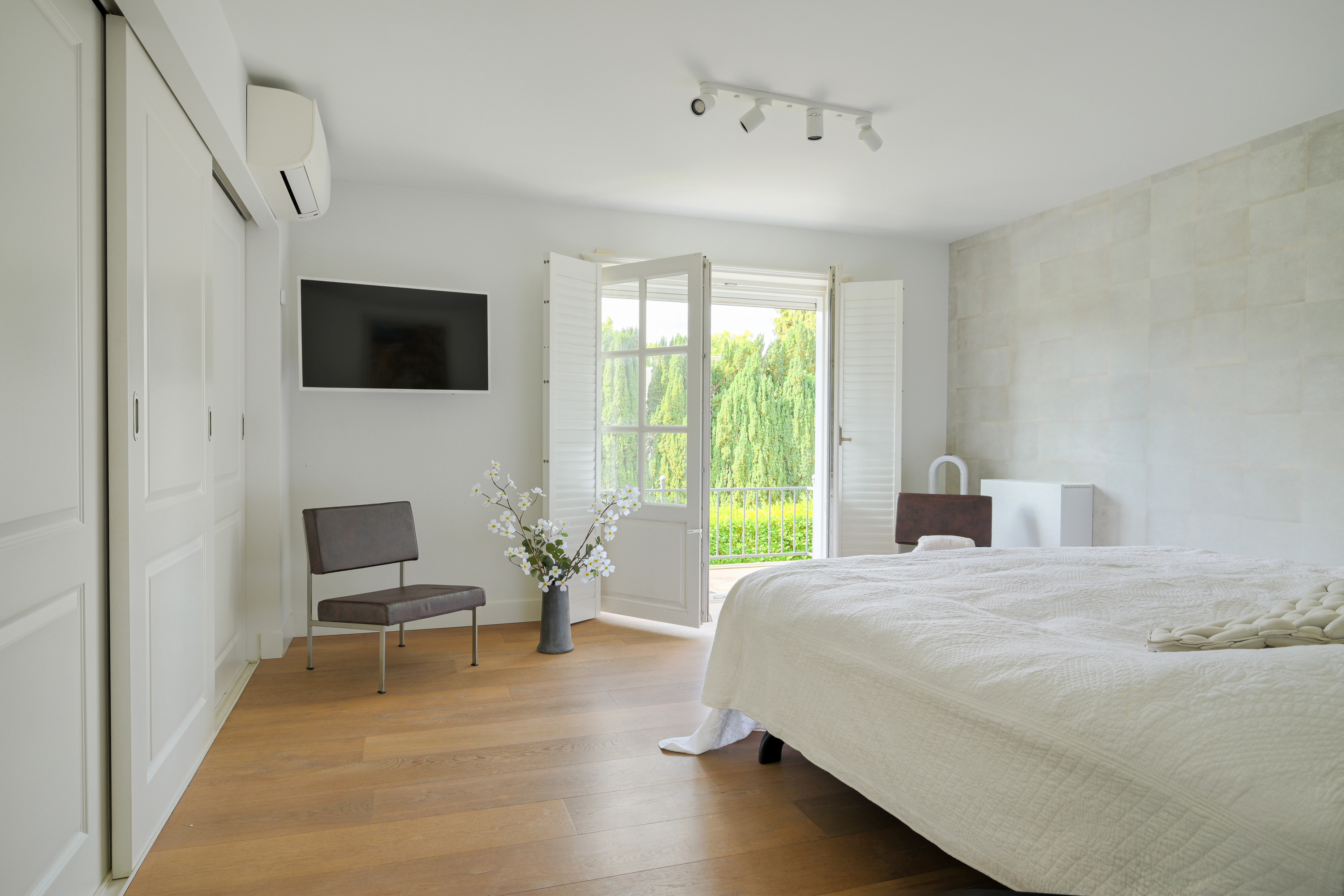 French doors open onto the balcony. This room also has air conditioning and a large fitted wardrobe on the side wall.