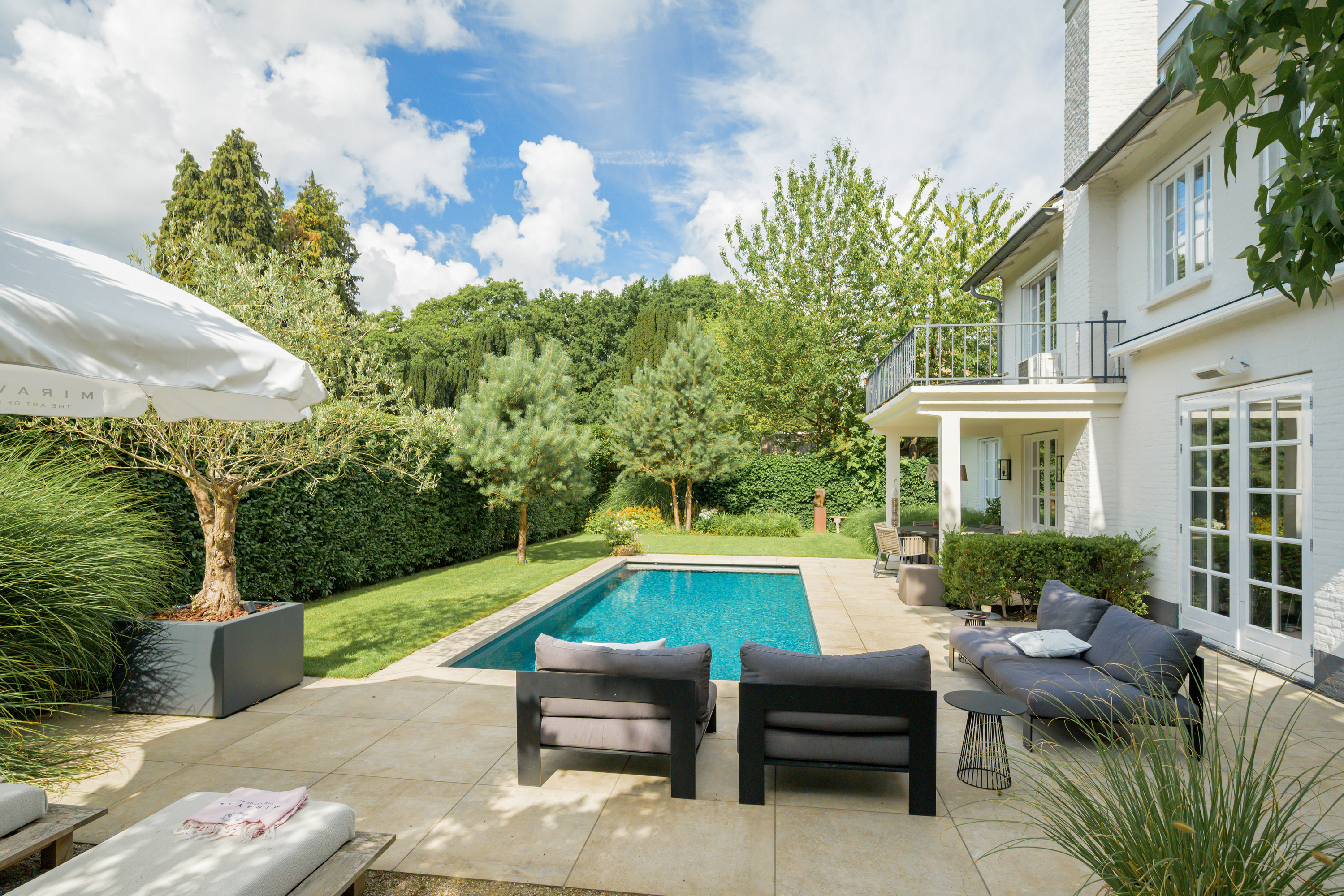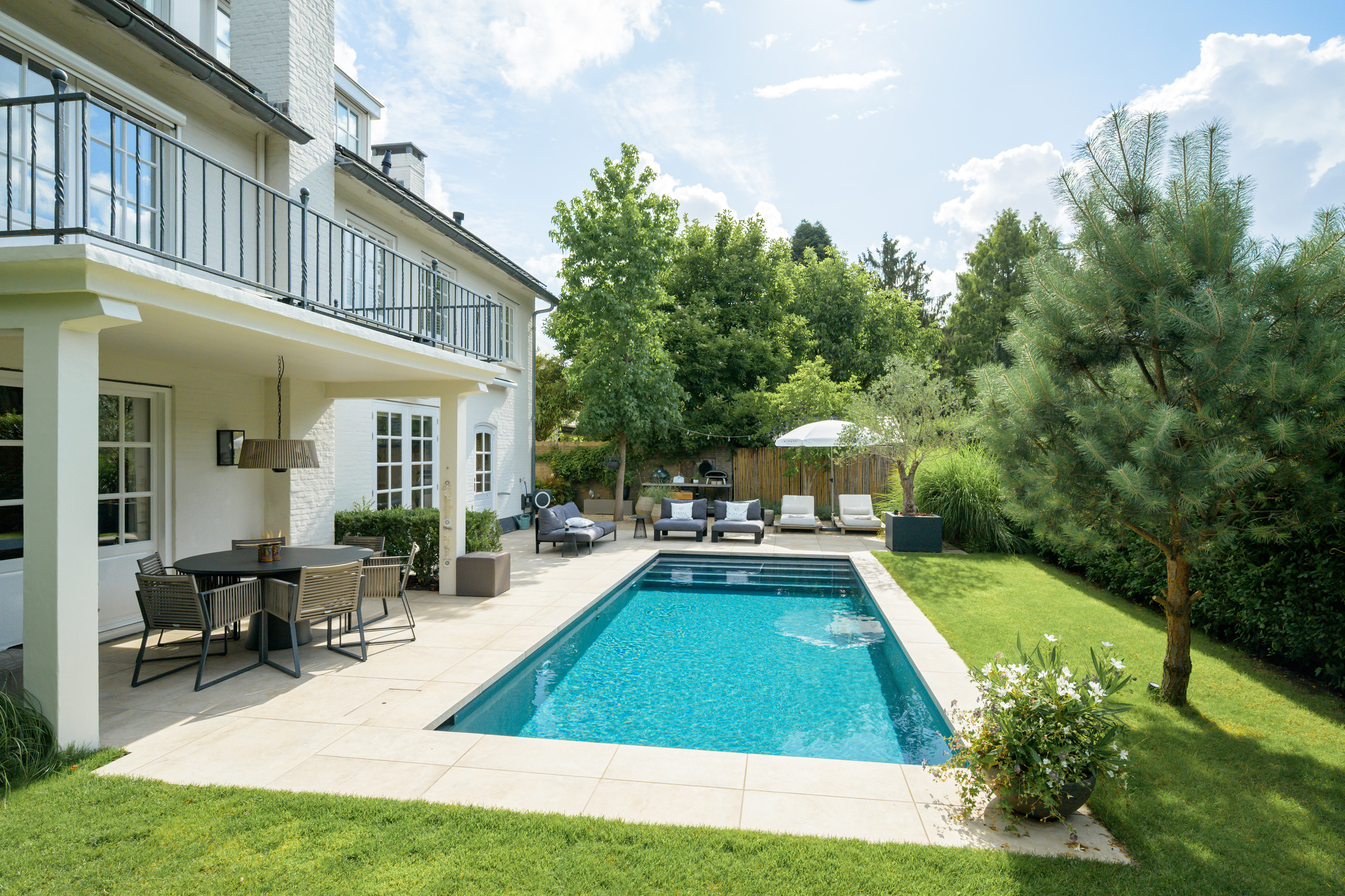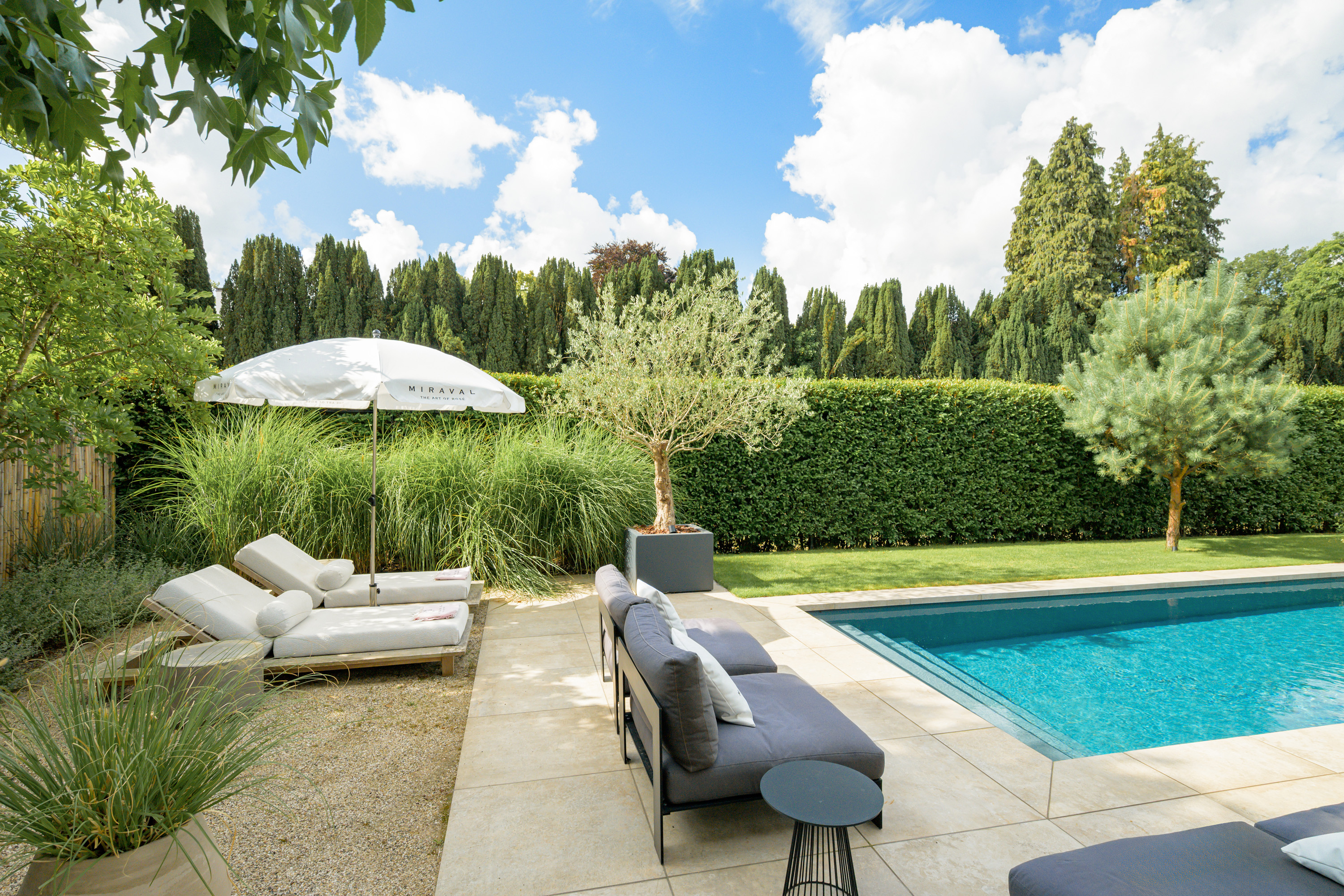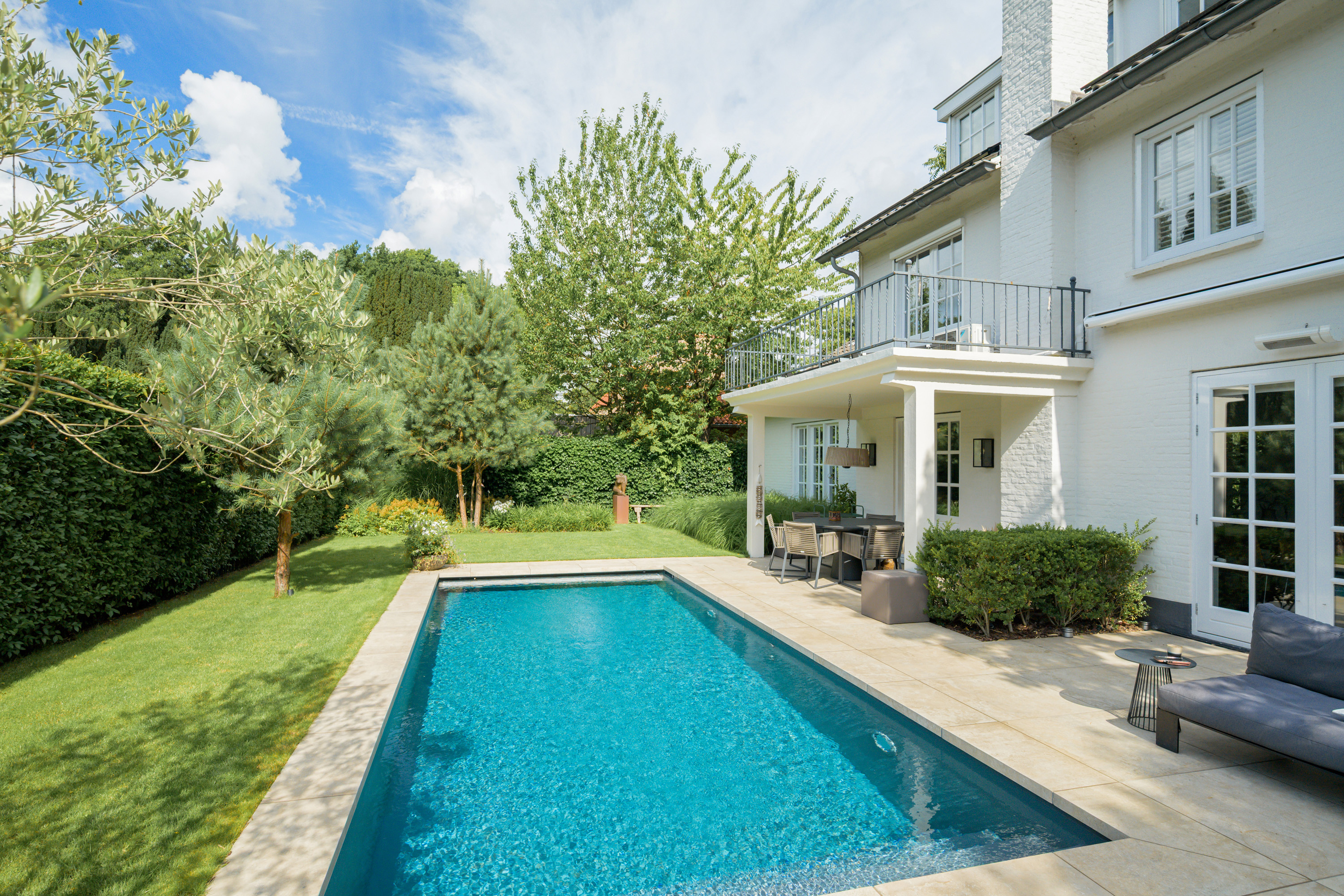 The garden, designed by Ronnie Renette (Arterior), features a lawn, a modern sleek swimming pool with automatic solar cover and heat pump, and multiple terraces.