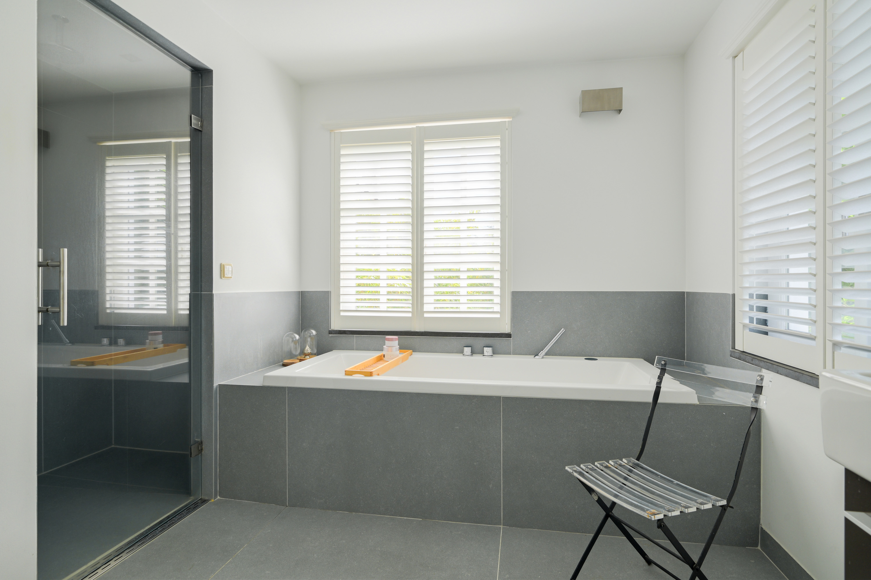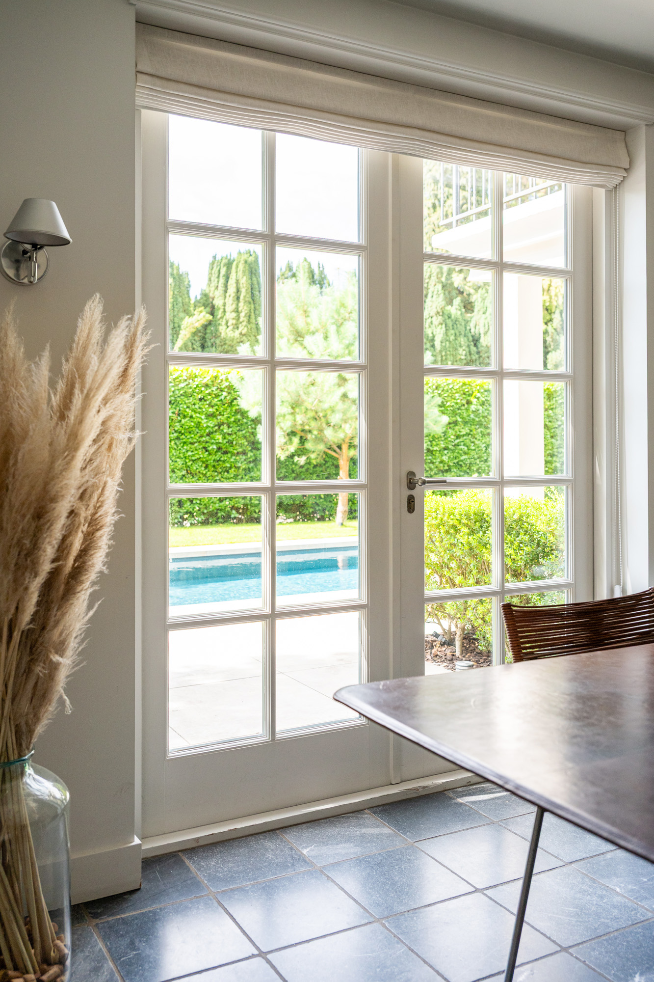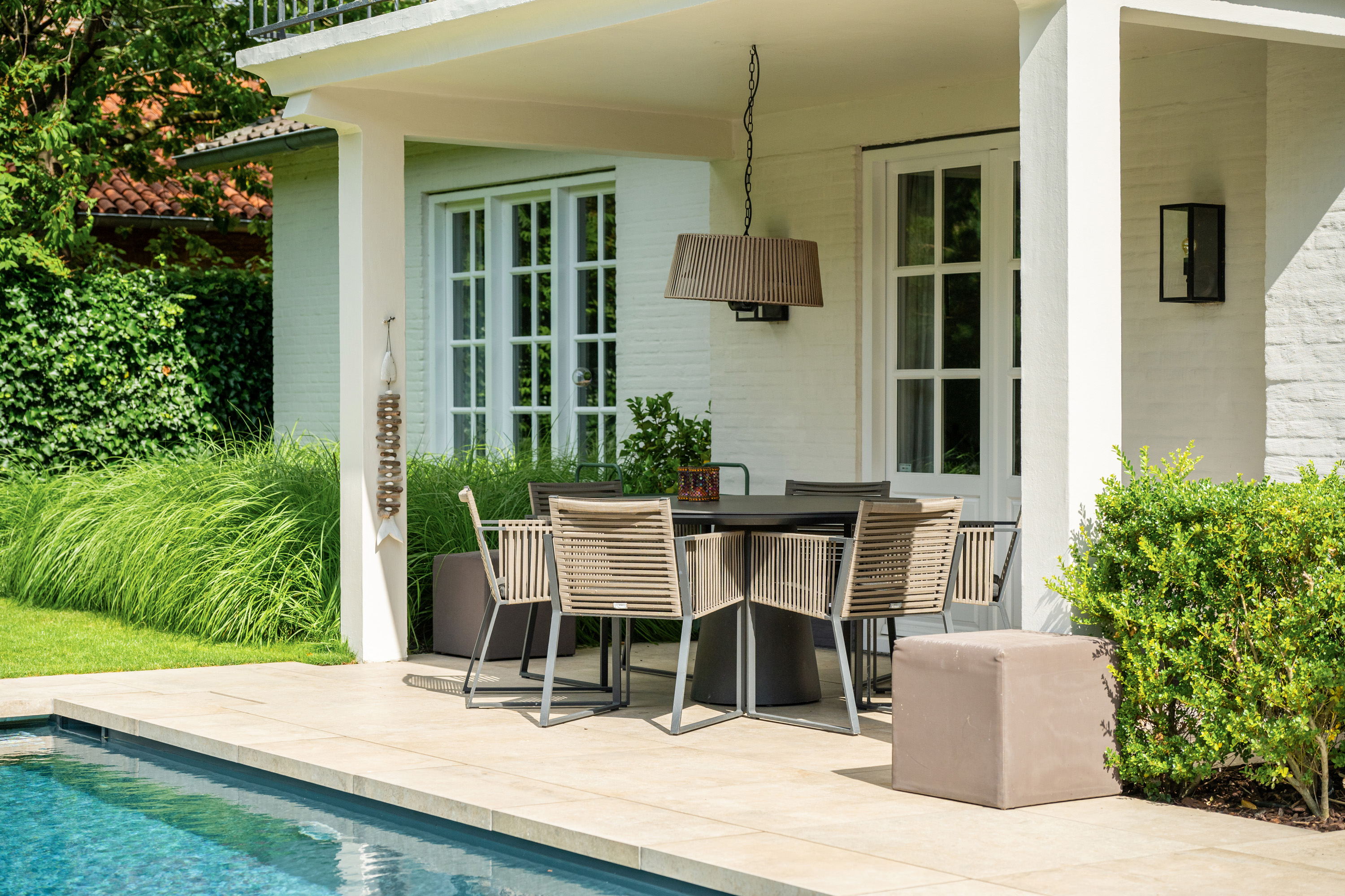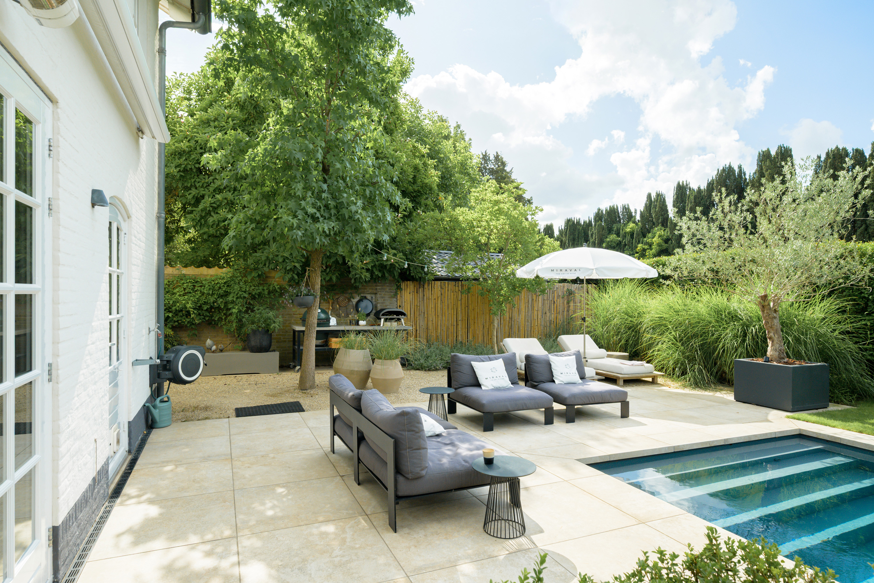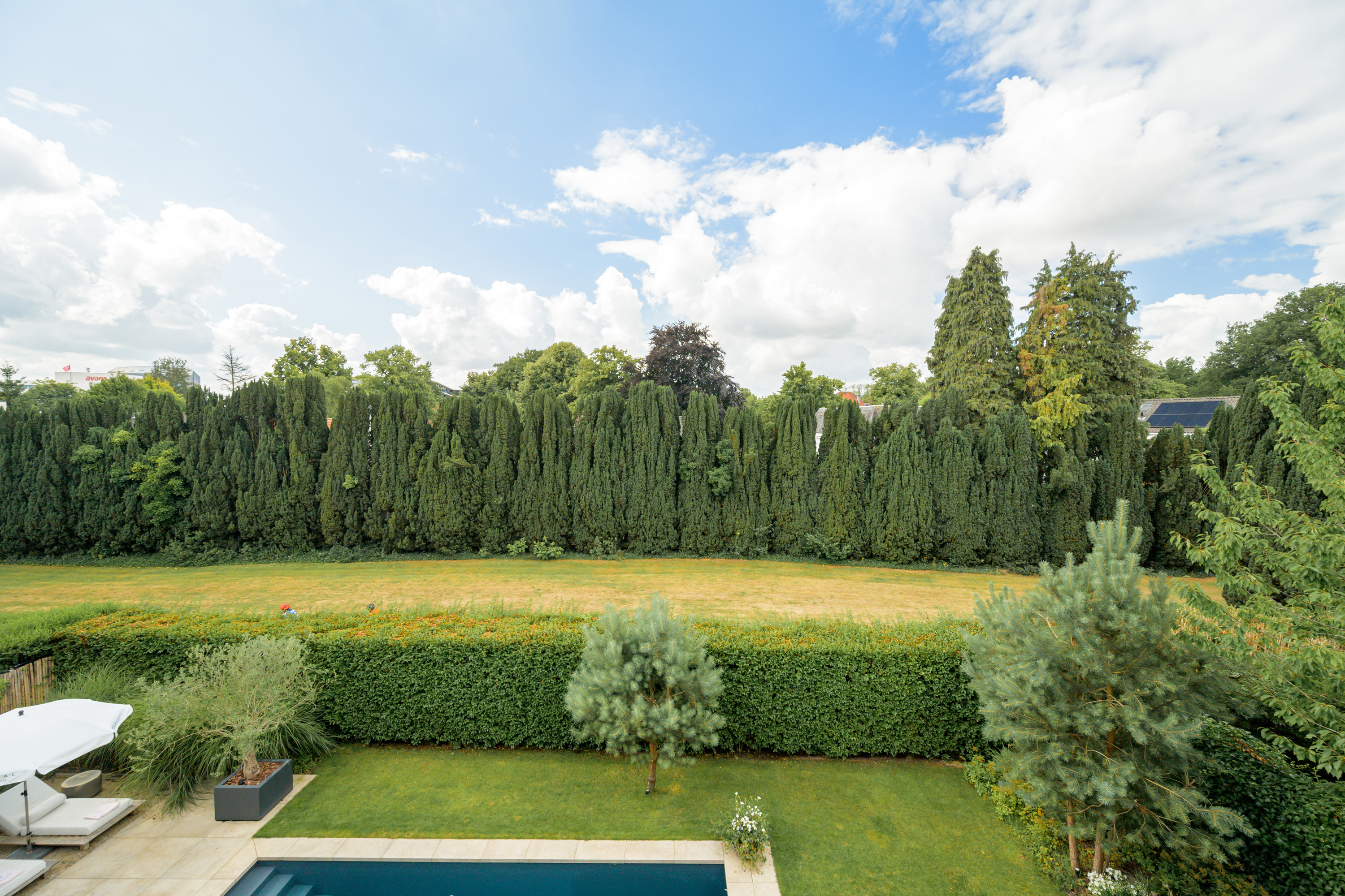 The garden, designed by Ronnie Renette (Arterior), features a lawn, a modern sleek swimming pool with automatic solar cover and heat pump, and multiple terraces.