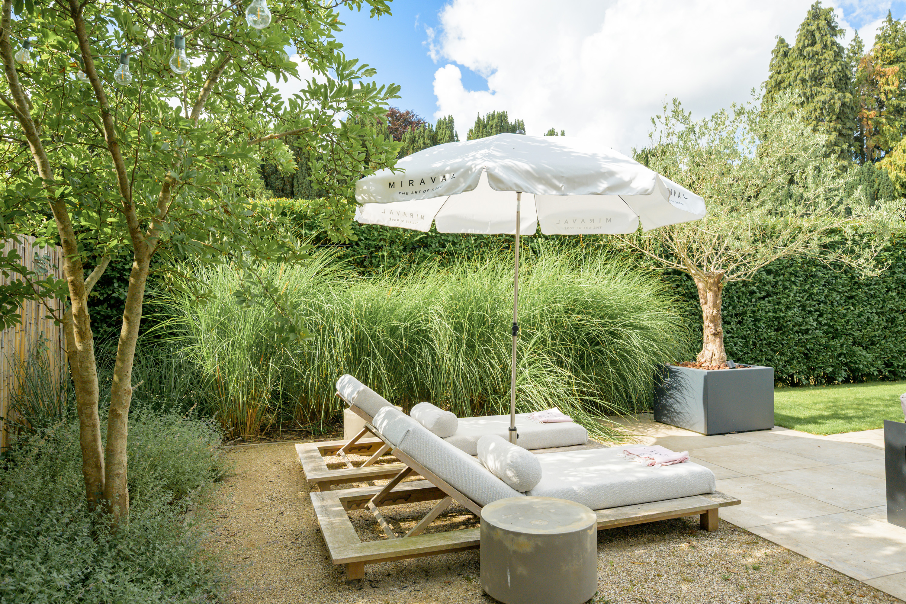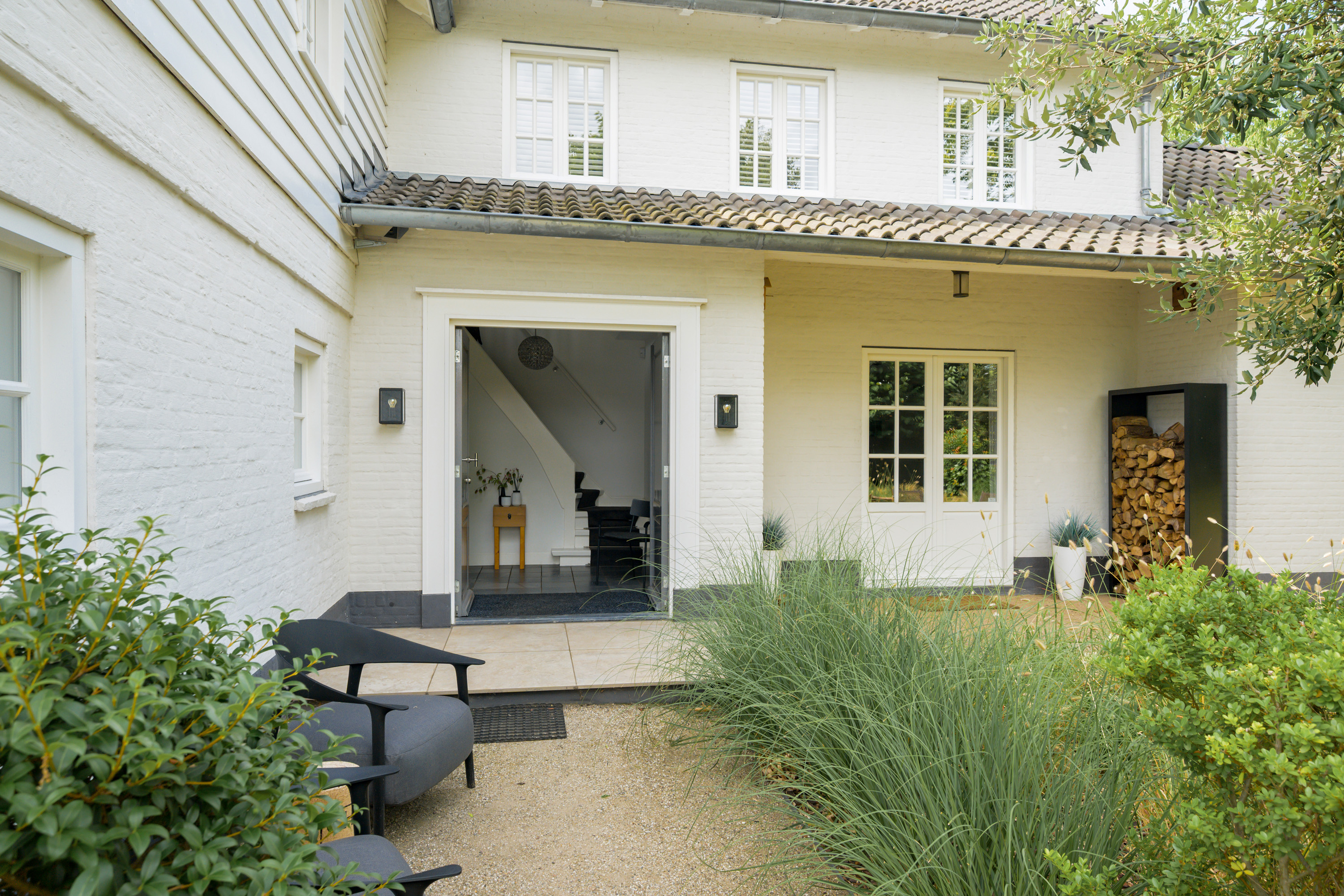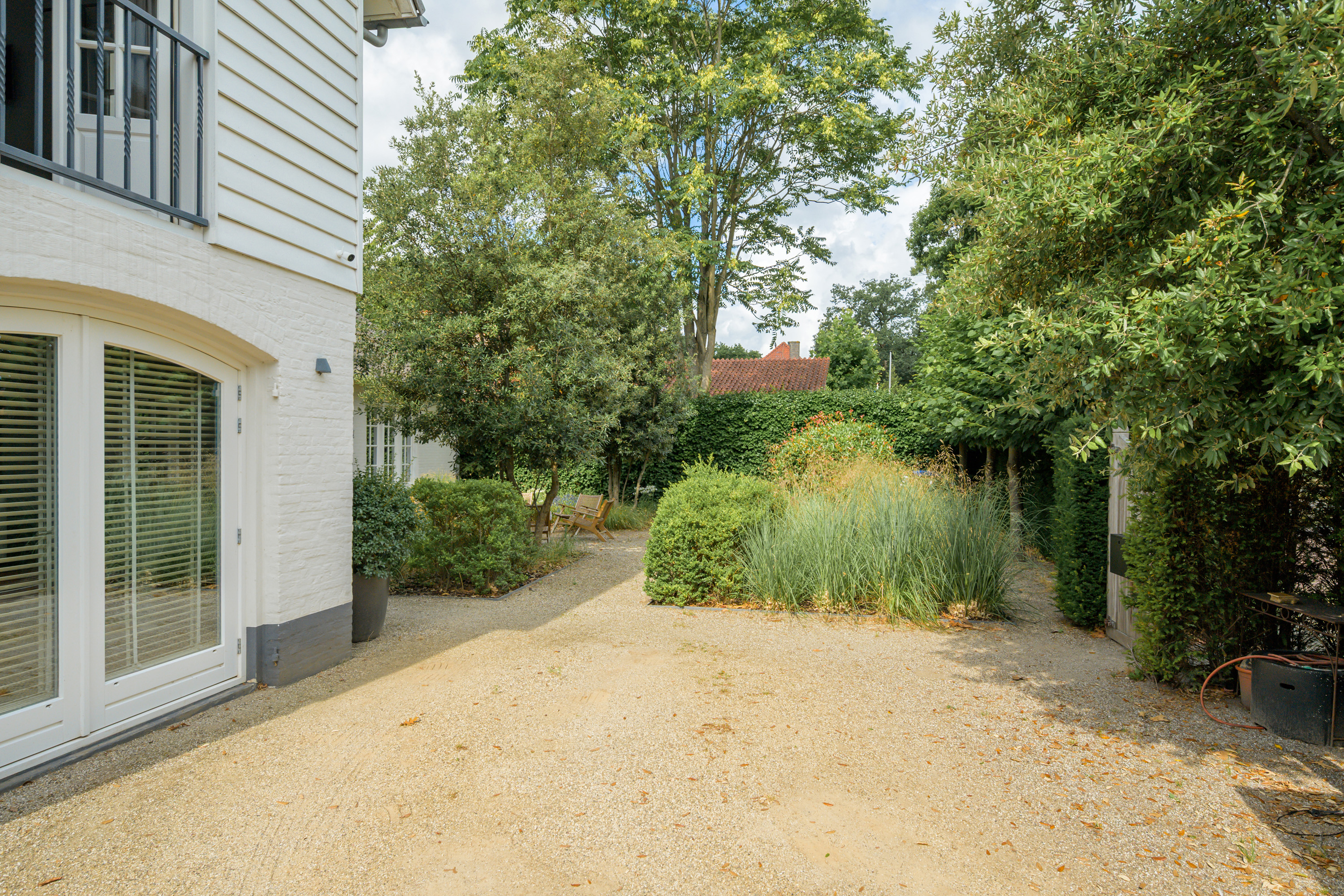 Borders are filled with a variety of plants and ornamental grasses, complemented by several trees and hedges for a lush yet structured appearance.