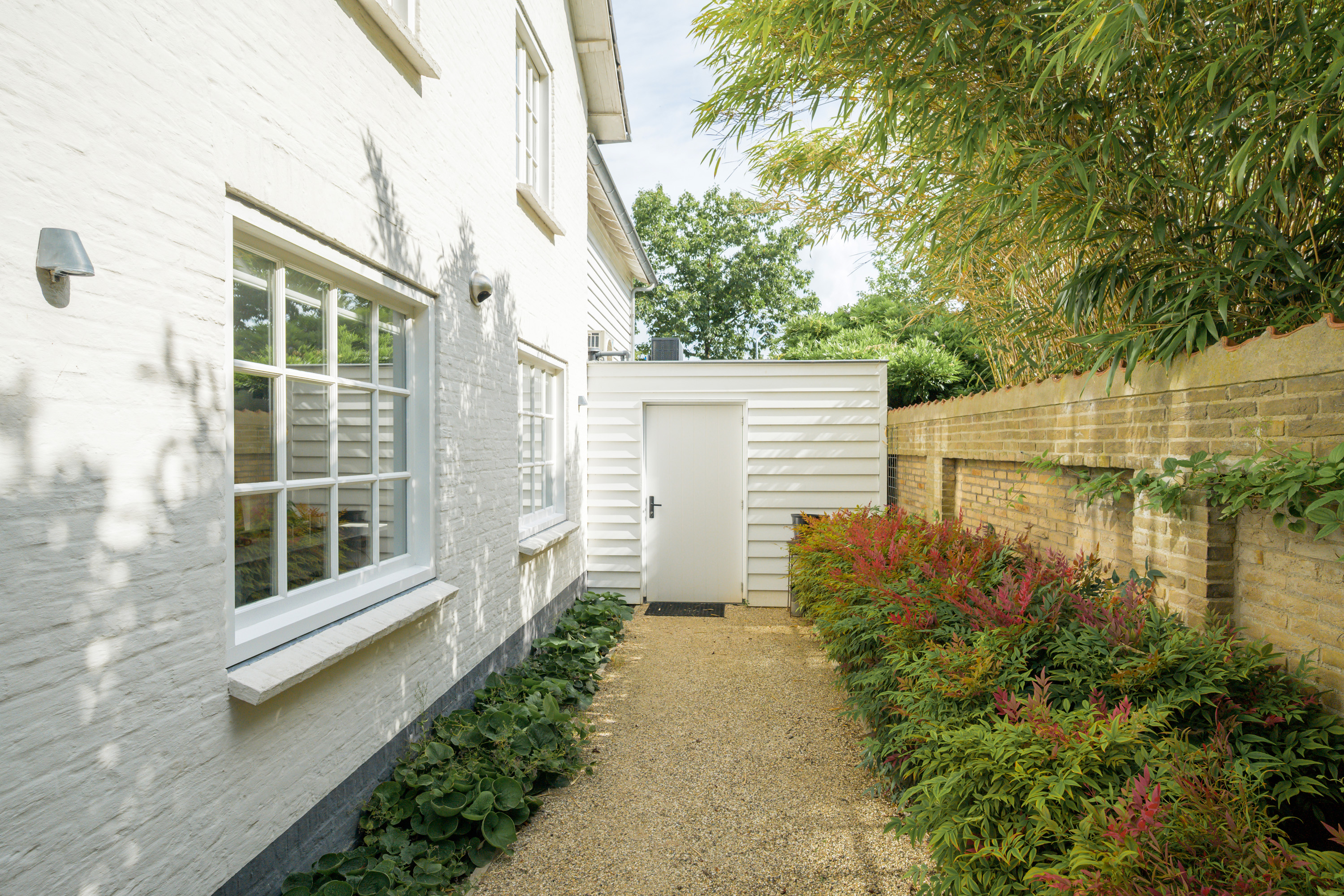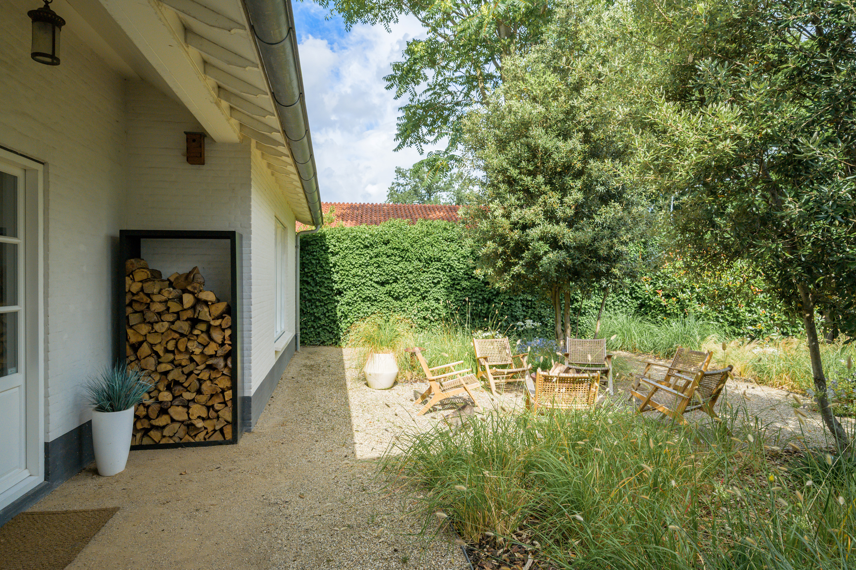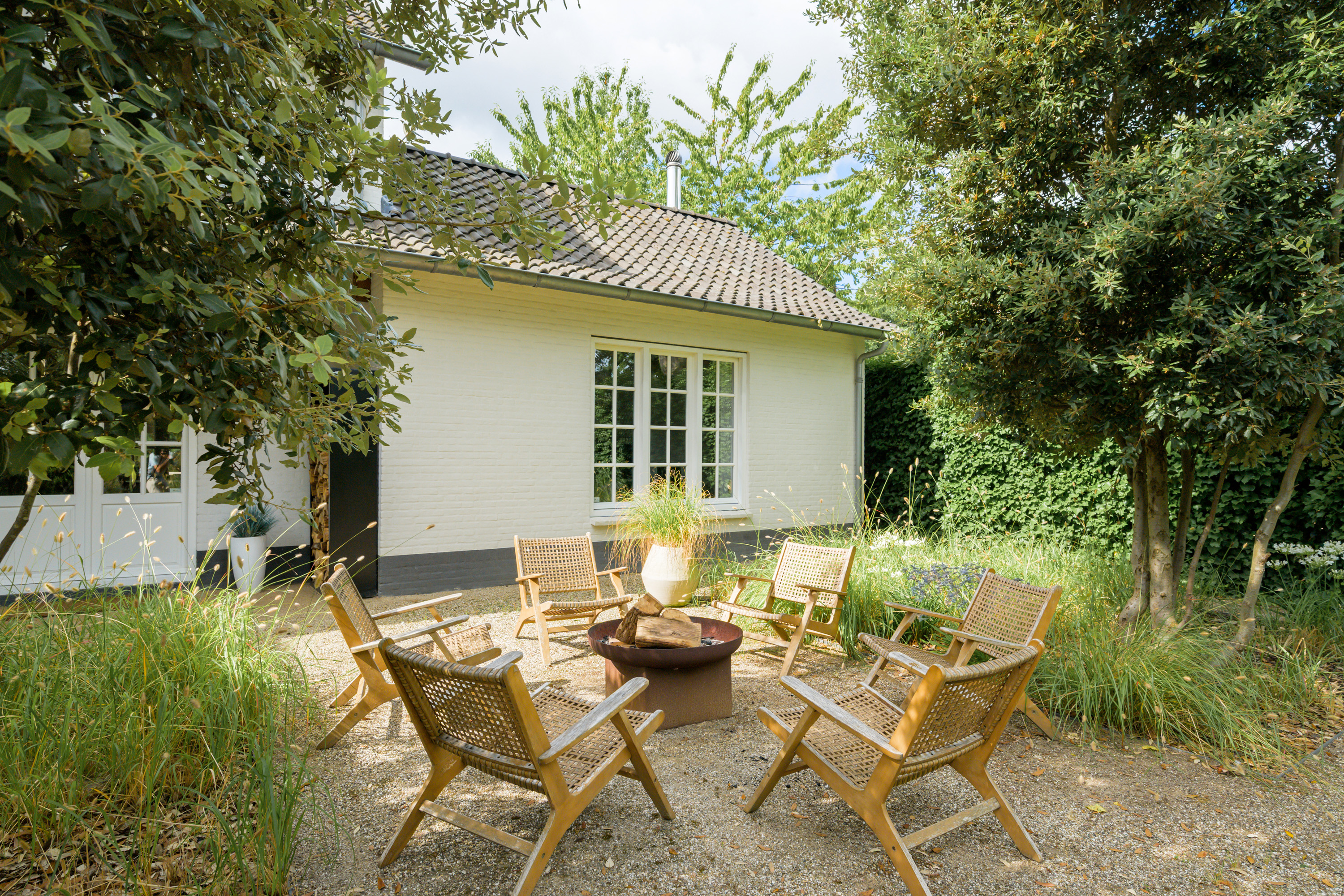 Borders are filled with a variety of plants and ornamental grasses, complemented by several trees and hedges for a lush yet structured appearance.