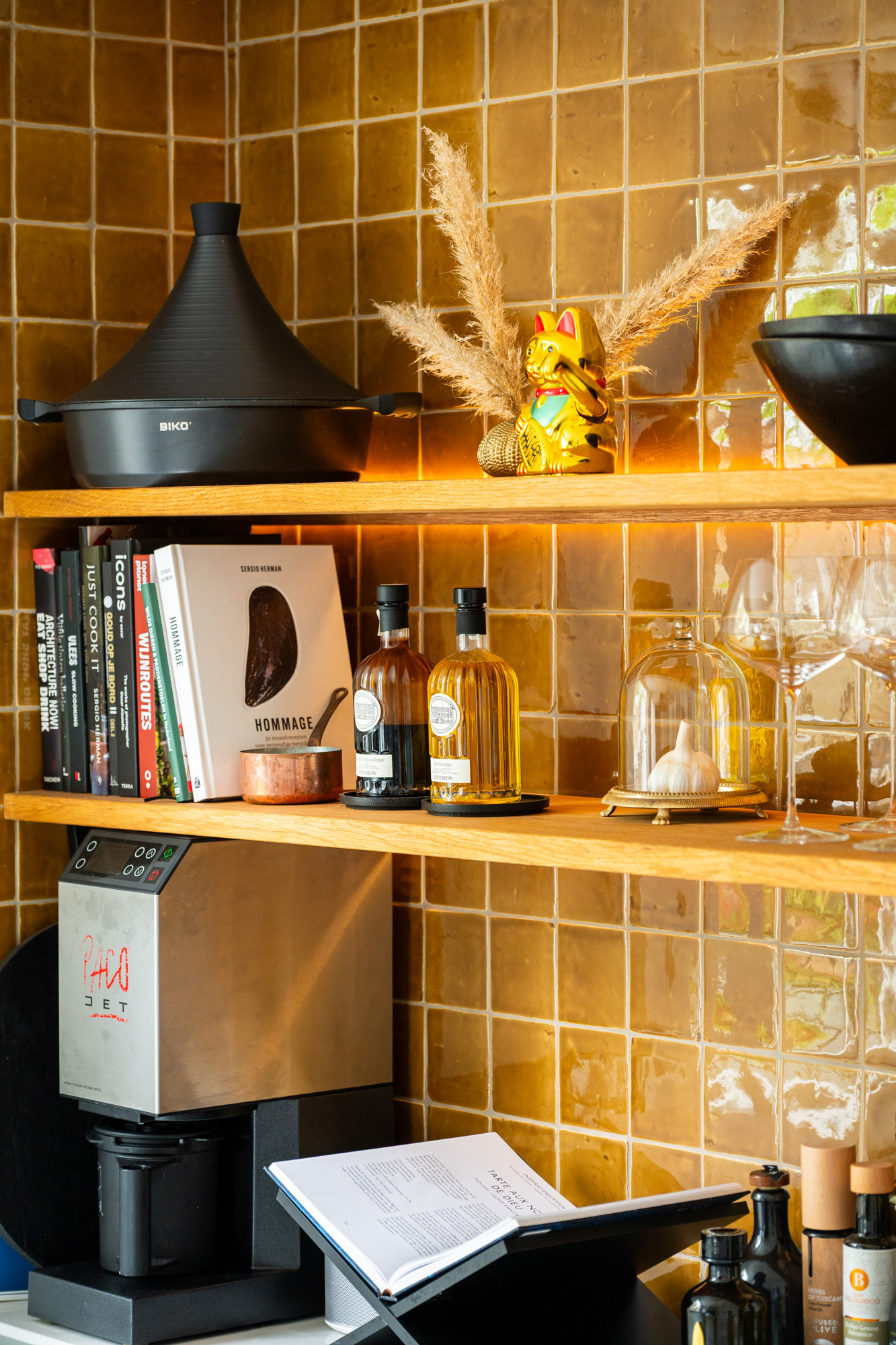 On the opposite side, there’s a coffee corner with a small composite countertop and additional storage. A side door provides access to the garden.