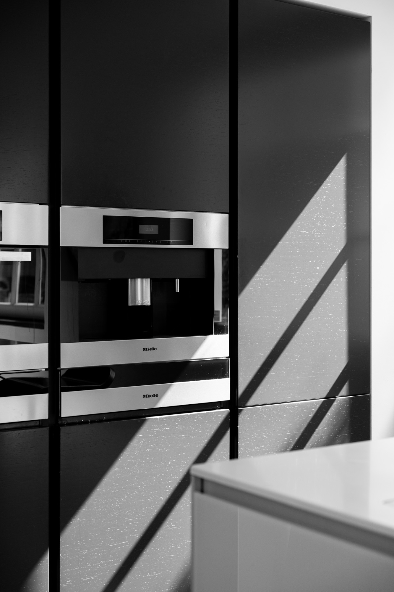 The wall unit includes two refrigerators, a freezer, espresso machine, combination oven, two warming drawers, and a dishwasher.