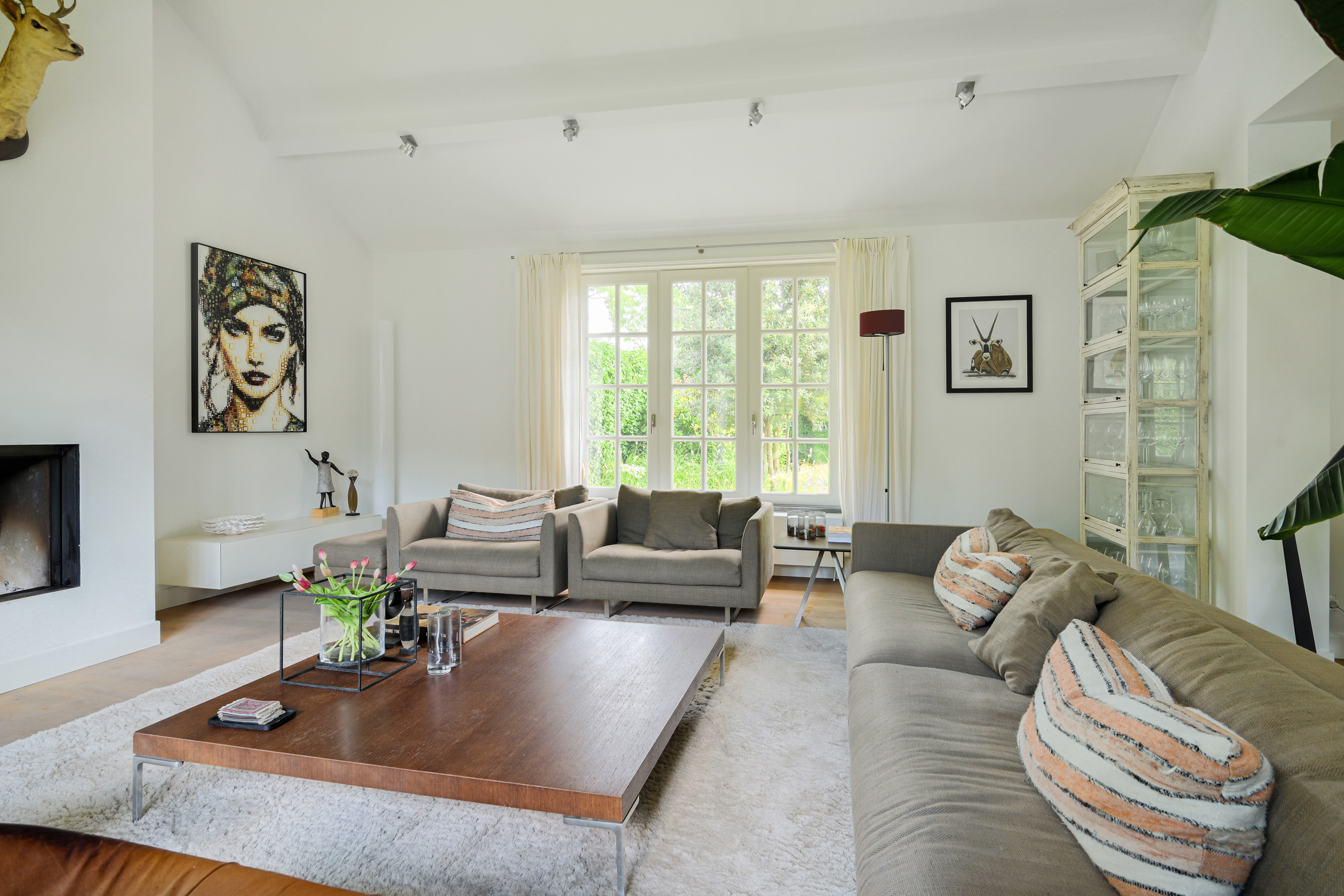 The dining room adjoins the kitchen and flows seamlessly into the living room. A built-in wall unit provides generous storage and houses a gas fireplace. French doors connect this space to the garden.