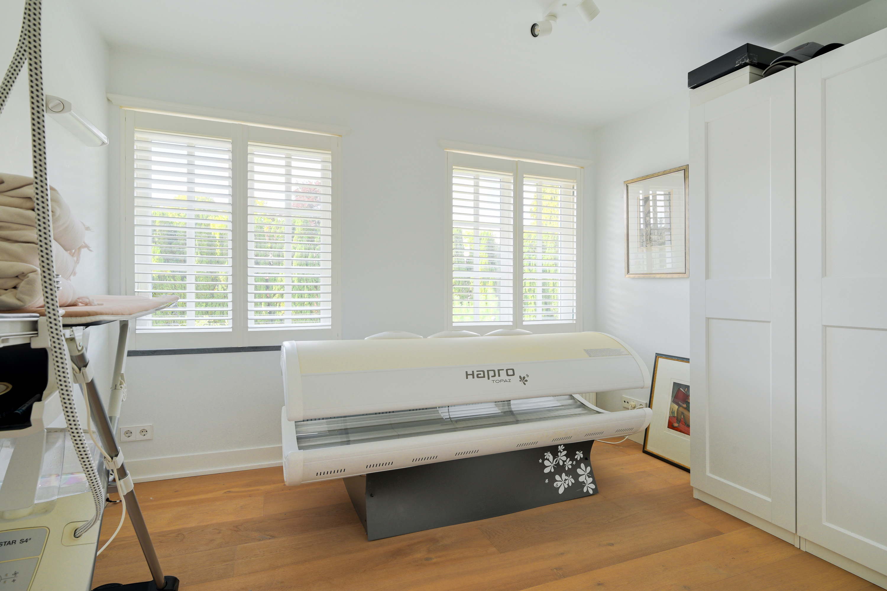 It contains the fully automatic pool system and an additional fuse box. The space offers ample room for gardening tools, bicycles, and more.