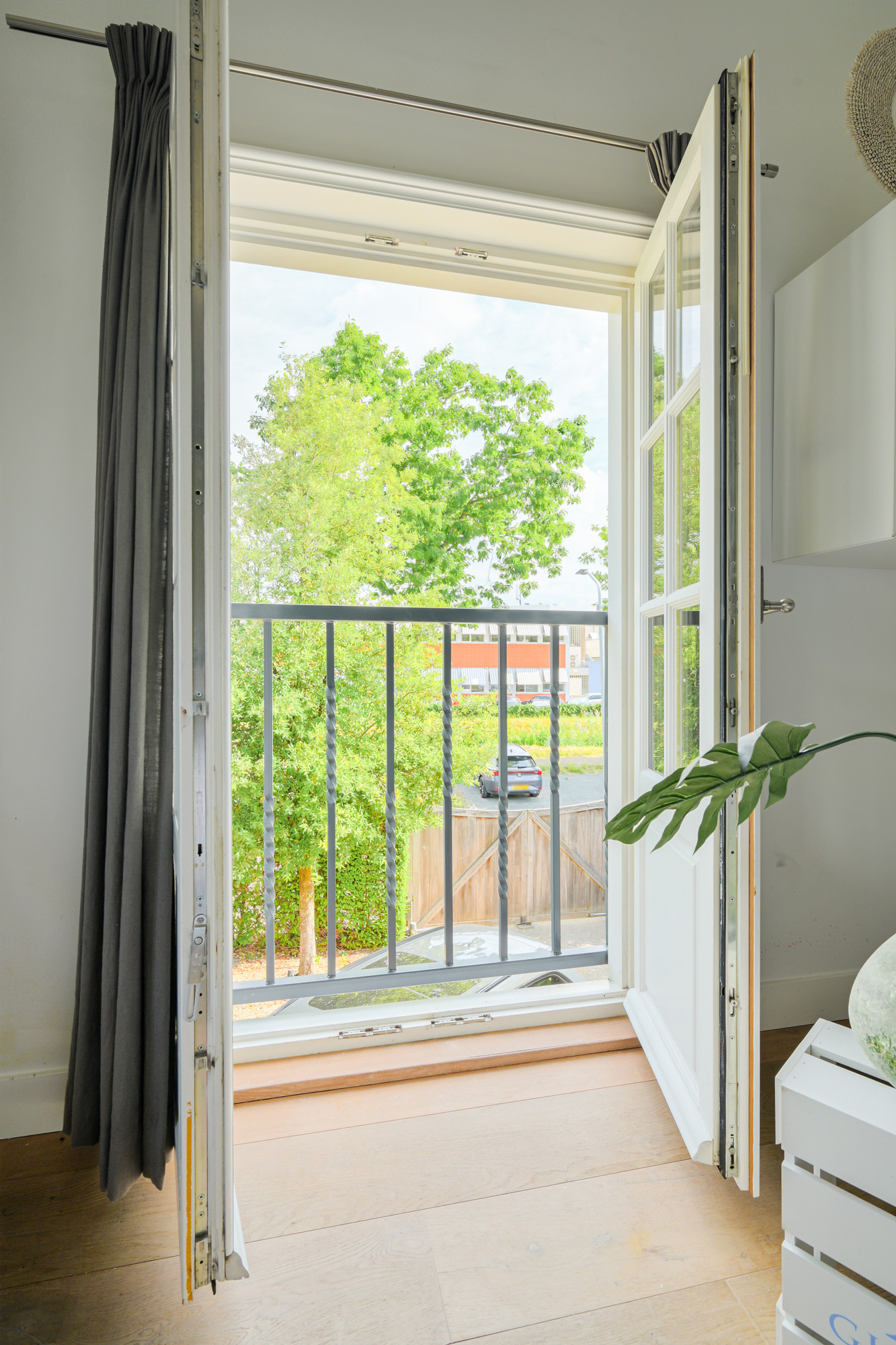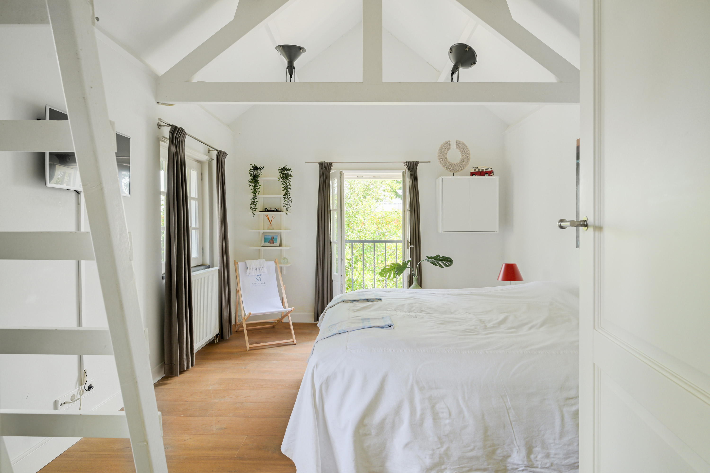 Spacious front bedroom with a French balcony and open roof structure adding a sense of space.