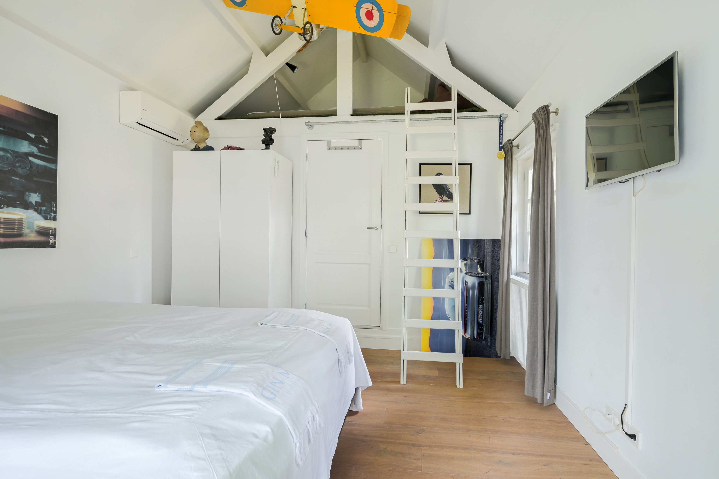 The room includes a mezzanine/loft bed and air conditioning.