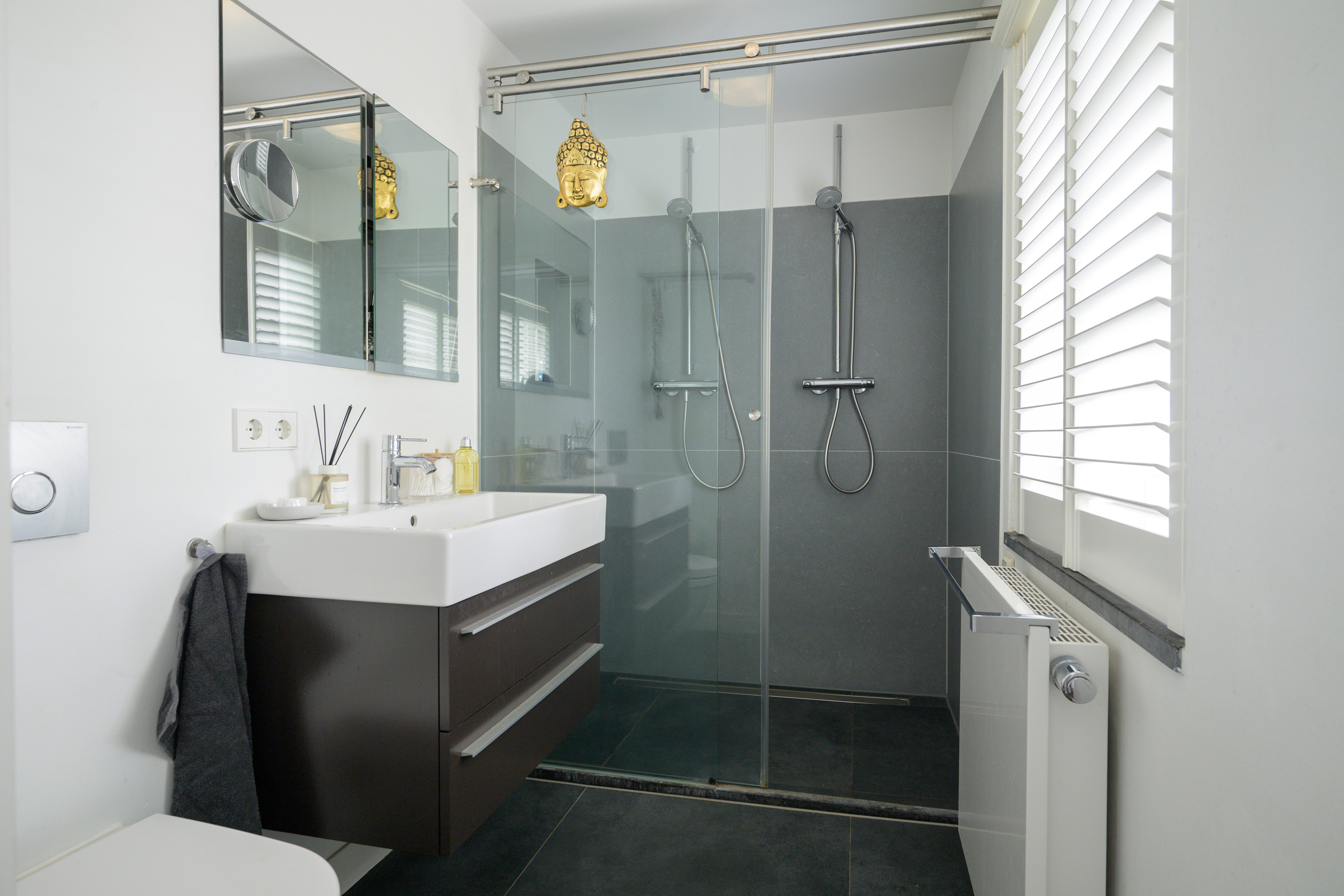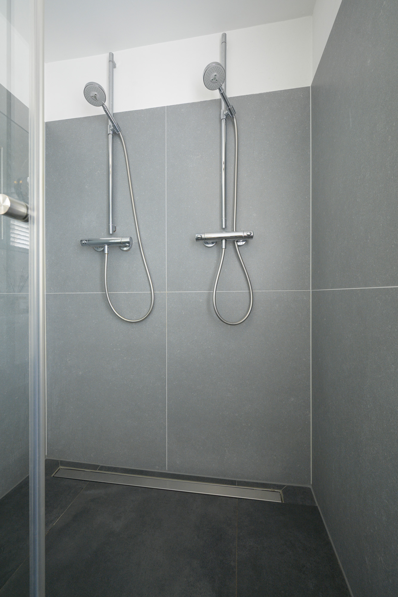 En-suite second bathroom with walk-in shower (dual showerheads with thermostatic controls), vanity unit, and toilet with concealed cistern.