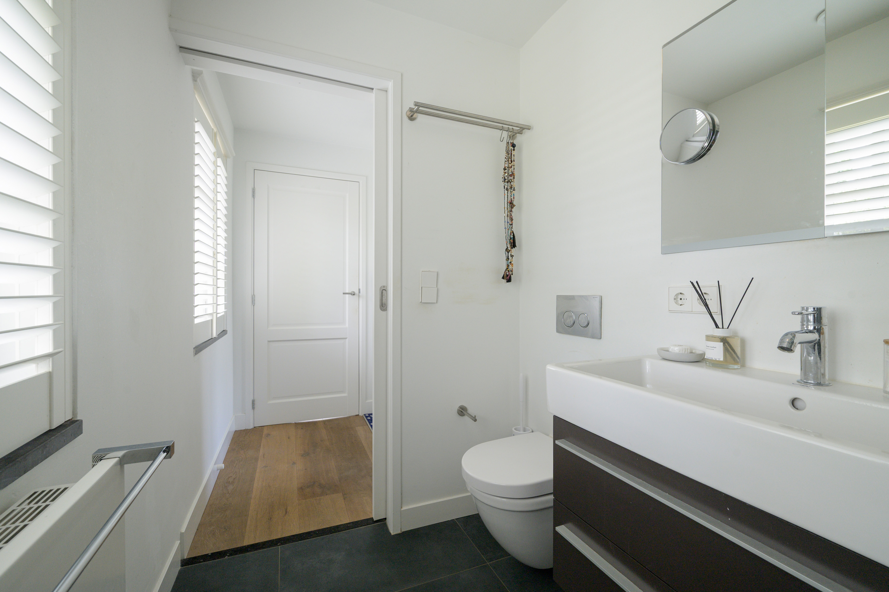 Guest toilet with wall-mounted WC, concealed cistern, and wash basin.