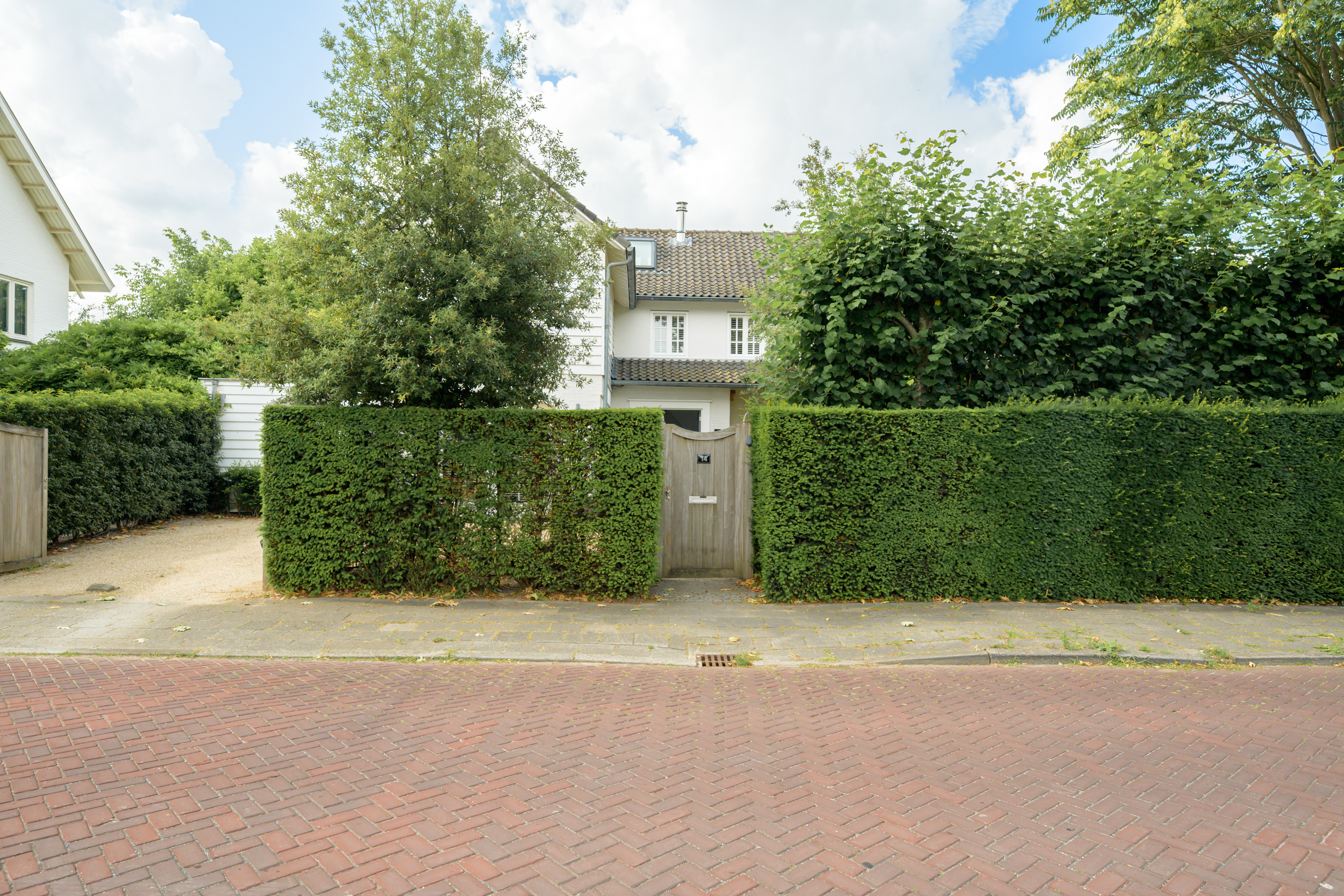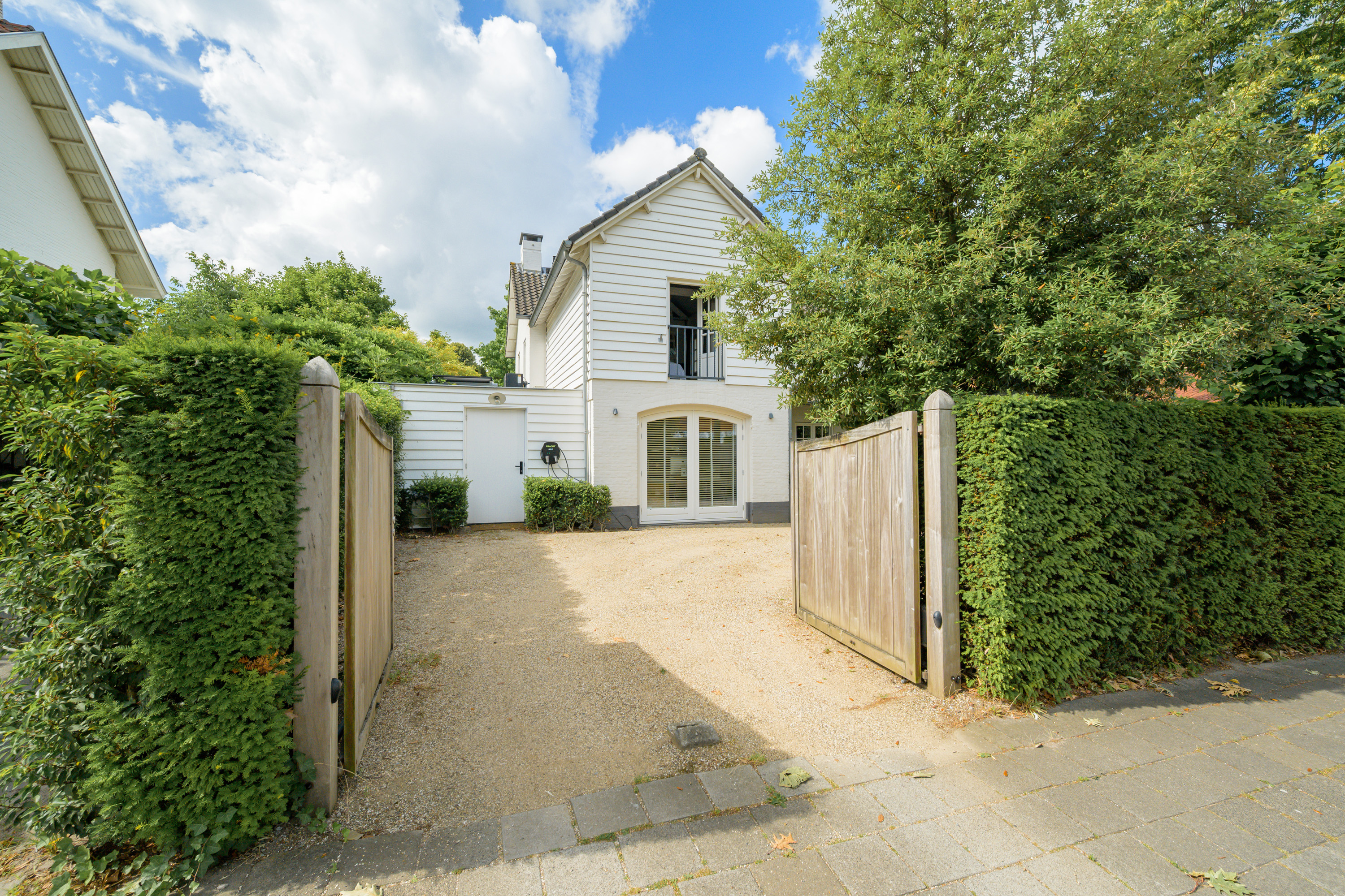 At the front, an electrically operated gate secures the driveway, providing parking for multiple cars.