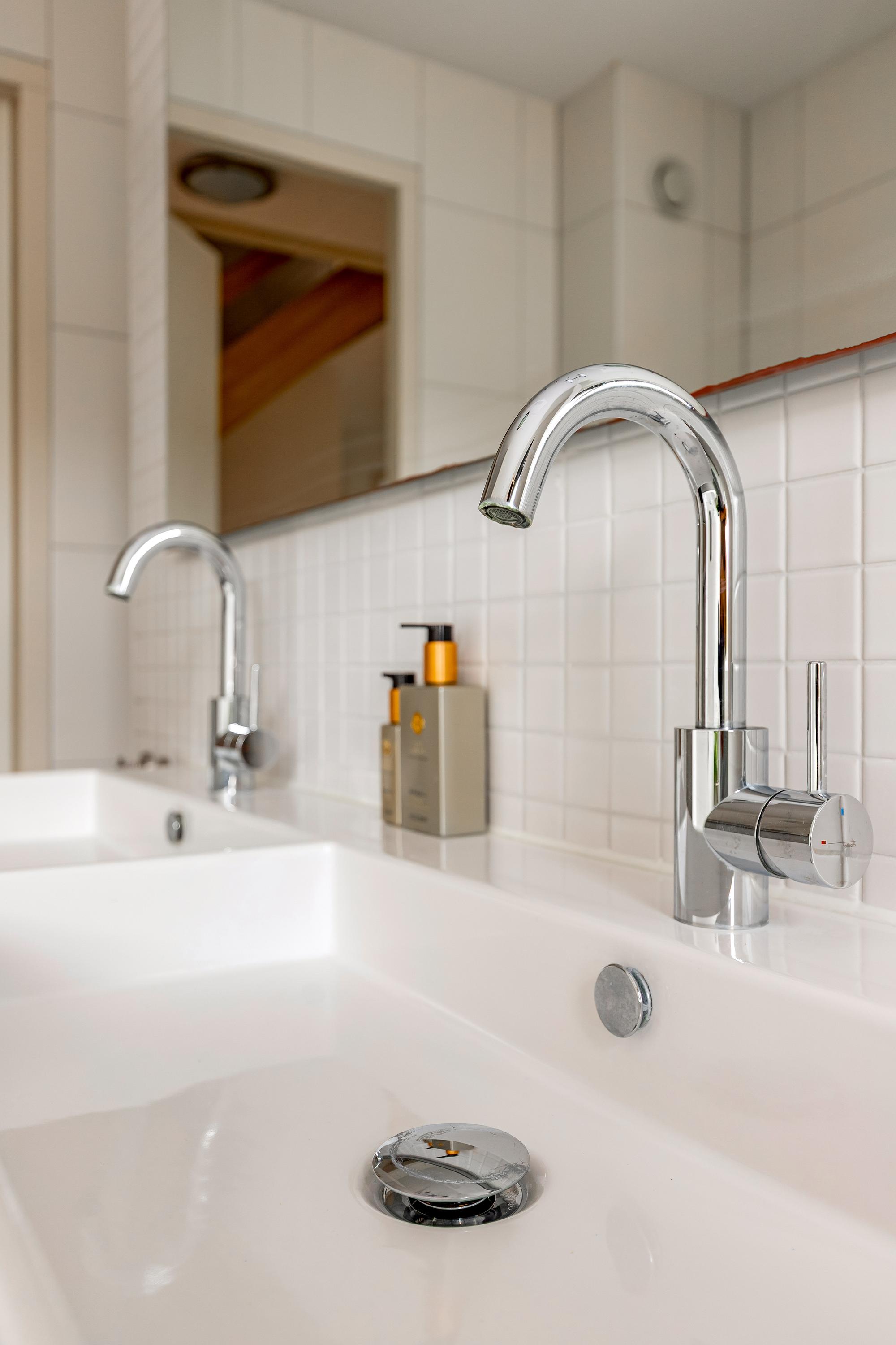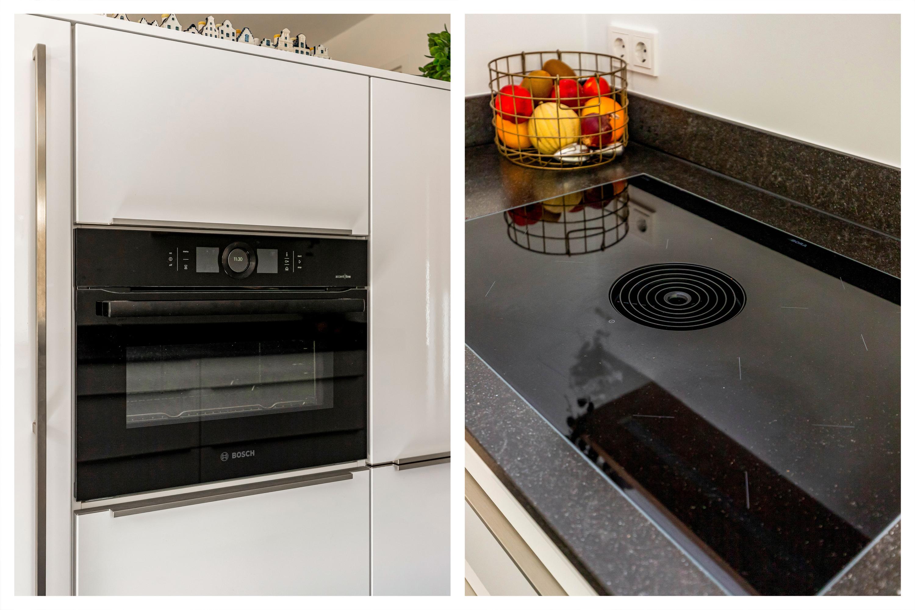 The spacious driveway (with room for several cars and an EV charging station) leads to a neat entrance hall with fuse box, guest toilet, staircase, and access to the living area. The generous, light-filled living room exudes luxury with its elegant herringbone floor, large windows, and two sets of double French doors opening onto the sunny backyard. The seamless connection between indoors and outdoors makes this the perfect place to relax or entertain.
