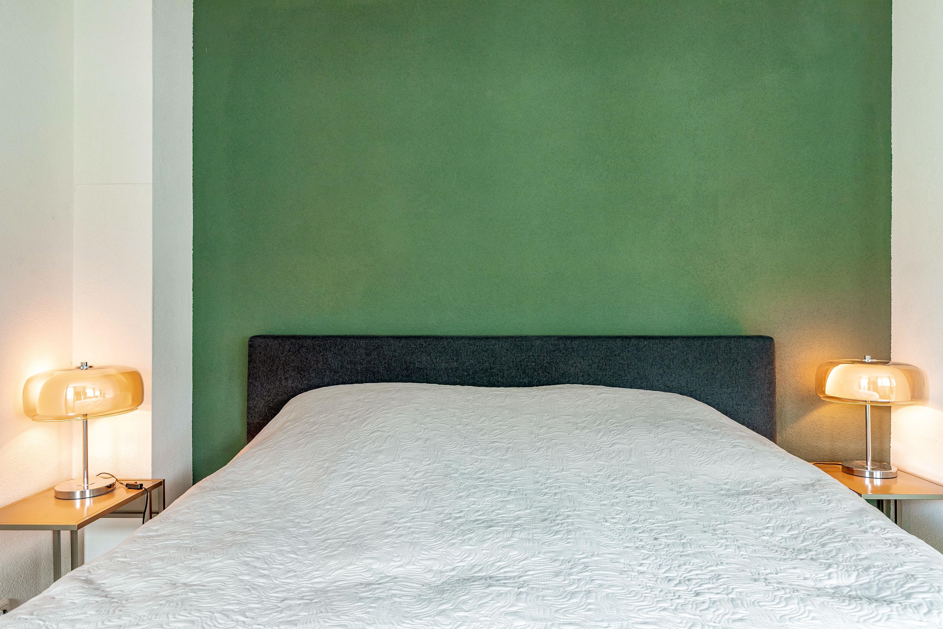 The semi-open kitchen is finished in a light, modern color scheme and fitted with high-quality built-in appliances, ample counter space, and practical cabinets. A custom wall unit stylishly separates the kitchen from the living room. Adjacent is the utility room, currently in use as a home office.