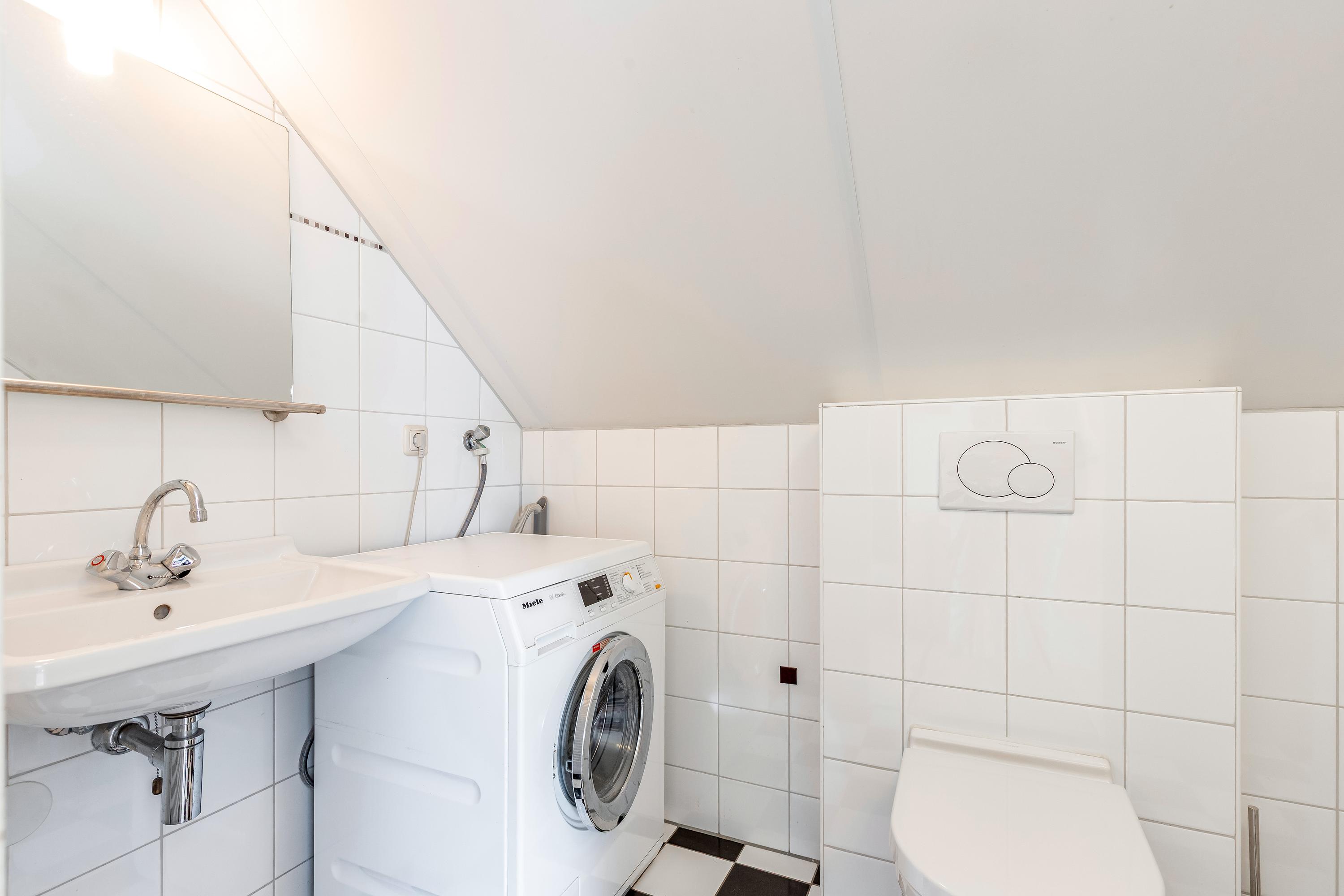 The attic level offers two further spacious bedrooms, both with roof windows for ample natural light. Here you’ll also find a second full bathroom with shower, washbasin, washing machine connection, and a third toilet, as well as a practical storage room housing the central heating system.
