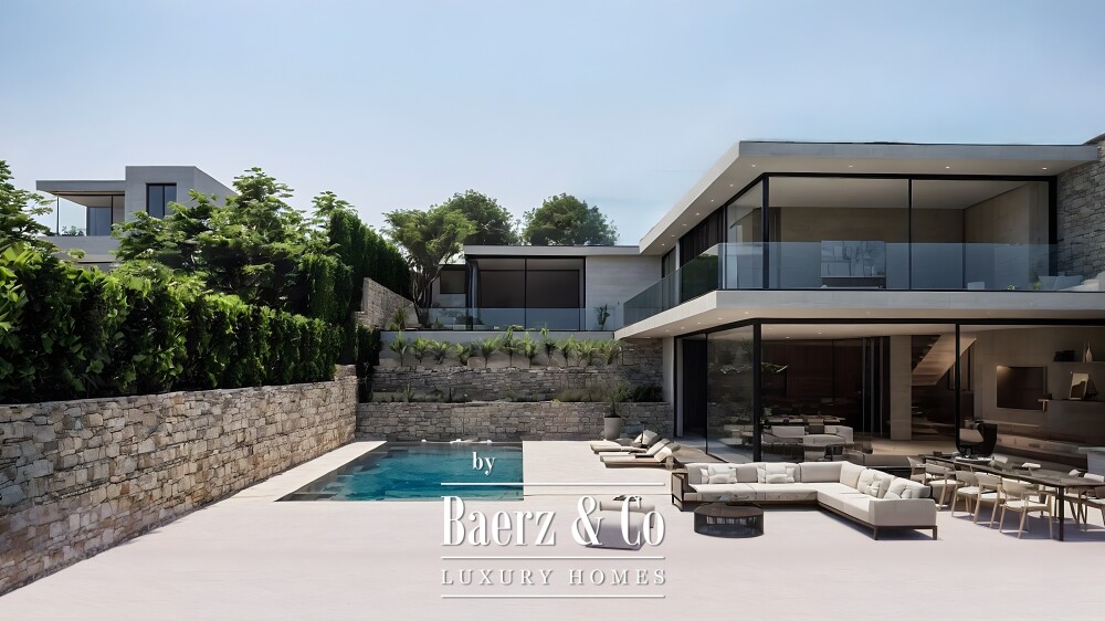Die Immobilie erstreckt sich über vier Ebenen. Die 120 m² große Garage bietet Platz für sechs Fahrzeuge; ein Technikraum und ein Aufzug verbinden sämtliche Stockwerke. Die Hauptetage empfängt Sie mit einem lichtdurchfluteten Wohn- und Essbereich mit Blick aufs Meer, einer modernen offenen Küche und einem nahtlosen Übergang zum weitläufigen Garten und Pool, die gleichermaßen zum entspannten Verweilen wie zu geselligen Zusammenkünften einladen. Eine Suite mit Ankleidezimmer und privatem Bad sowie ein separates Gäste-WC vervollständigen diese Ebene.