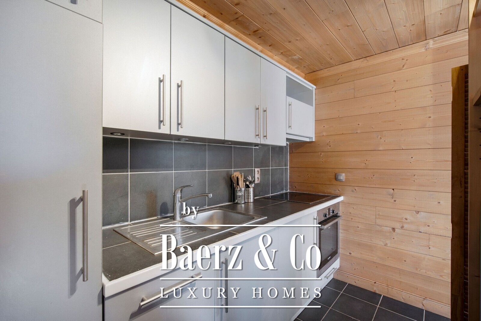 The apartment features a spacious, bright living room with an open-plan fitted kitchen, opening onto a south-facing balcony. Upstairs, you will find an en-suite bedroom, two mountain alcoves, a shower room, and a pleasant mezzanine area.