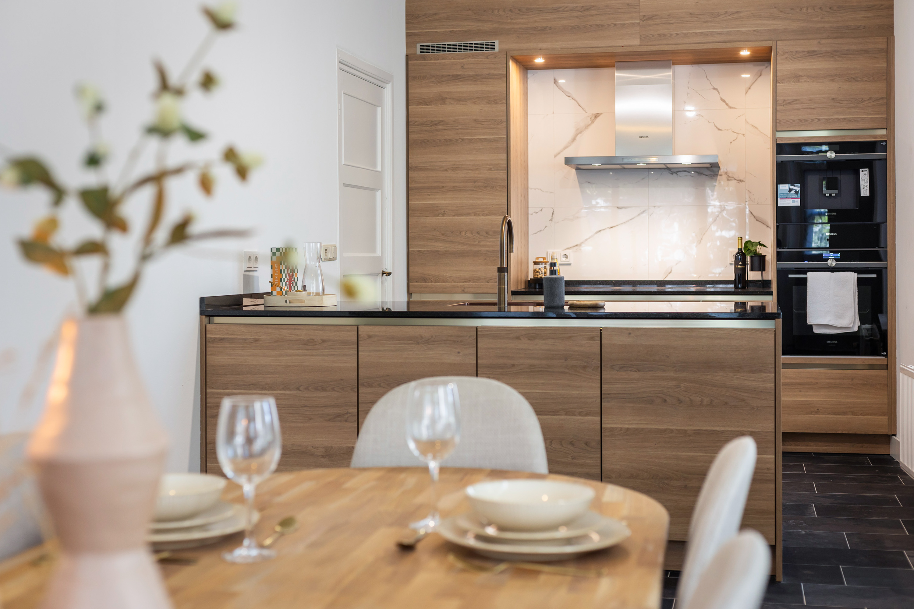Inside, the atmosphere is warm, stylish and surprisingly spacious. The double front doors open onto a generous hallway with cloakroom space, access to the cellar and a modern toilet. From here you can reach both the kitchen-diner and the en-suite living rooms.