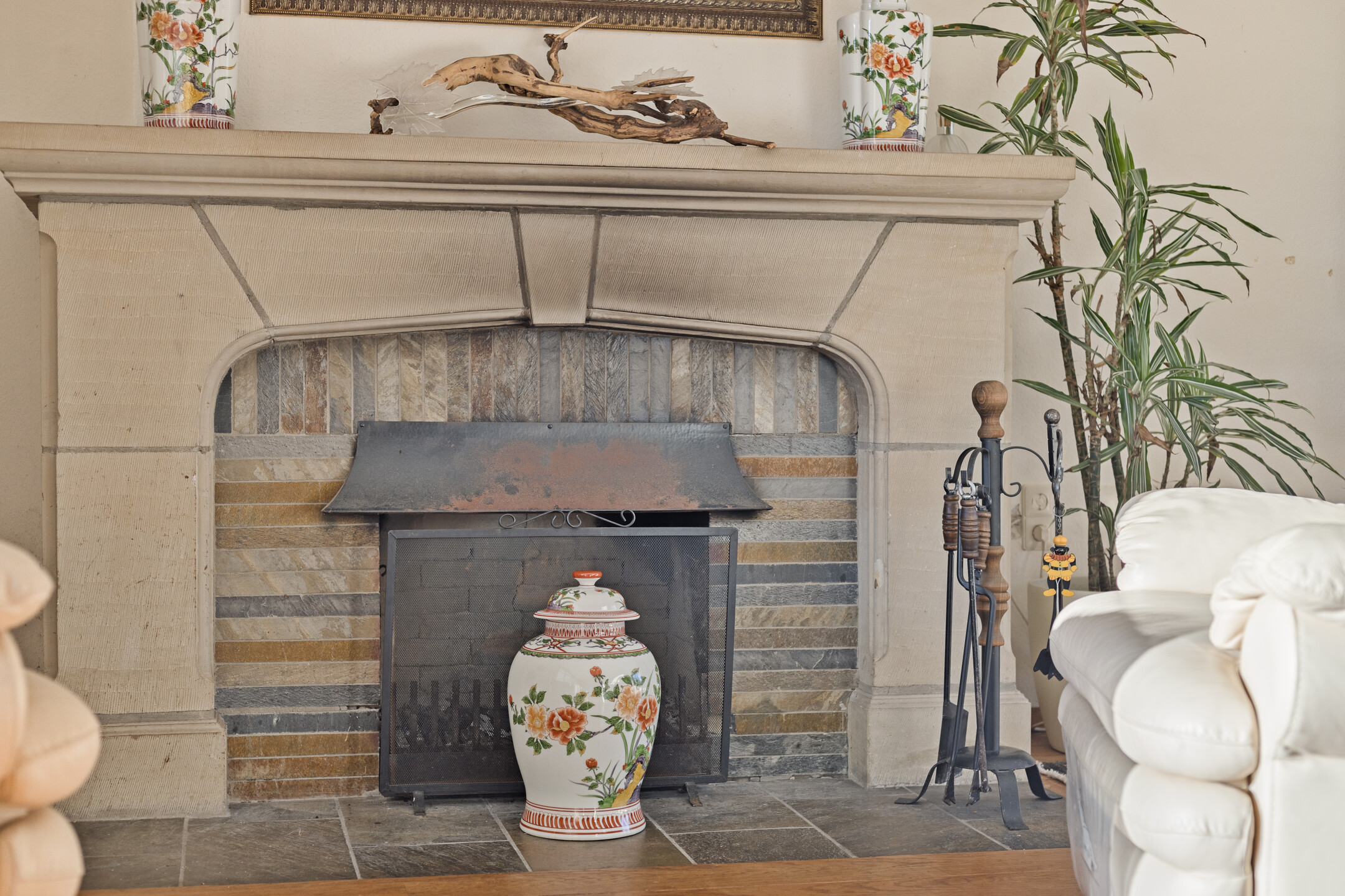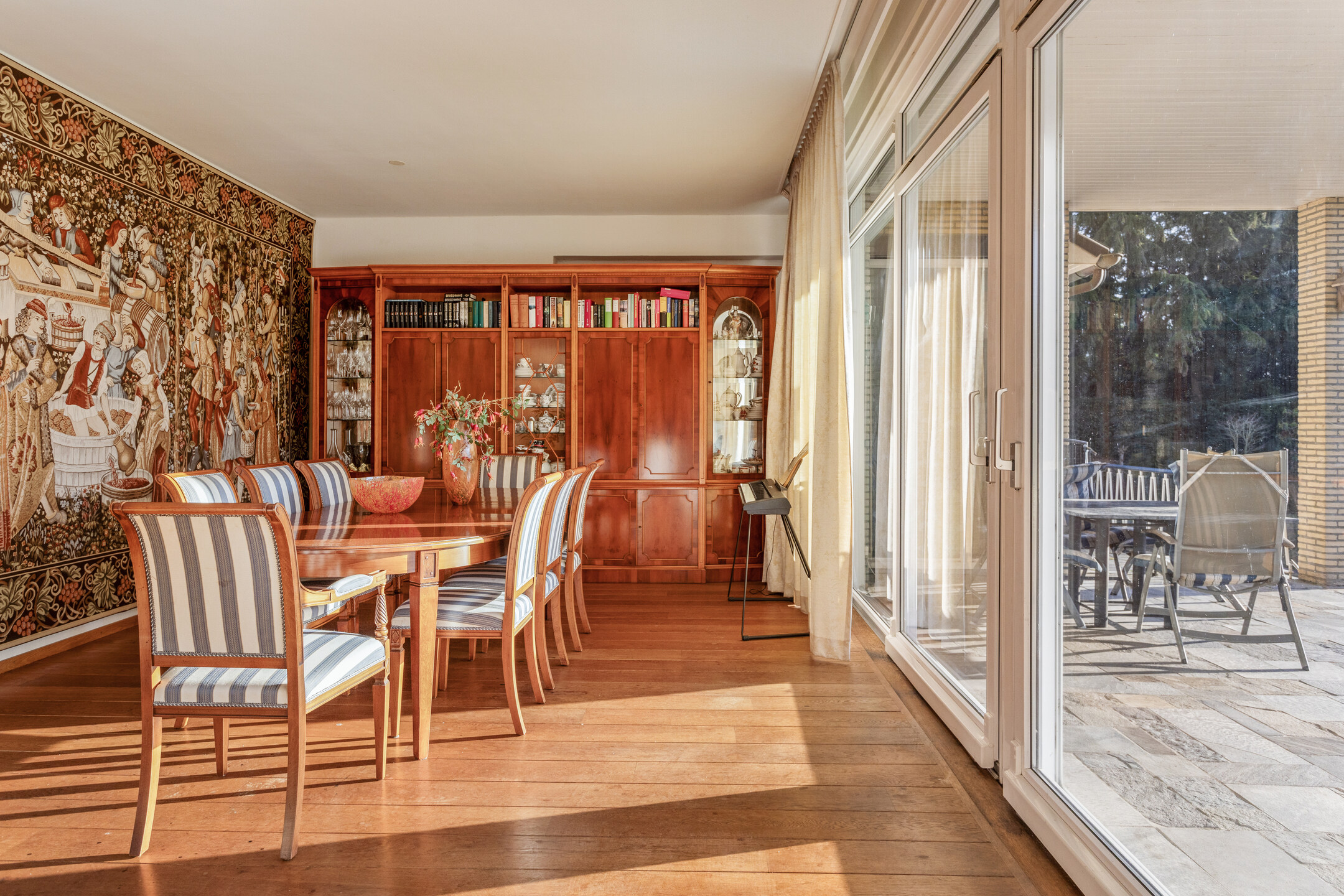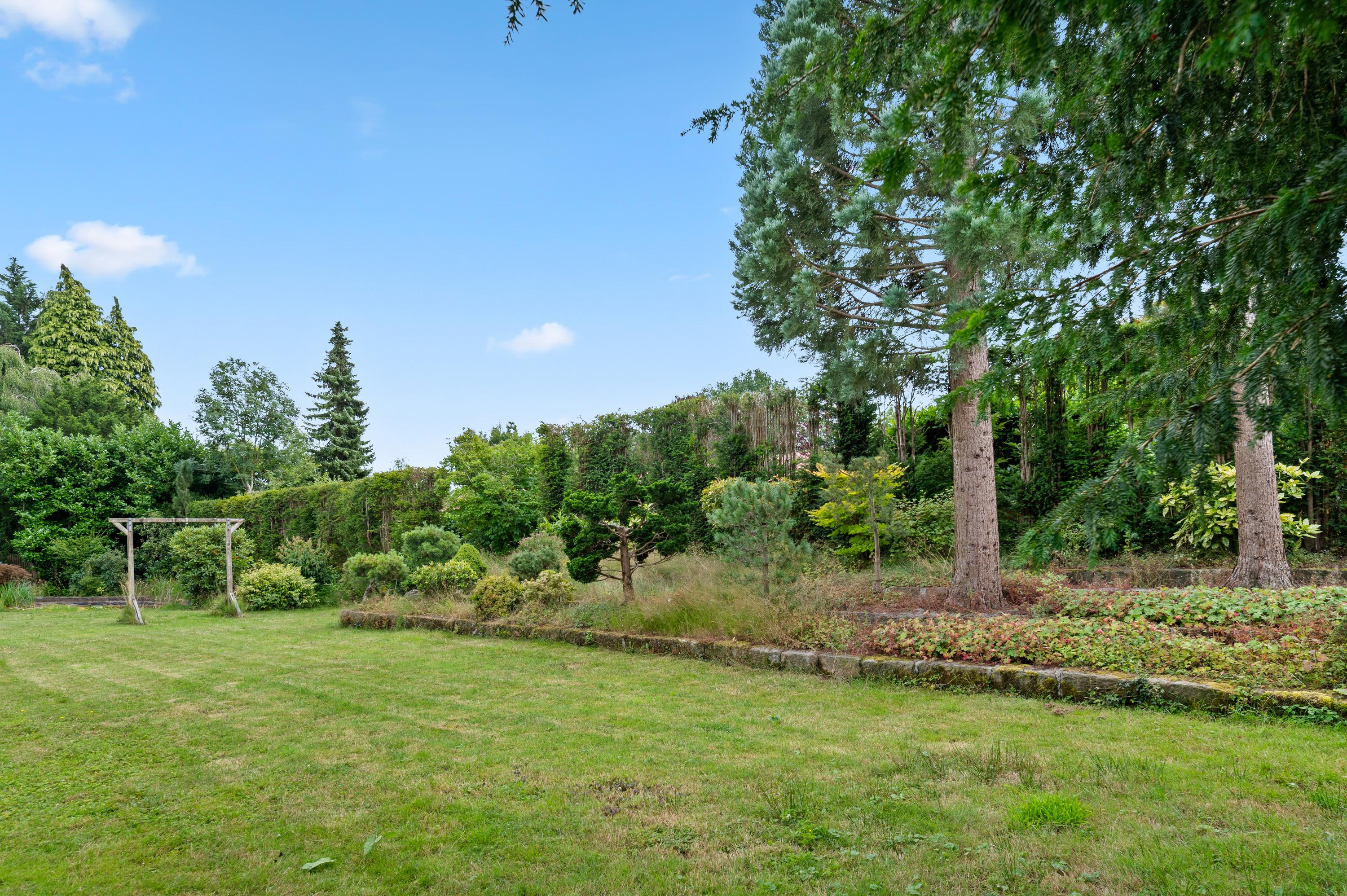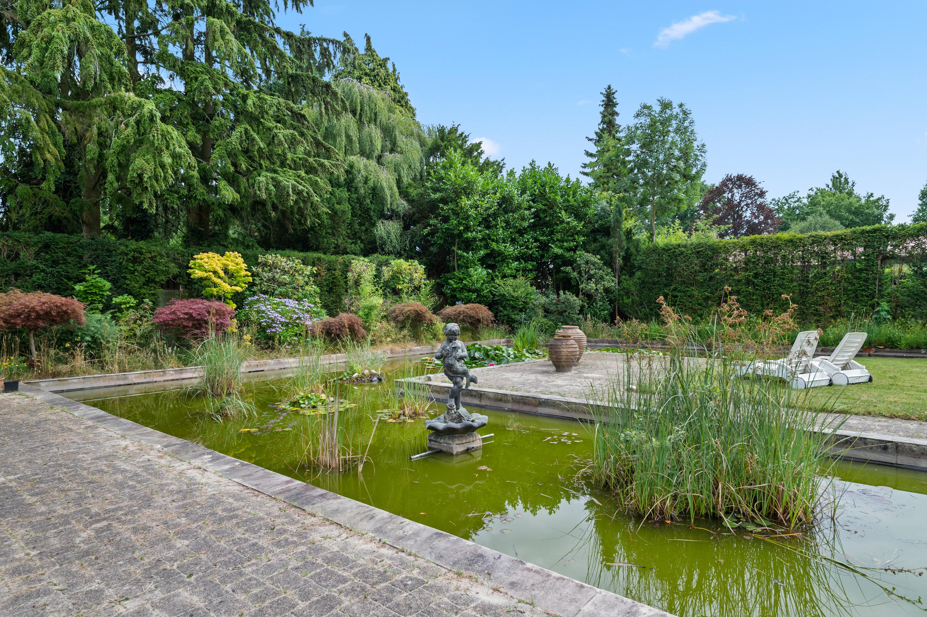Der großzügige Wohn- und Essbereich in L-Form verfügt über einen Kamin mit klassischem Kaminsims, der nahtlos in eine vollständig ausgestattete Küche übergeht. Die Schlafsuiten sind direkt mit dem angelegten Garten verbunden, in dem eine überdachte Terrasse und ein Teich zum Verweilen einladen. Im Untergeschoss befinden sich Schlafzimmer, ein Bad, ein Weinkeller und Hauswirtschaftsräume; die geräumige Garage ist rückseitig zugänglich. Die Zimmer im Obergeschoss bieten weiteres Potenzial für Schlafräume oder individuelle Rückzugsorte.