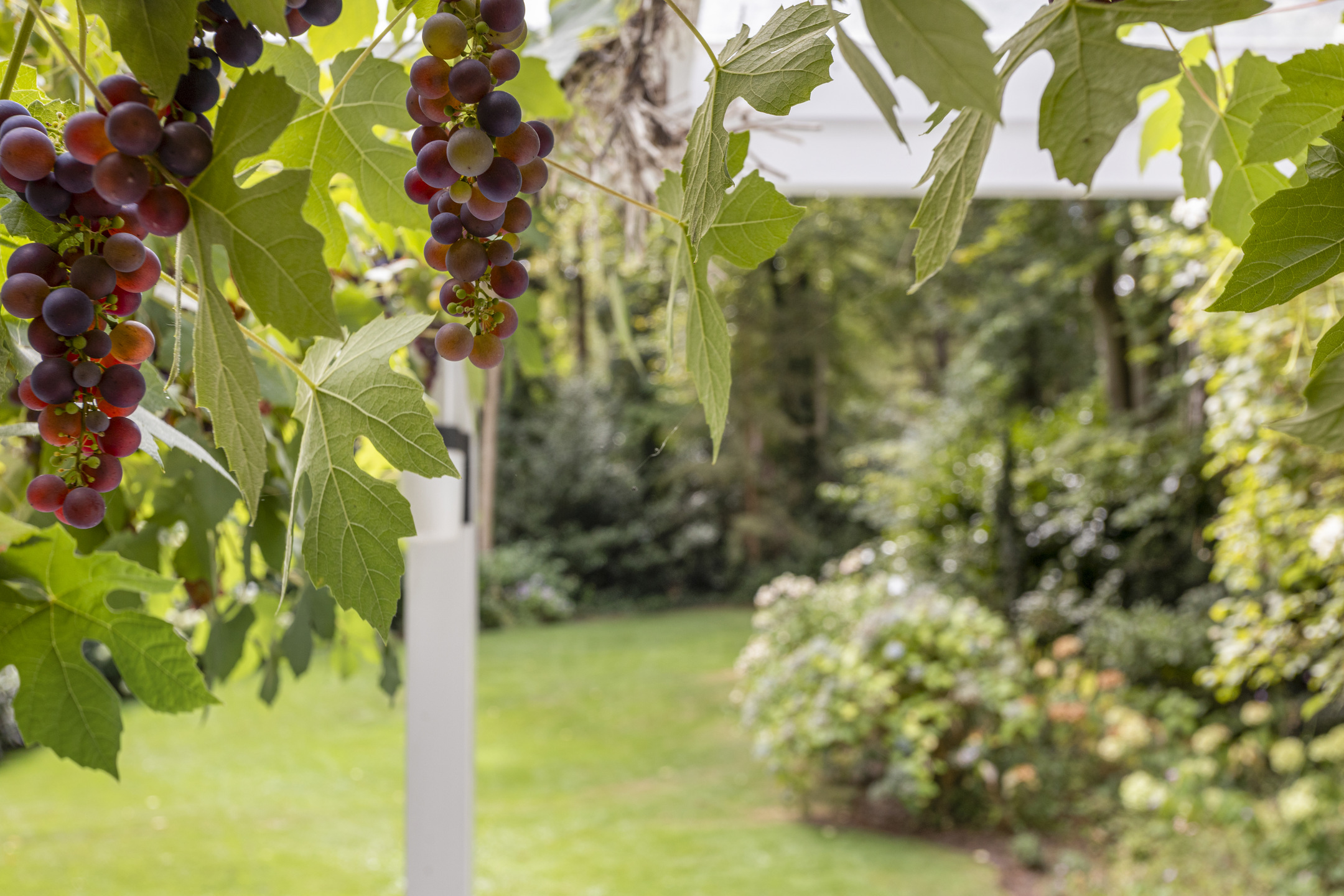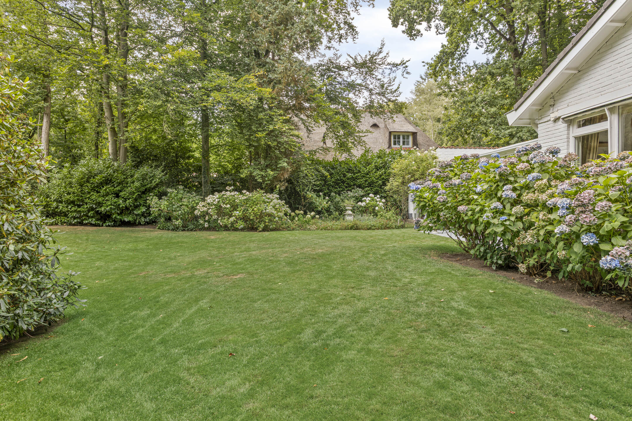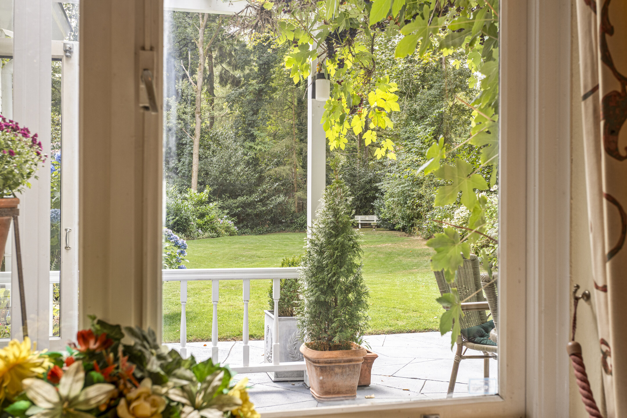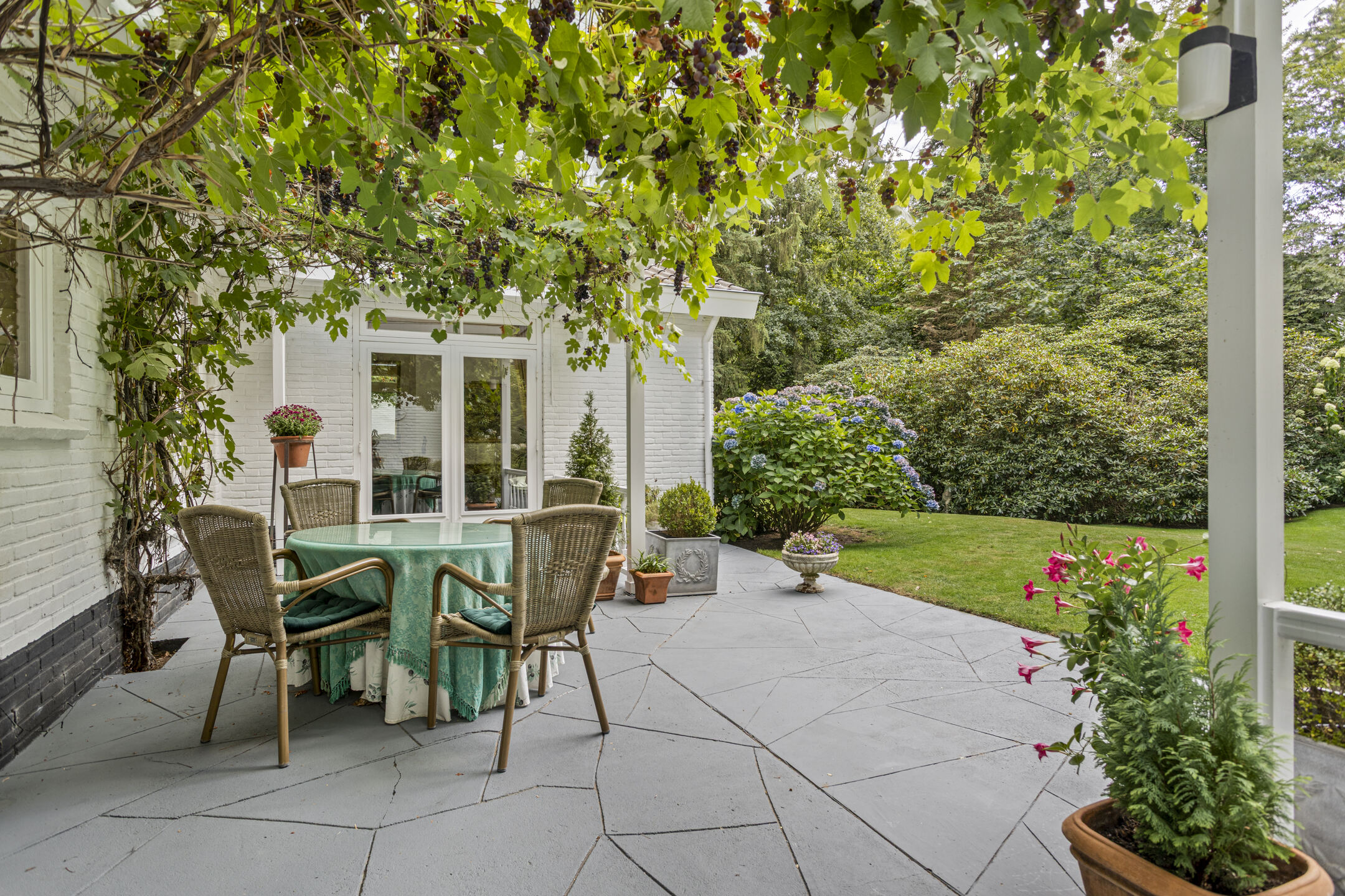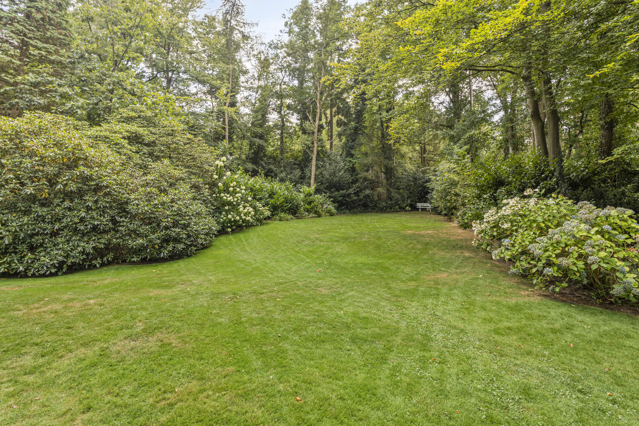 Het huis ligt iets verhoogd ten opzichte van haar omgeving en wordt omgeven door een diepe, landschappelijk aangelegde parktuin, met rododendrons en oude beuken, eiken en Douglas-sparren, die als wachters rondom staan. Op de veranda groeit een grote blauwe druif die zich met haar bladerdak en dikke druiventrossen als een natuurlijke parasol uitstrekt boven het terras. Deze perfect onderhouden tuin, gaat moeiteloos op in de bosrand, die de percelen als een groene ketting met elkaar verbindt.