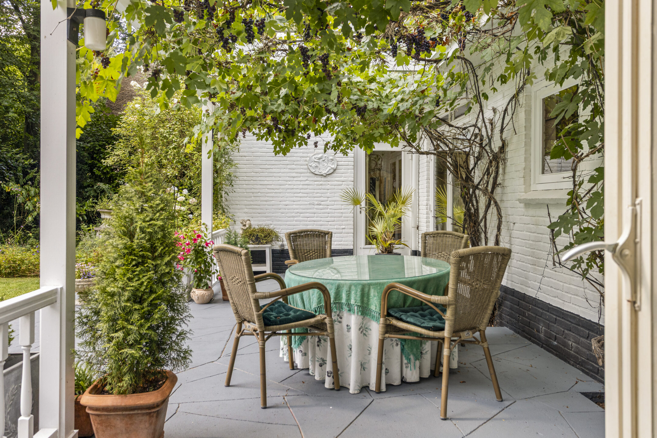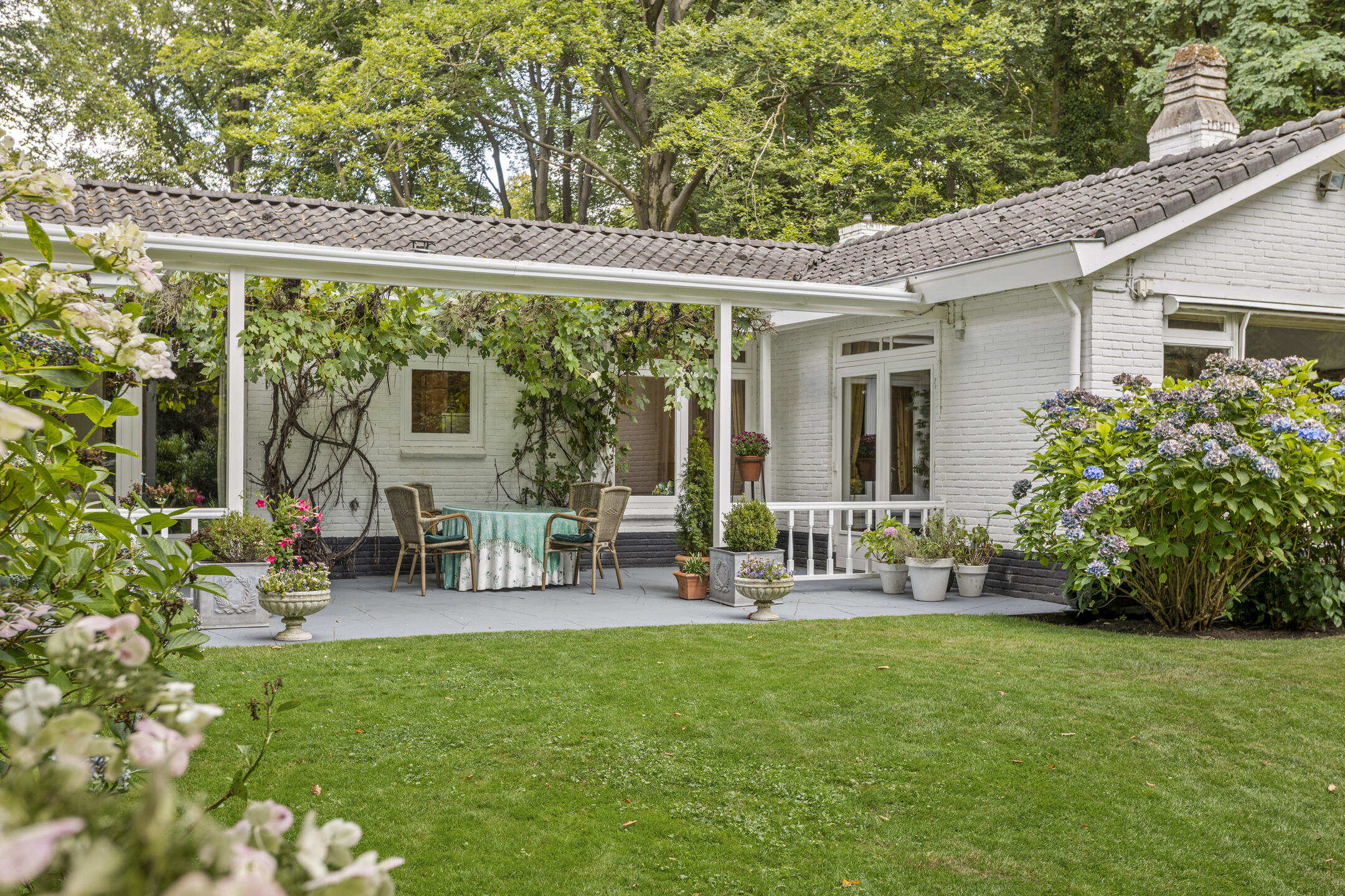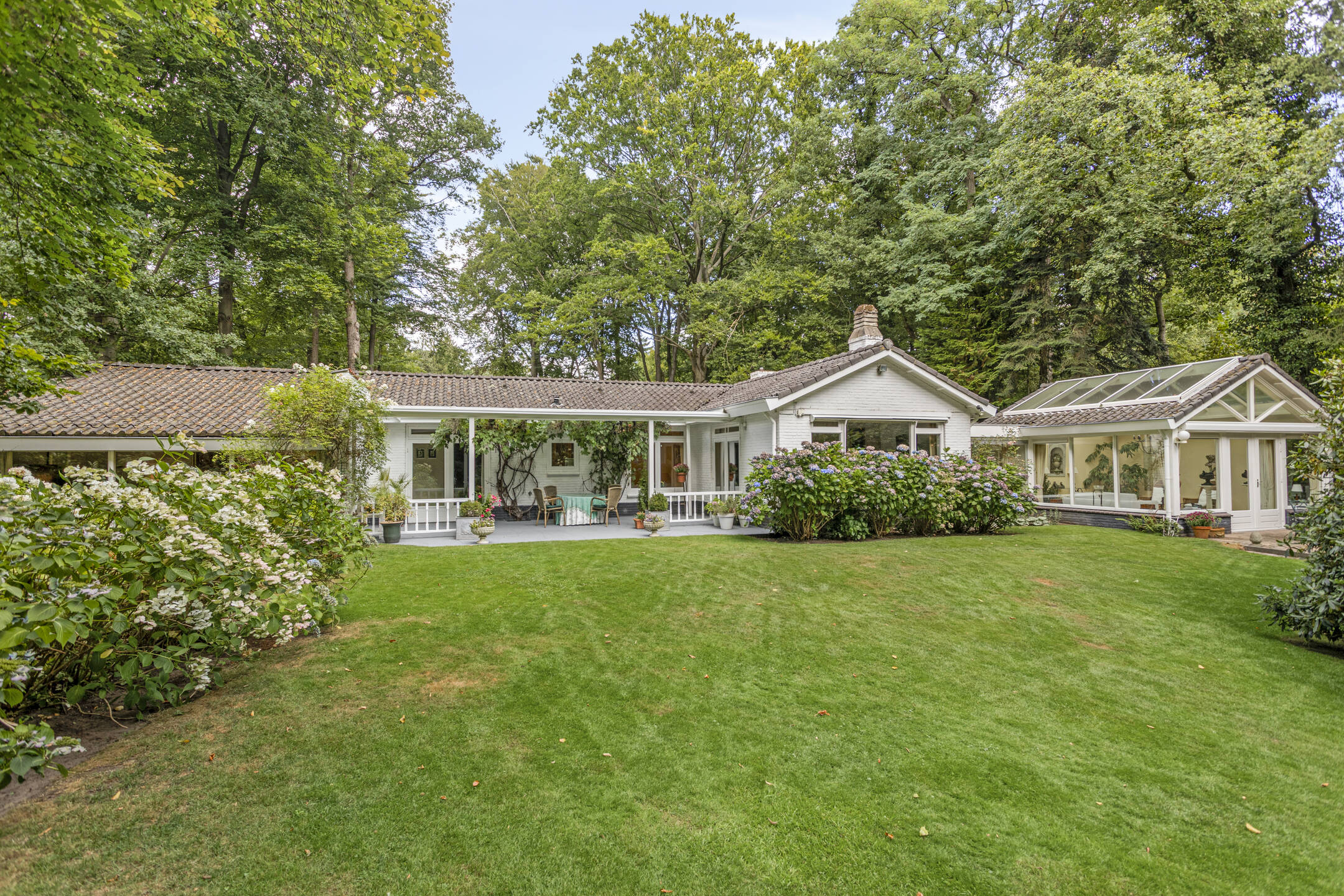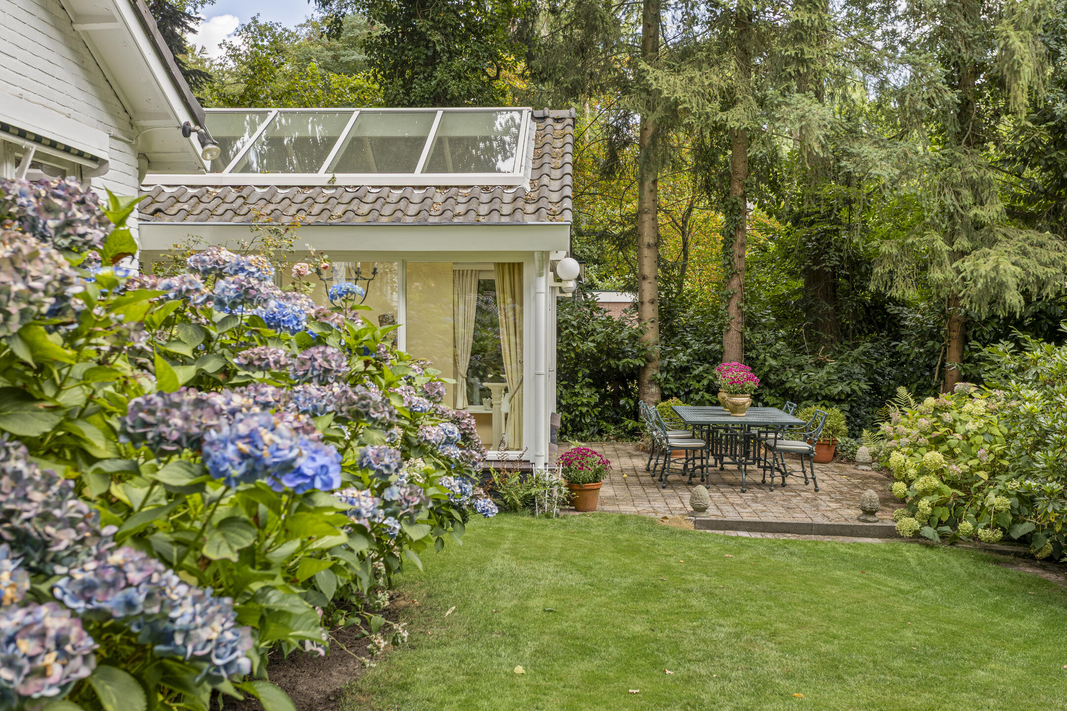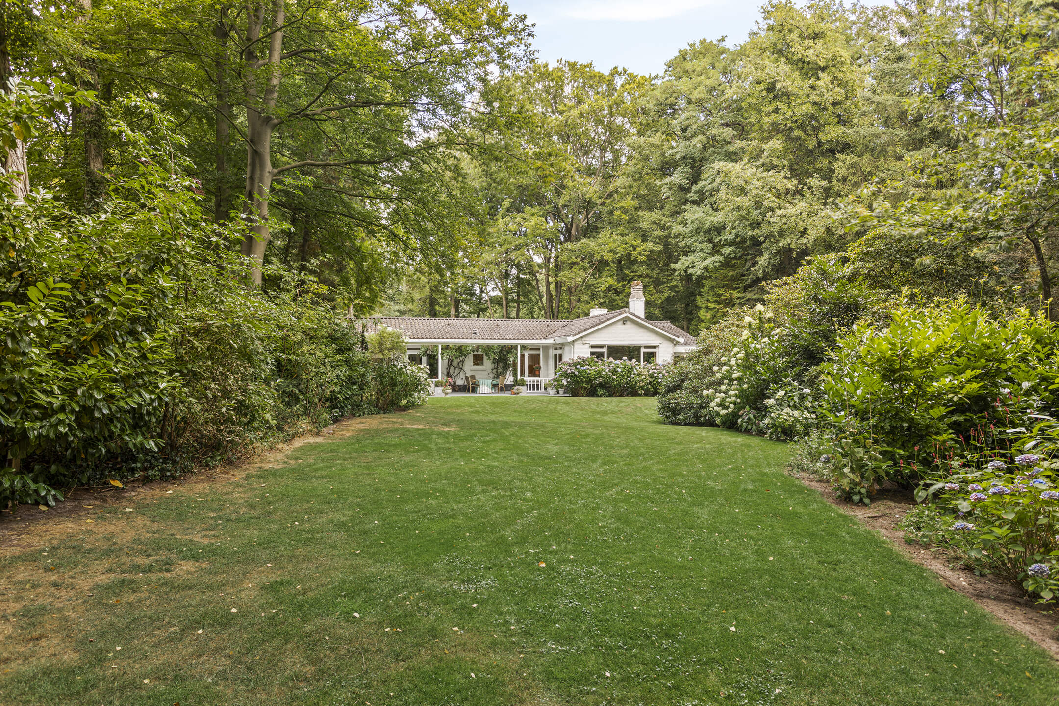 Het huis ligt iets verhoogd ten opzichte van haar omgeving en wordt omgeven door een diepe, landschappelijk aangelegde parktuin, met rododendrons en oude beuken, eiken en Douglas-sparren, die als wachters rondom staan. Op de veranda groeit een grote blauwe druif die zich met haar bladerdak en dikke druiventrossen als een natuurlijke parasol uitstrekt boven het terras. Deze perfect onderhouden tuin, gaat moeiteloos op in de bosrand, die de percelen als een groene ketting met elkaar verbindt.