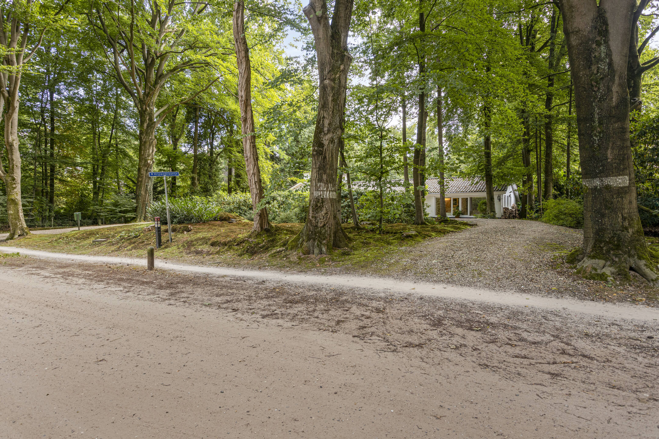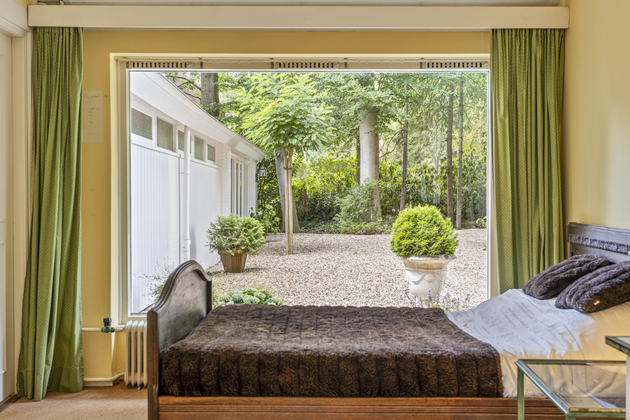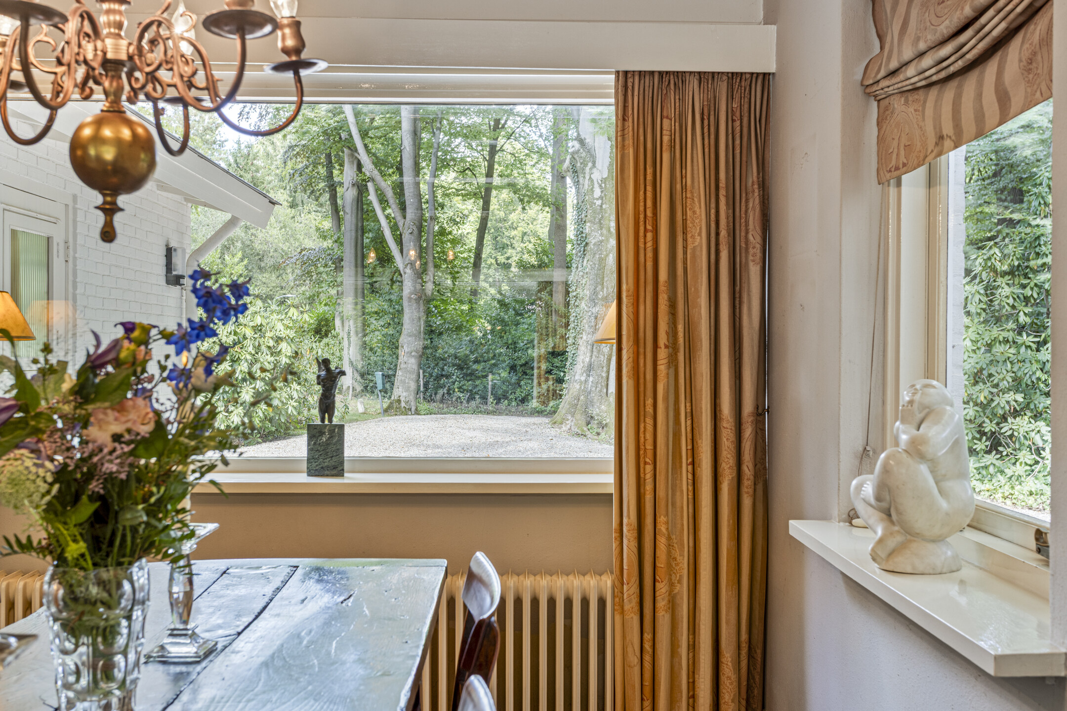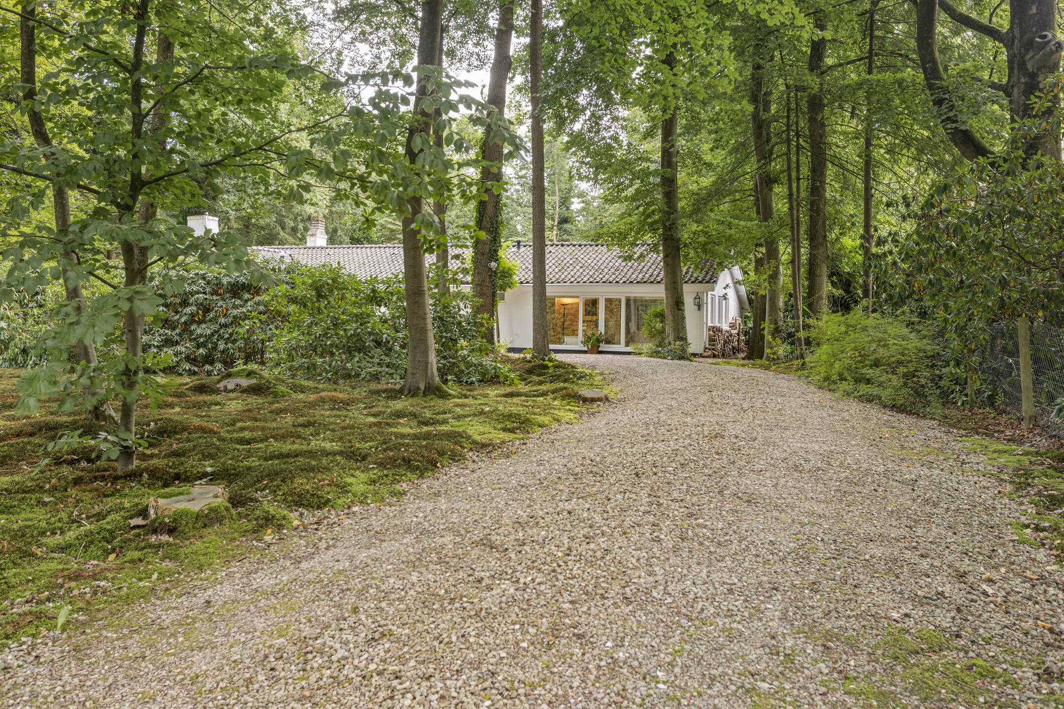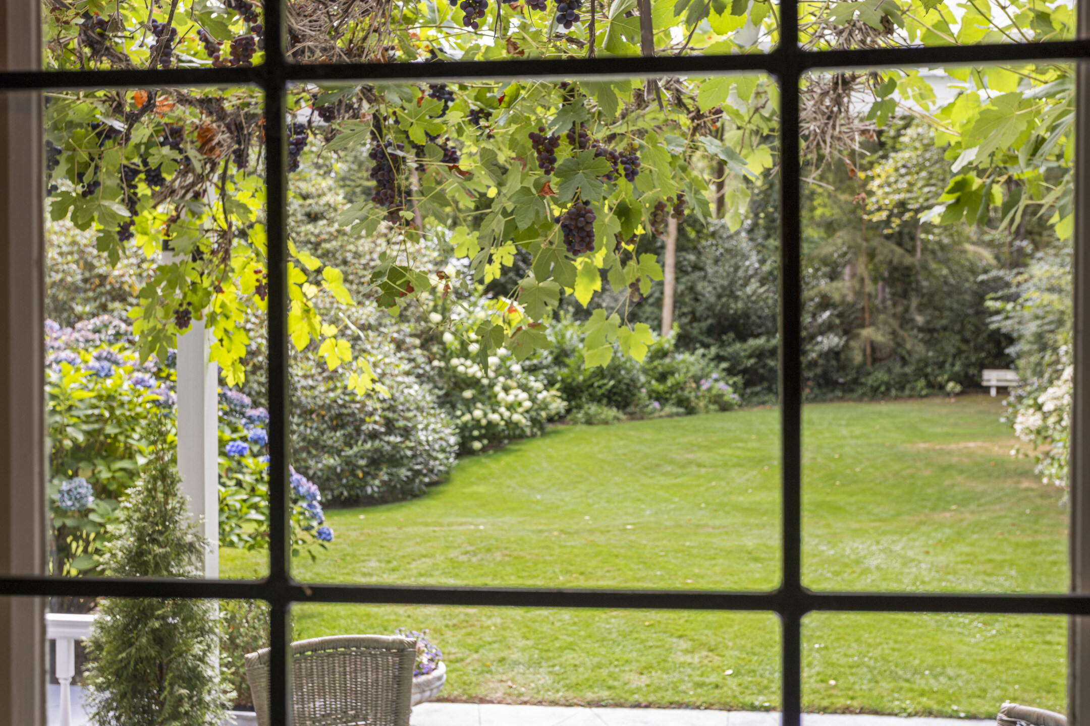 Het huis ligt iets verhoogd ten opzichte van haar omgeving en wordt omgeven door een diepe, landschappelijk aangelegde parktuin, met rododendrons en oude beuken, eiken en Douglas-sparren, die als wachters rondom staan. Op de veranda groeit een grote blauwe druif die zich met haar bladerdak en dikke druiventrossen als een natuurlijke parasol uitstrekt boven het terras. Deze perfect onderhouden tuin, gaat moeiteloos op in de bosrand, die de percelen als een groene ketting met elkaar verbindt.