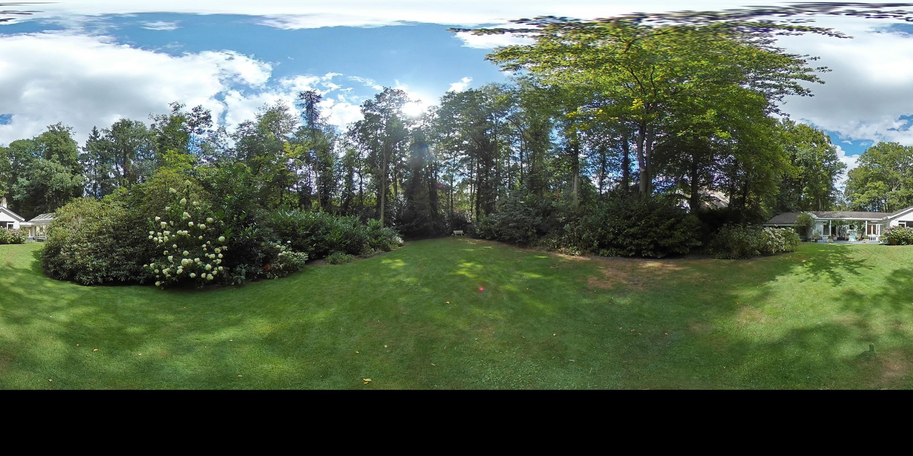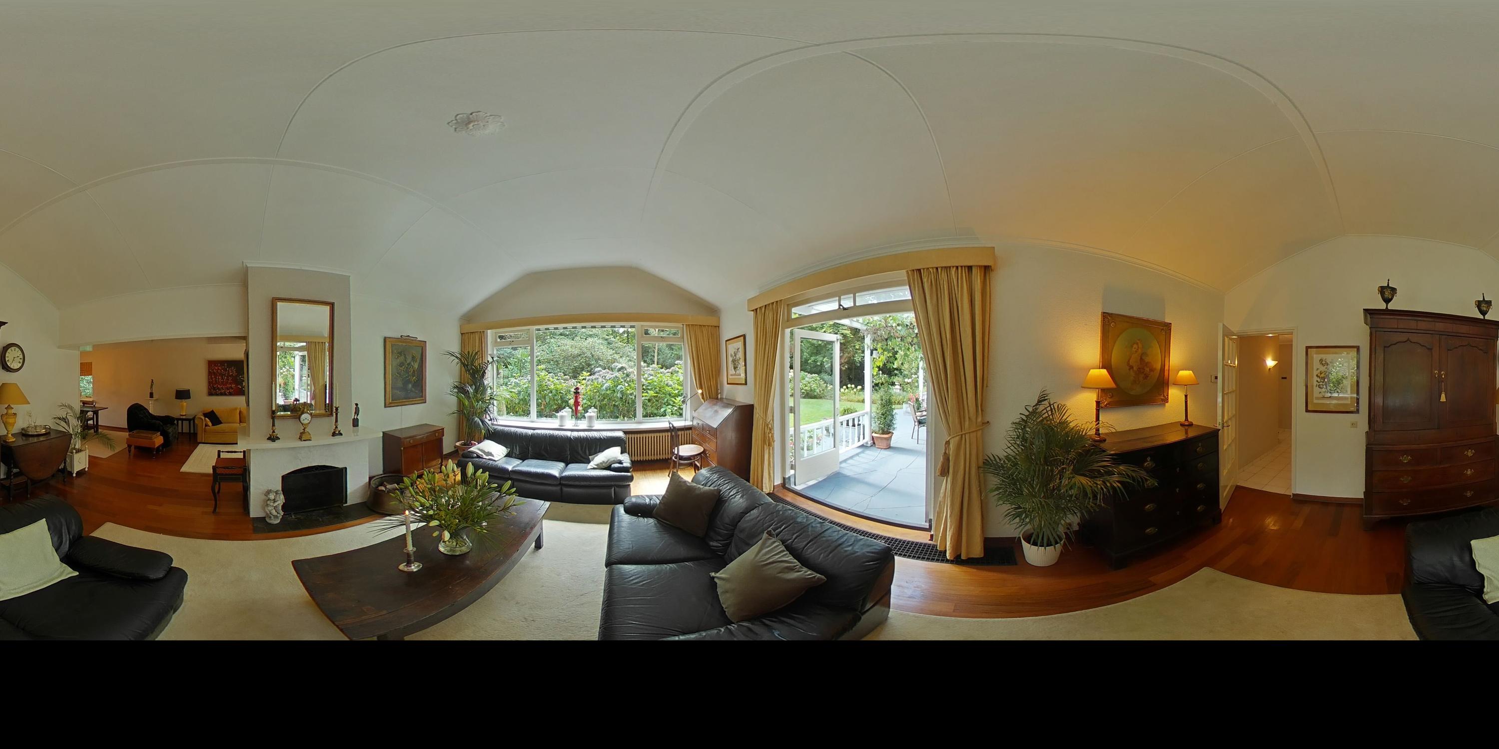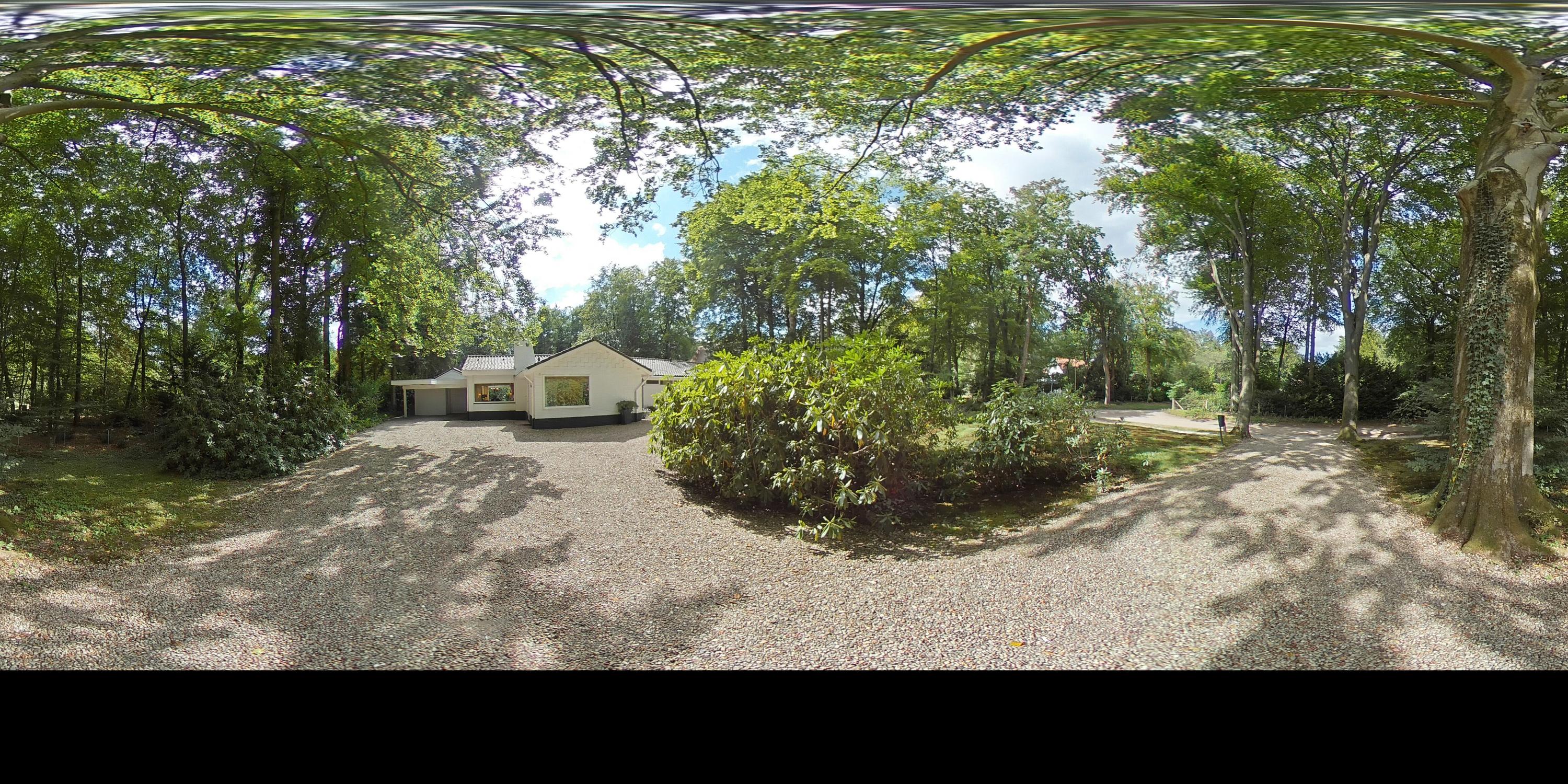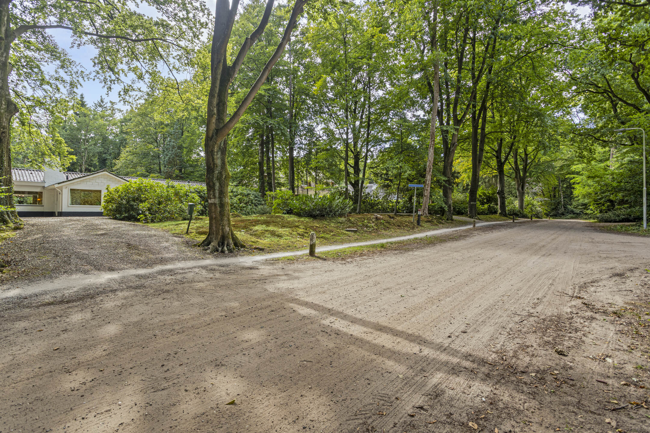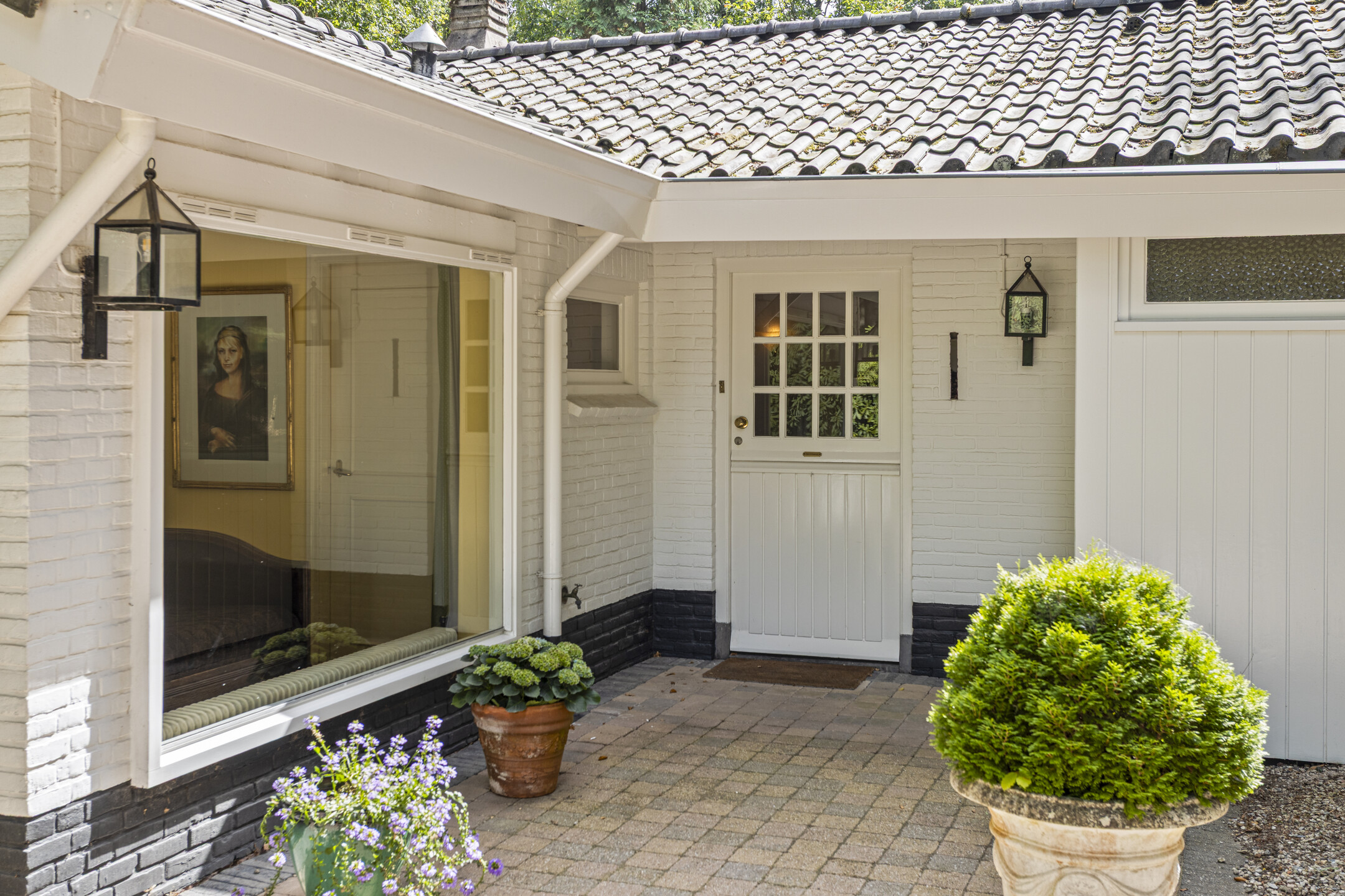 Het huis ligt iets verhoogd ten opzichte van haar omgeving en wordt omgeven door een diepe, landschappelijk aangelegde parktuin, met rododendrons en oude beuken, eiken en Douglas-sparren, die als wachters rondom staan. Op de veranda groeit een grote blauwe druif die zich met haar bladerdak en dikke druiventrossen als een natuurlijke parasol uitstrekt boven het terras. Deze perfect onderhouden tuin, gaat moeiteloos op in de bosrand, die de percelen als een groene ketting met elkaar verbindt.