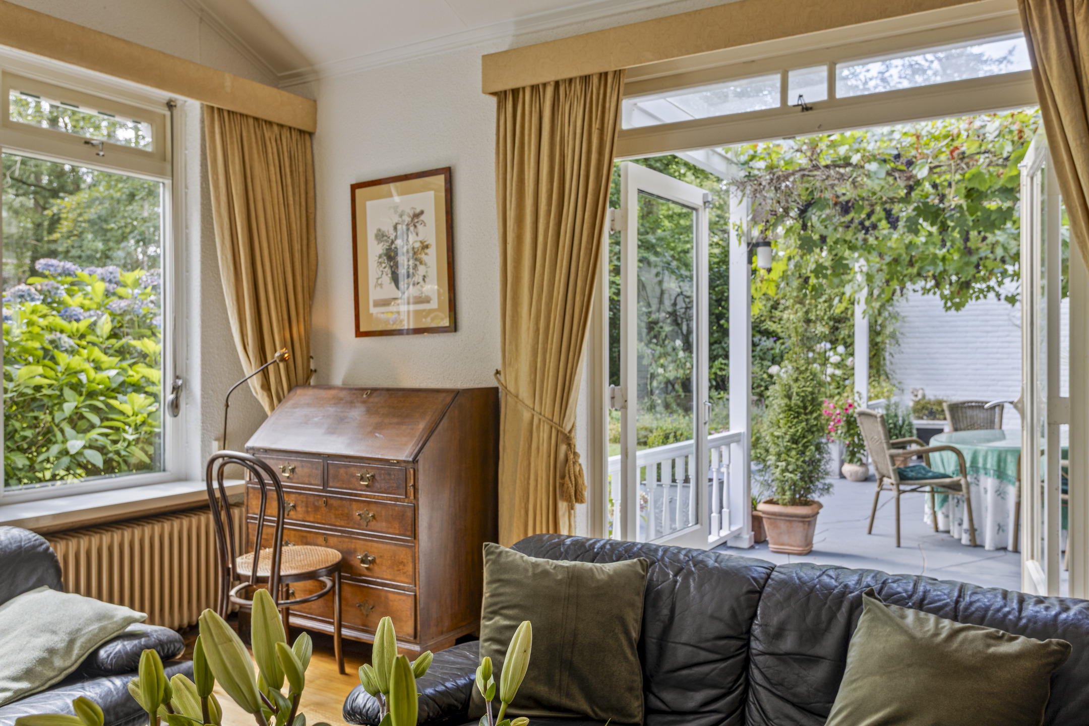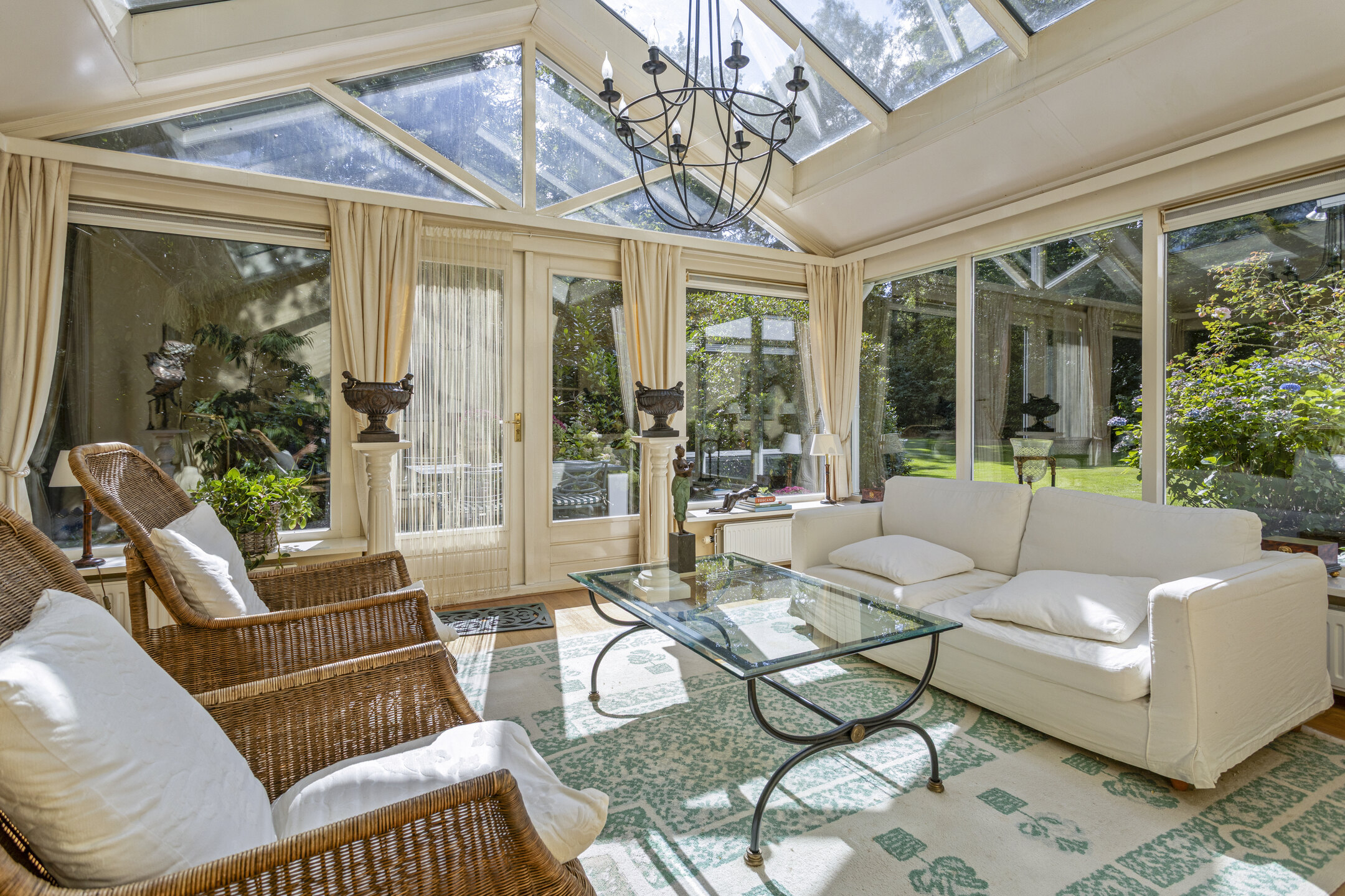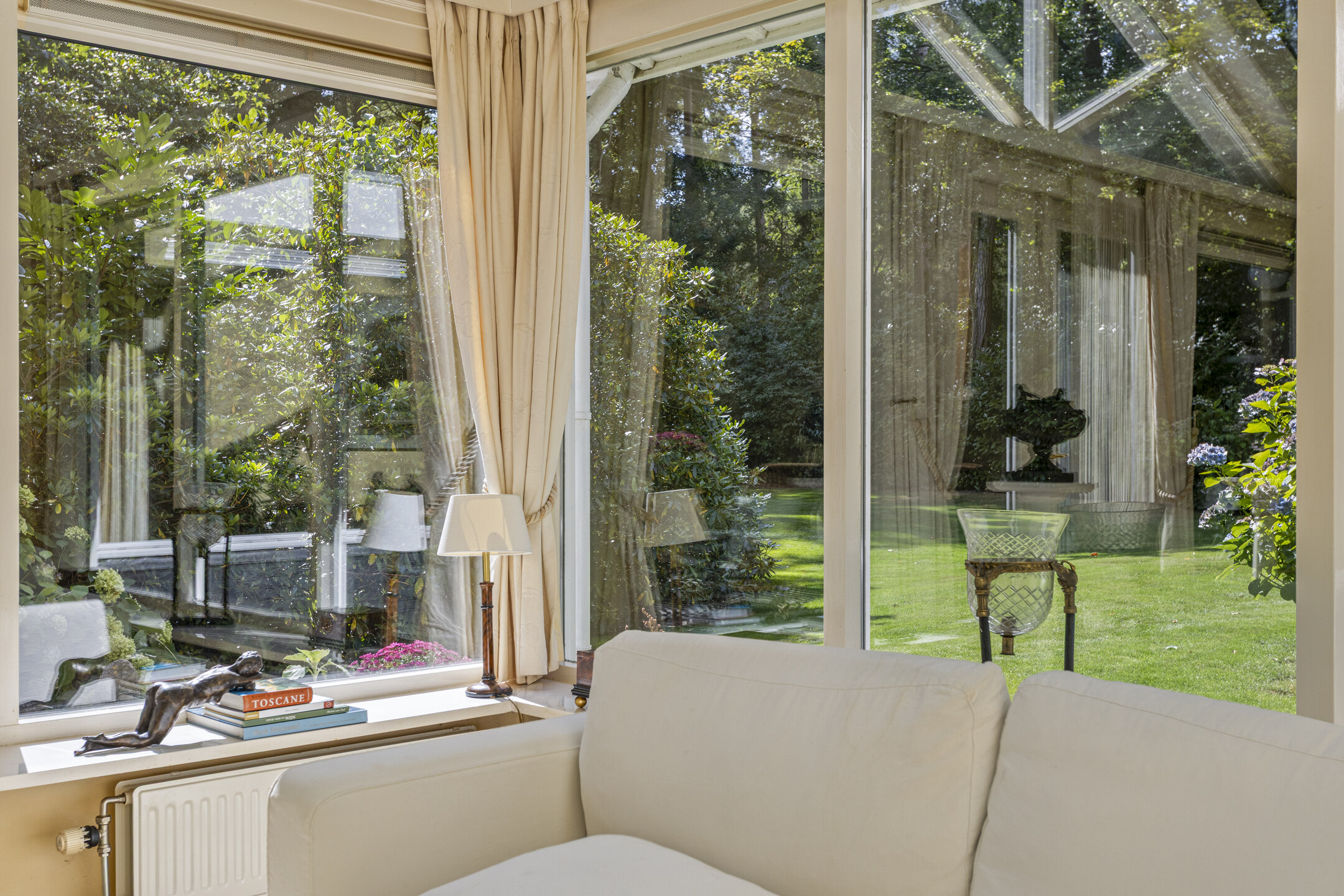 De elegante tuinkamer verbindt woonkamer met de serre, maar is een heerlijke zitruimte op zich, met uiteraard het prachtige uitzicht. De houtvloer contrasteert fraai met de frisse witte wanden.