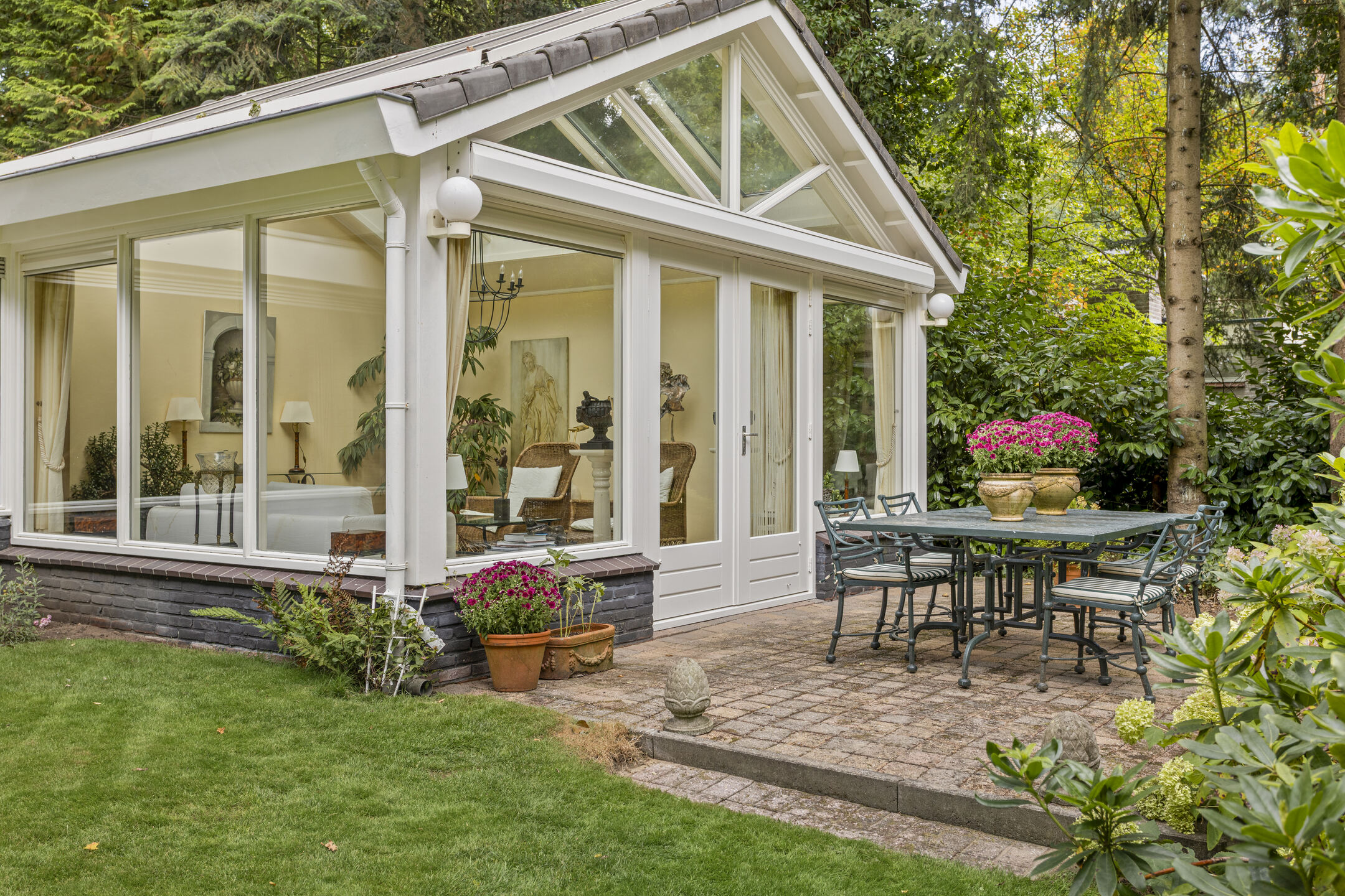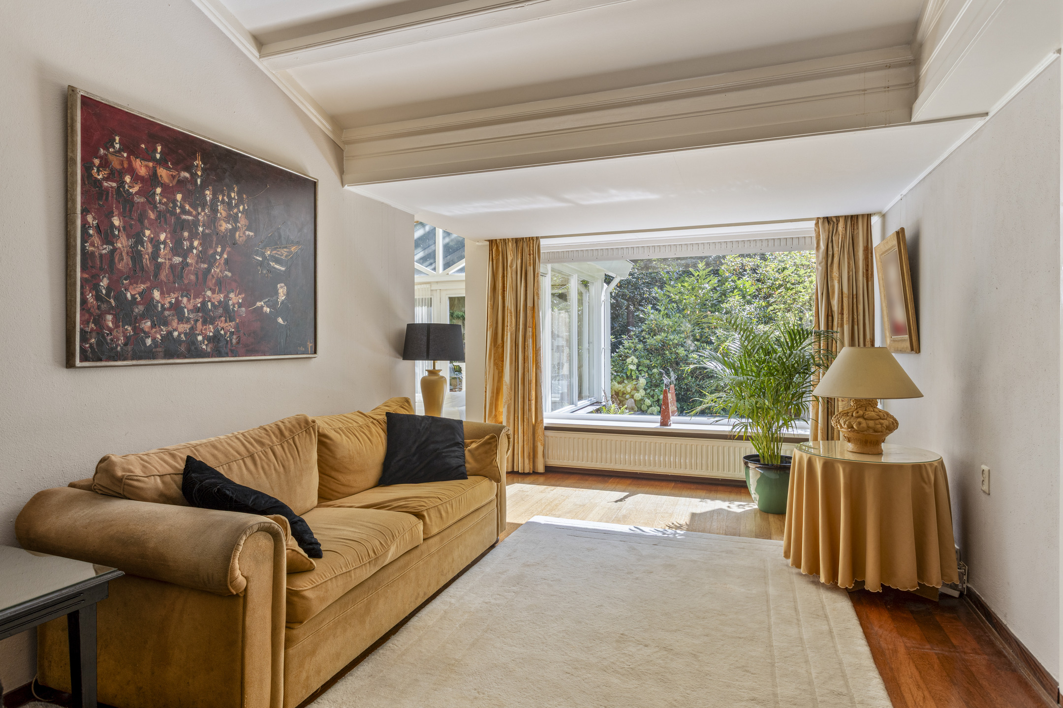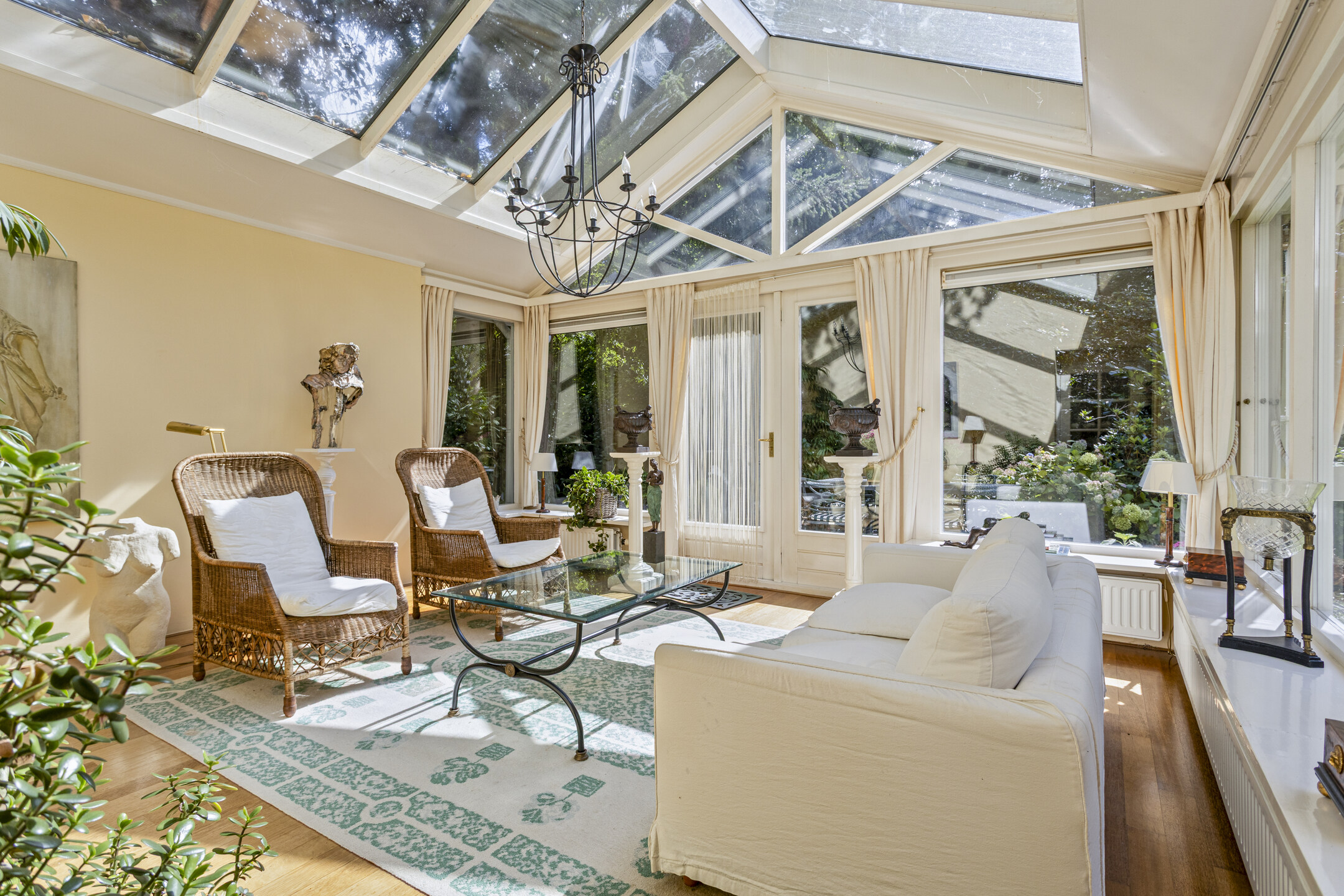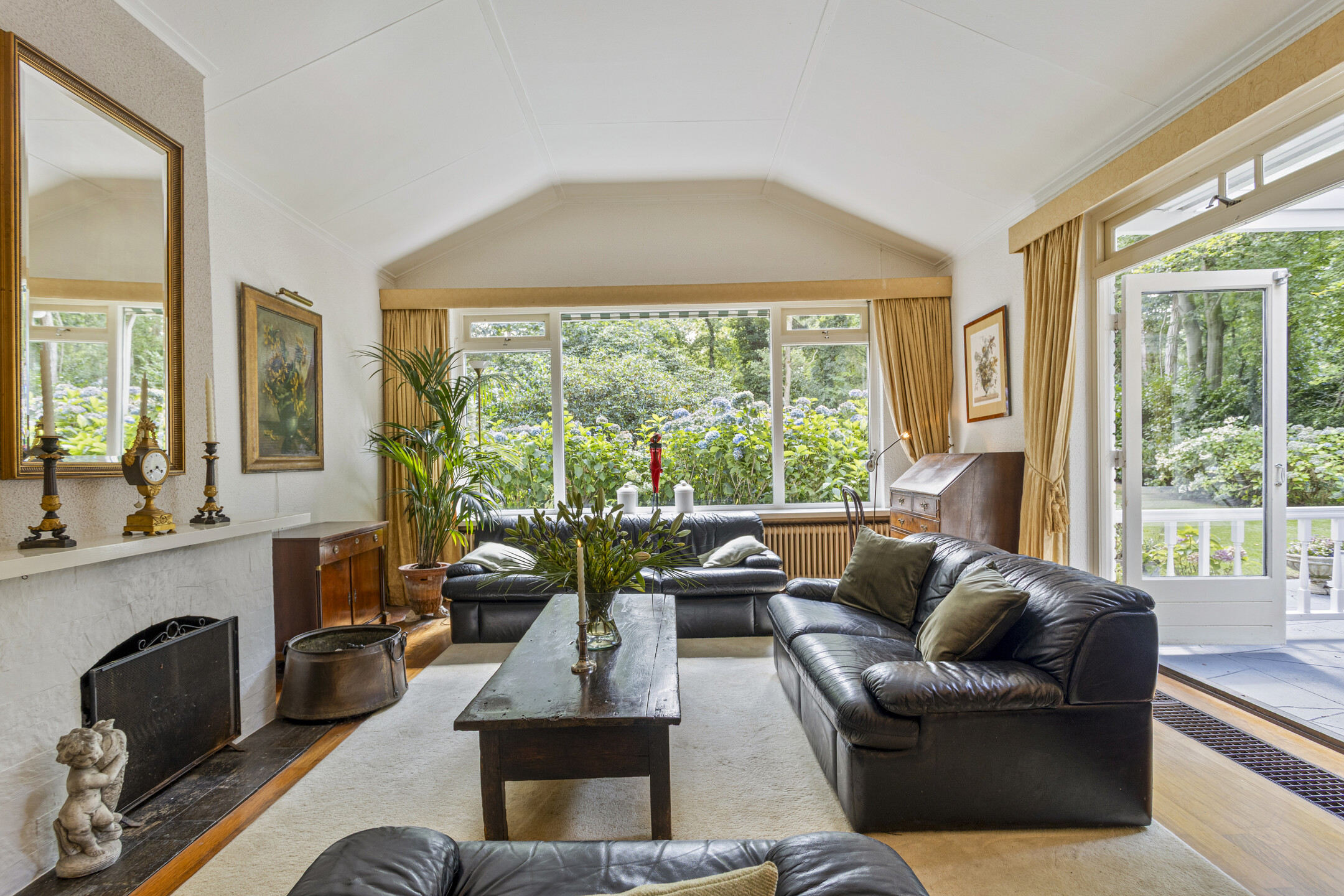De elegante tuinkamer verbindt woonkamer met de serre, maar is een heerlijke zitruimte op zich, met uiteraard het prachtige uitzicht. De houtvloer contrasteert fraai met de frisse witte wanden.