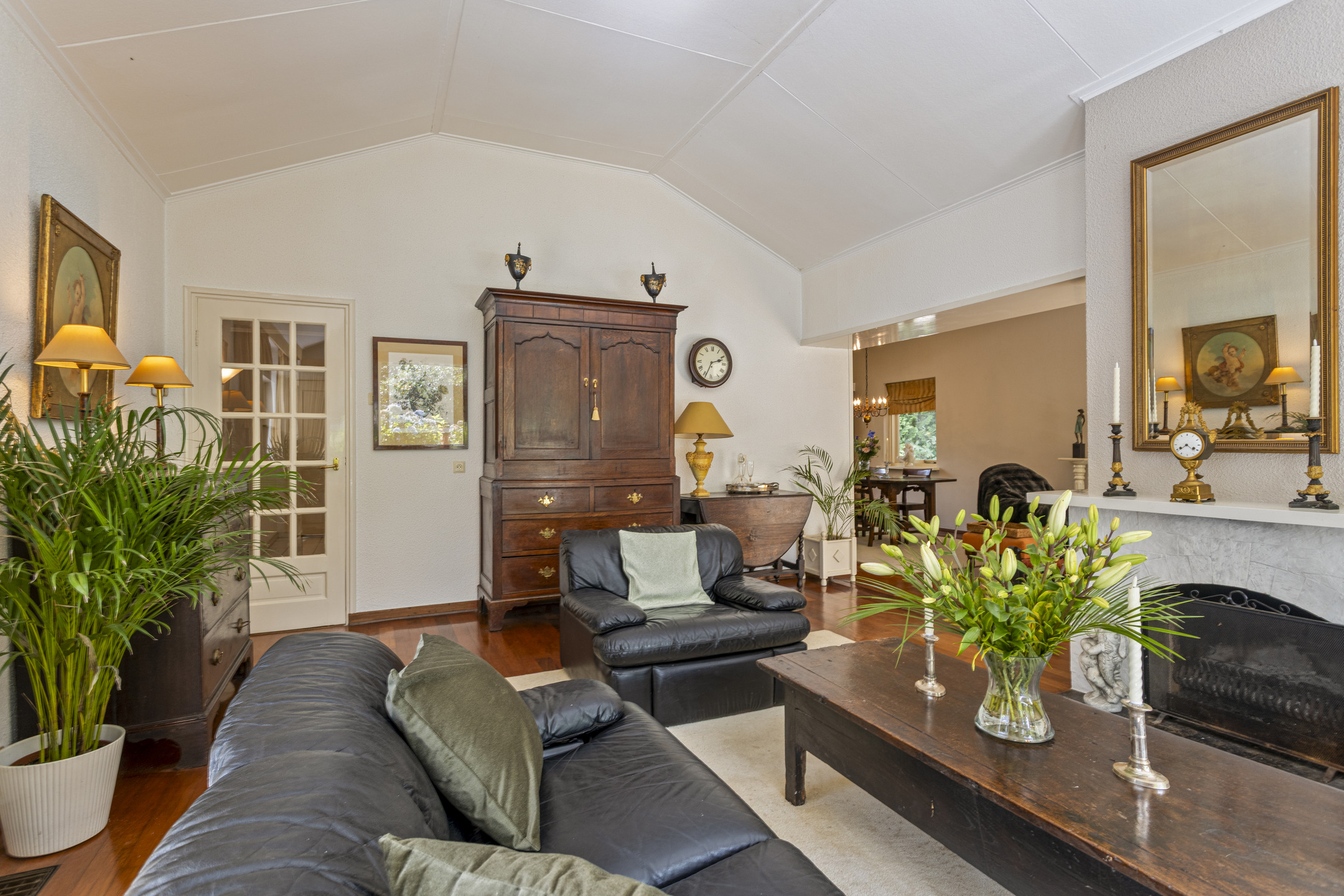 In de naastgelegen woonkamer is de gezellige openhaard en openslaande deuren naar het terras op de veranda. De vensters bieden een subliem uitzicht op de majestueuze hortensia’s en de tuin.