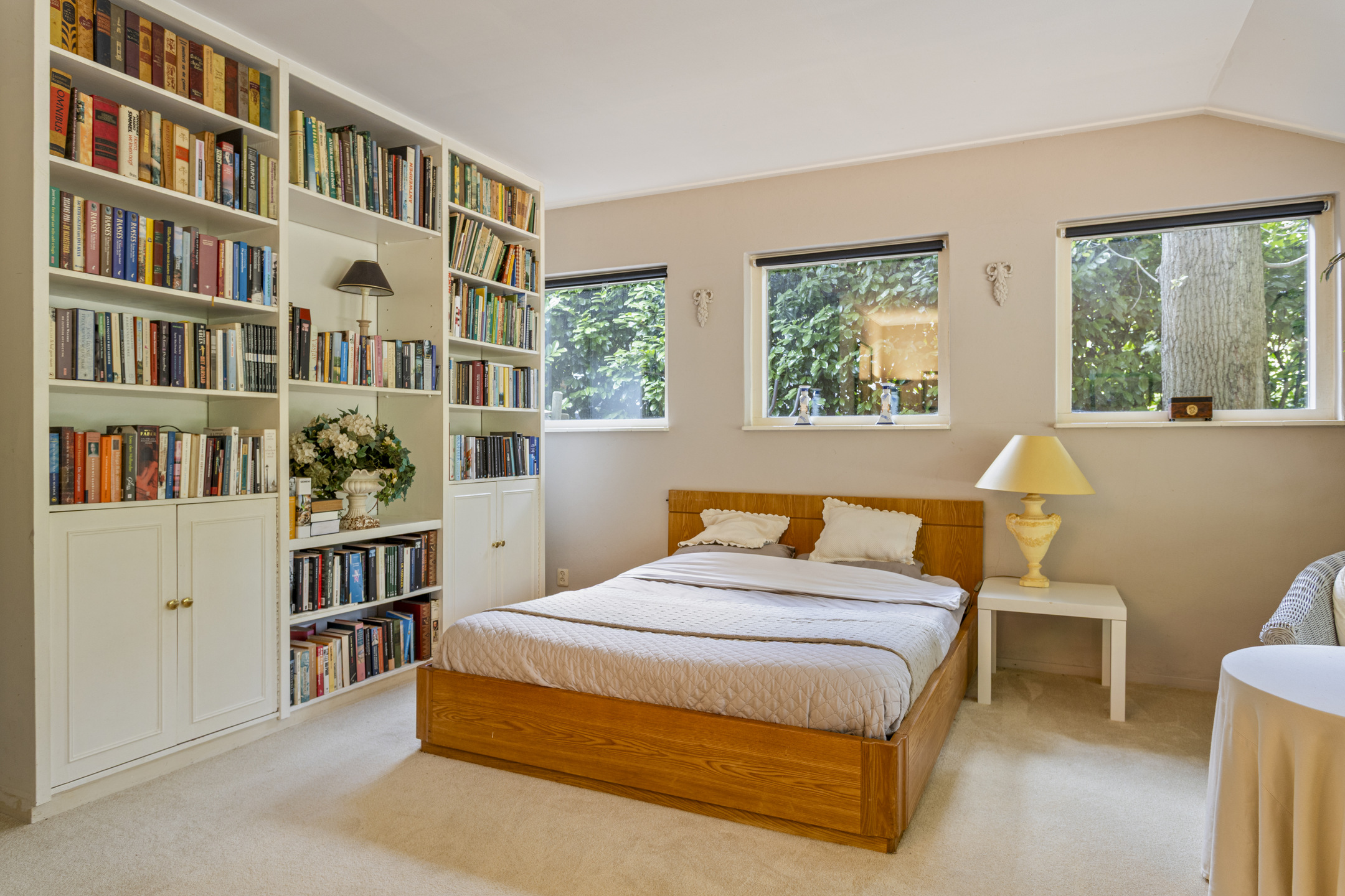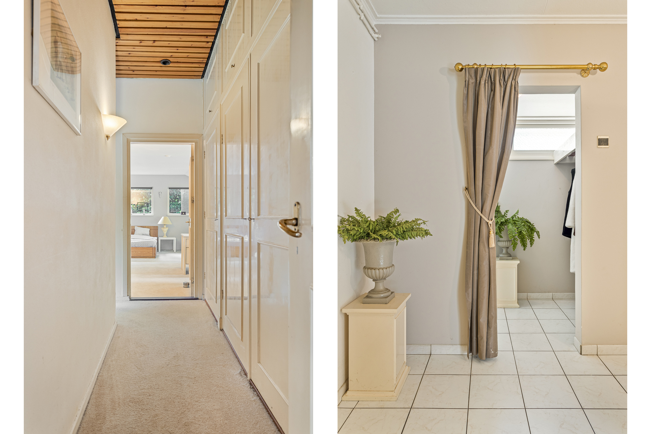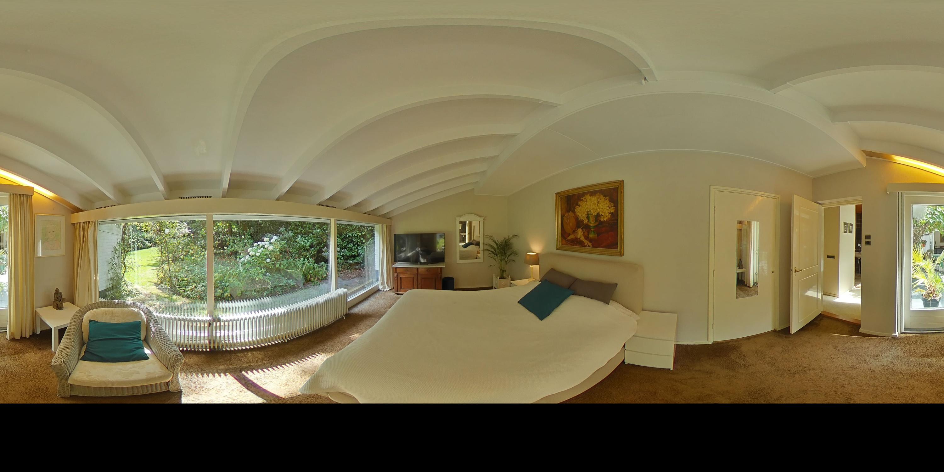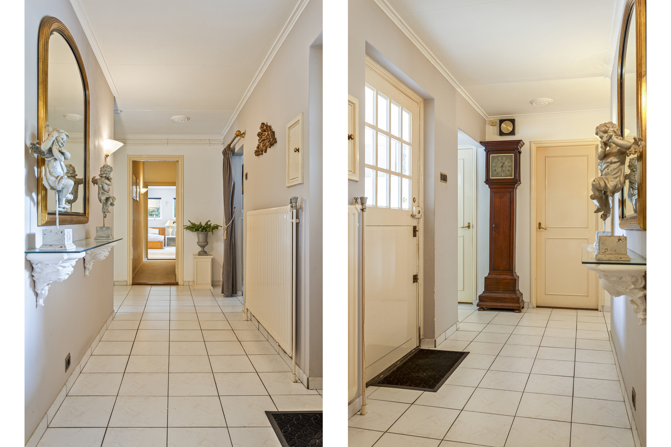 De halfronde, met grind verharde oprit biedt alle ruimte voor u en uw gasten. De entree zit in een inspringing aan de voorzijde en verwelkomt ons in de lichte ontvangsthal. Uiterst rechts de twee grote slaapkamers, met aan de opritzijde de grootste kamer, namelijk de bibliotheek annex slaapkamer. Aan de tuinzijde bevindt zich de tweede slaapkamer, met een schitterend uitzicht en een ruime inbouwkast. Aansluitend de badkamer, die is voorzien van een ligbad, douche, WC en een dubbele wastafel. Hier ook de openslaande deuren naar de veranda en de tuin; hier loopt u zo de groene weelde in.