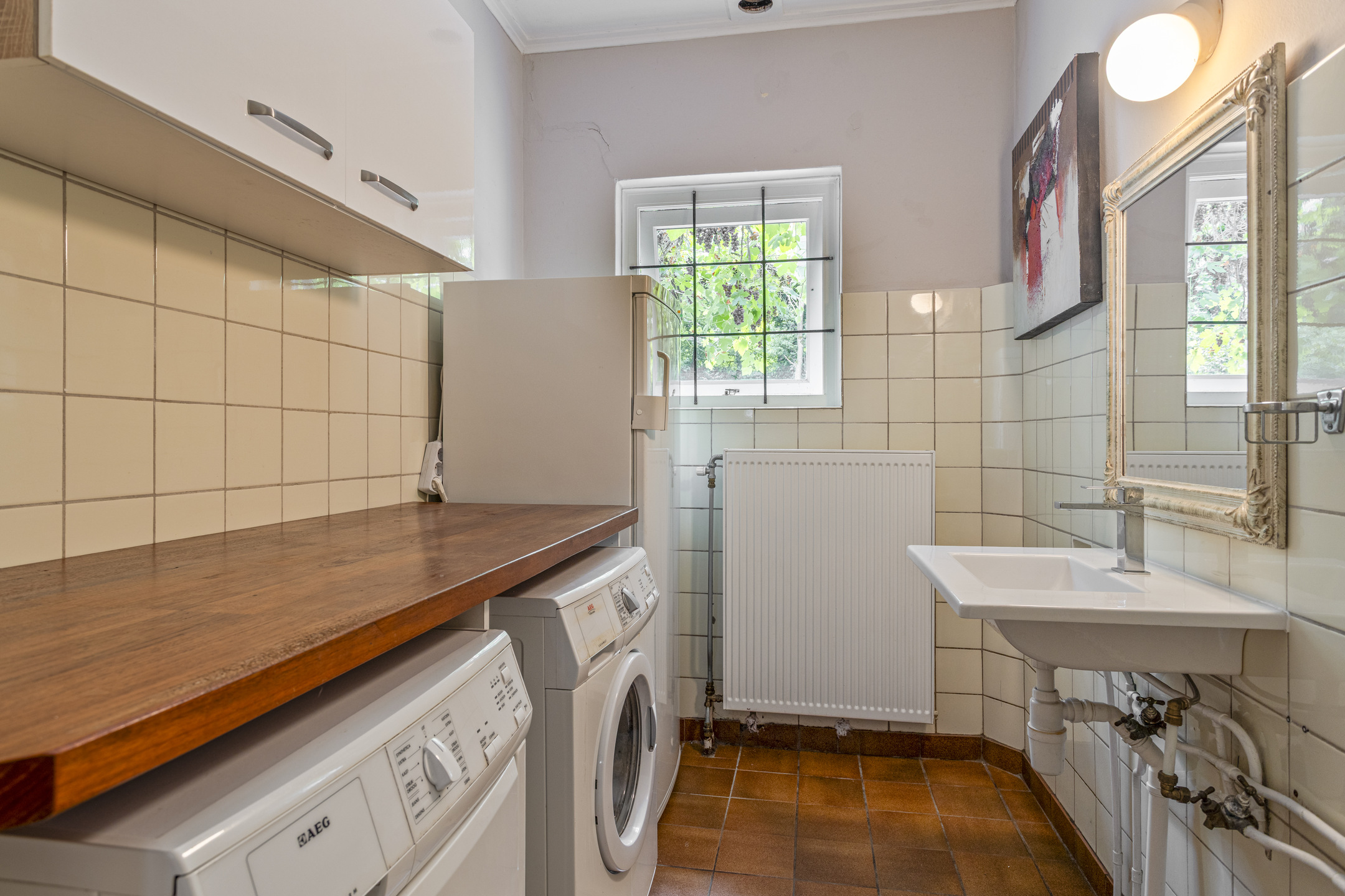 Aan de tuinzijde de bijkeuken met de aansluitingen voor de wasmachine en -droger en ruimte voor de extra diepvries of ijskast.