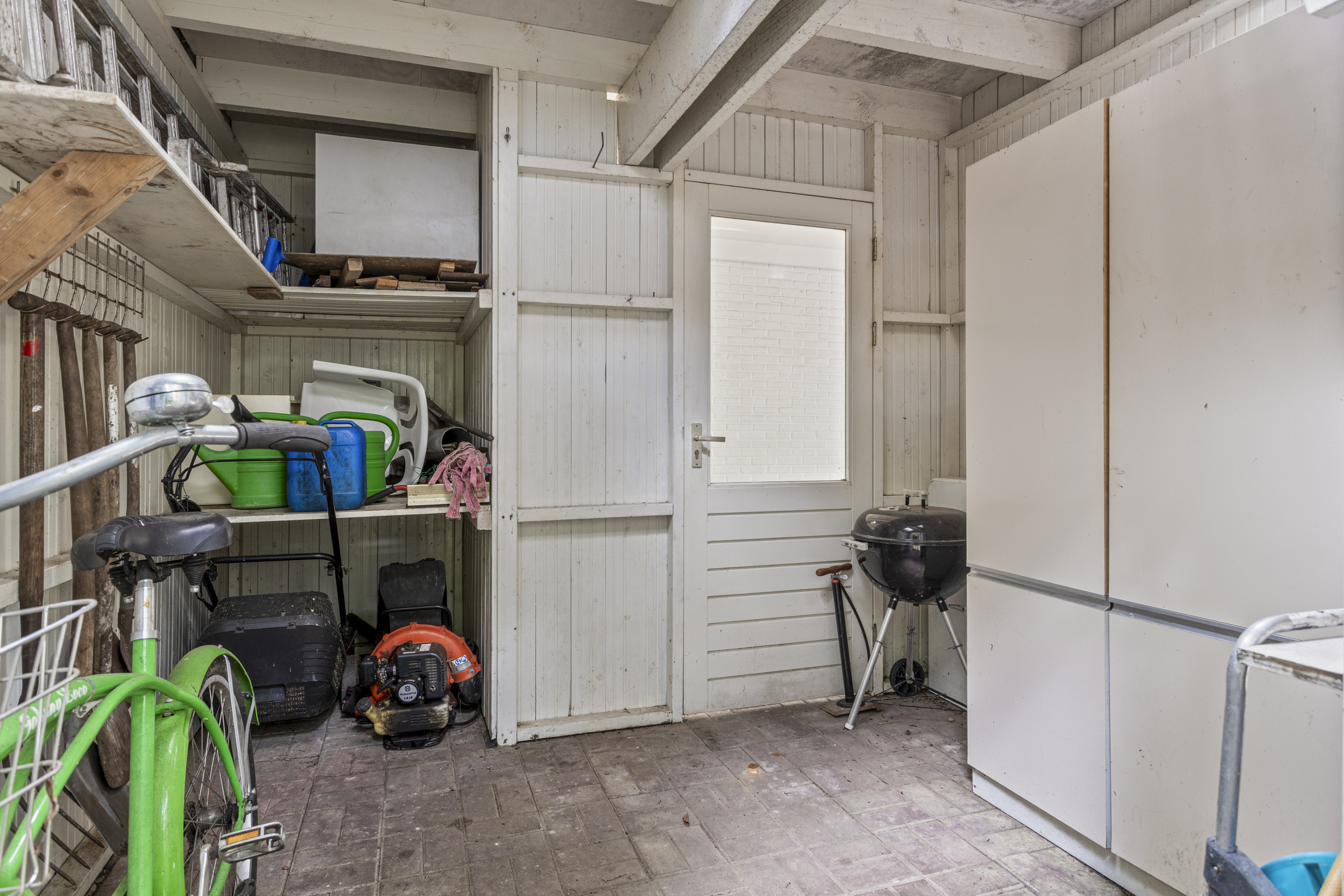 Aan de linkerzijde van het huis bevindt zich de bergschuur, met ruimte om de fietsen te stallen, de tuinspullen in op te bergen en te klussen. Onder de carport is ruimte om droog te parkeren.