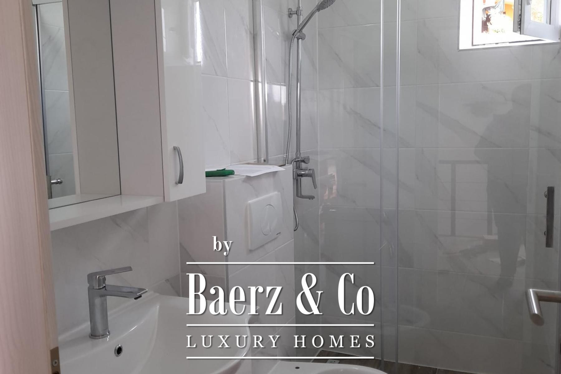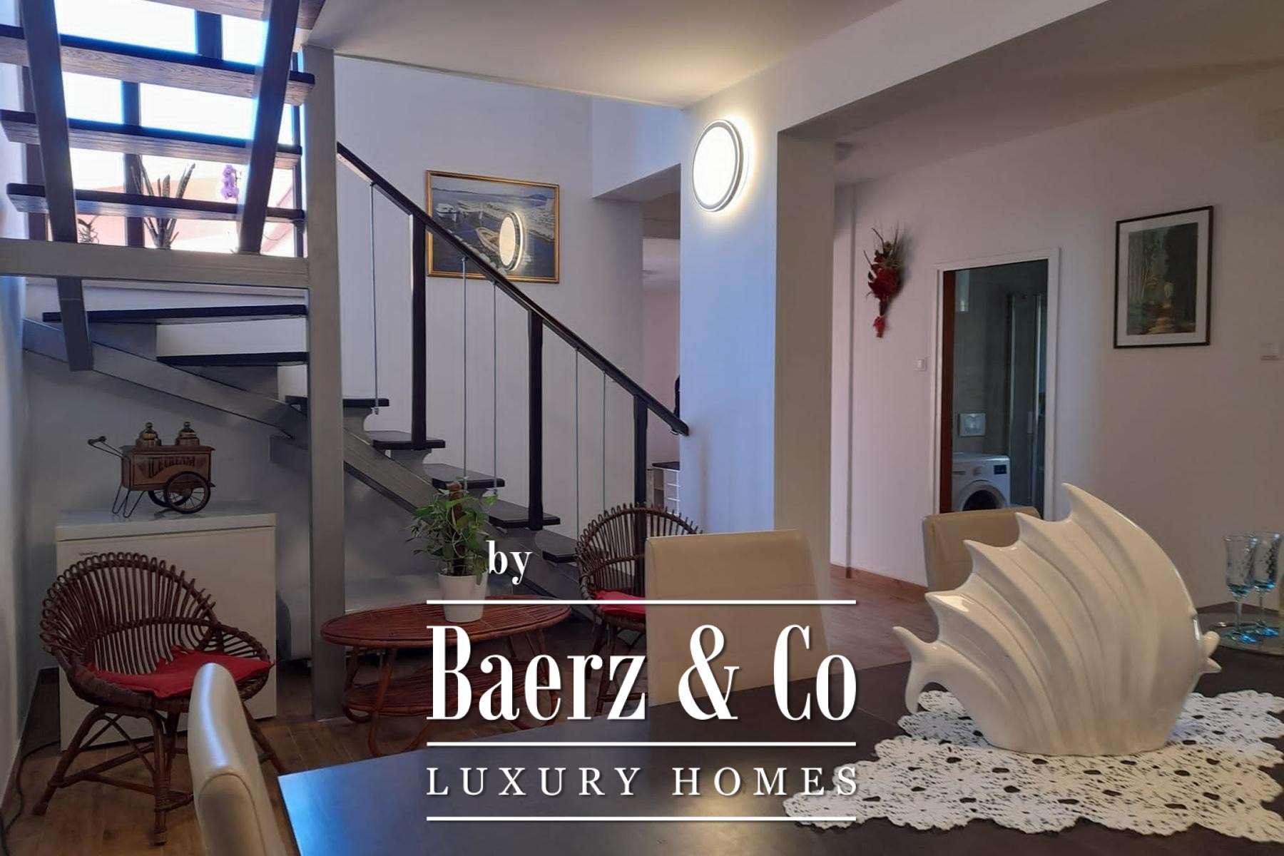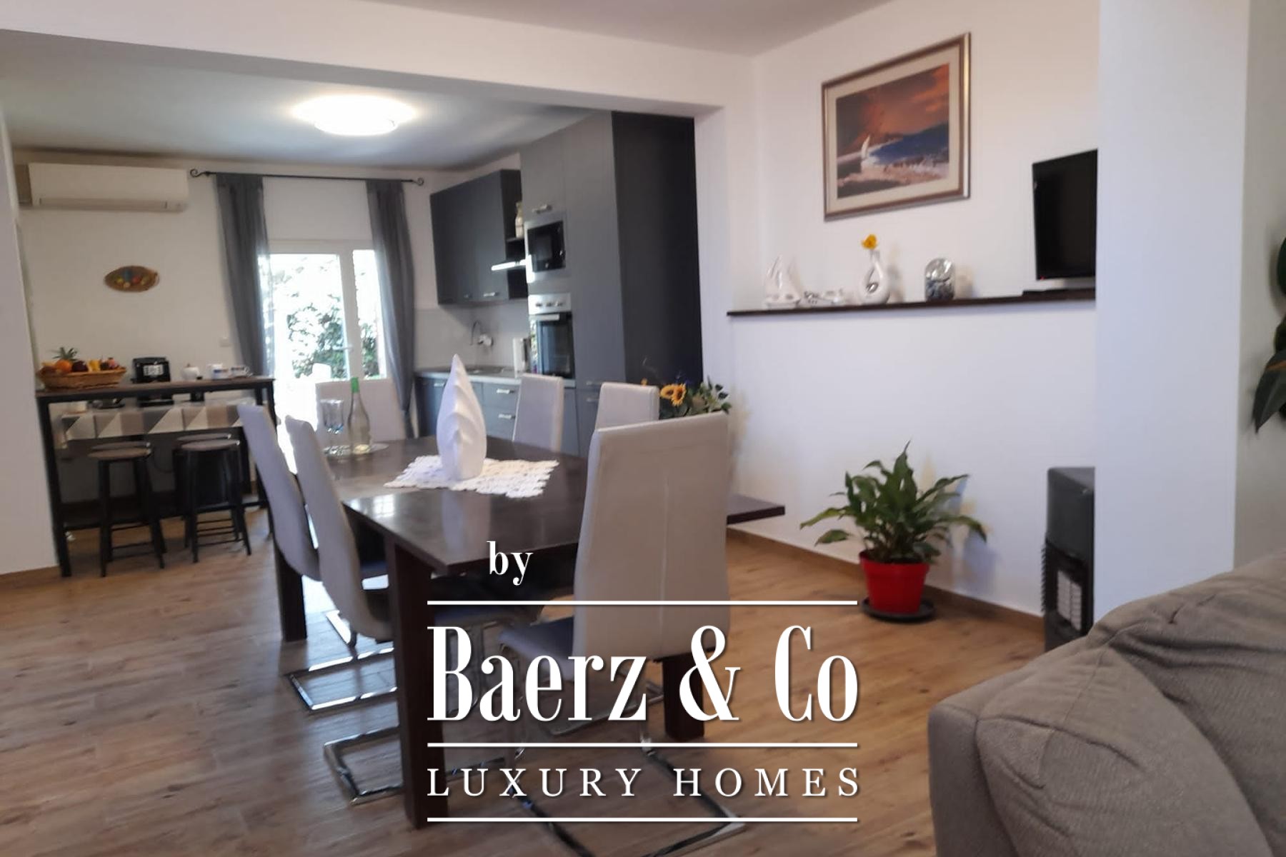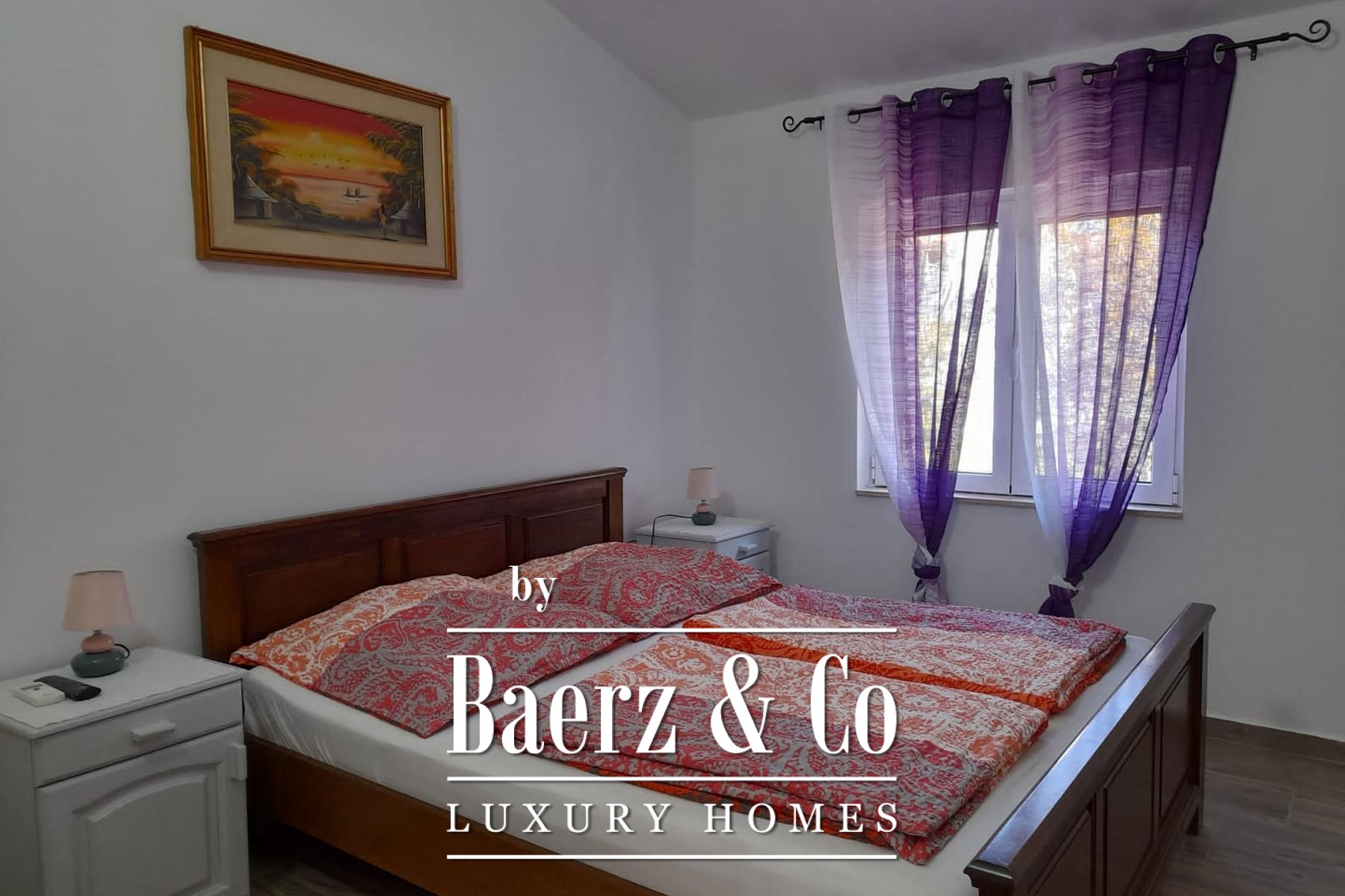 Das Haus erstreckt sich über zwei Etagen. Im Erdgeschoss verschmelzen Licht und Volumen in einem großzügigen Wohnbereich, einer voll ausgestatteten Küche und einem Bad – alle zum Terrassenbereich und einem 48 m² großen Pool ausgerichtet. Eine diskrete Garage ist harmonisch in die Raumstruktur integriert. Der Poolgarten mit offenem Kamin verleiht der Immobilie eine zurückhaltende kroatische Note.