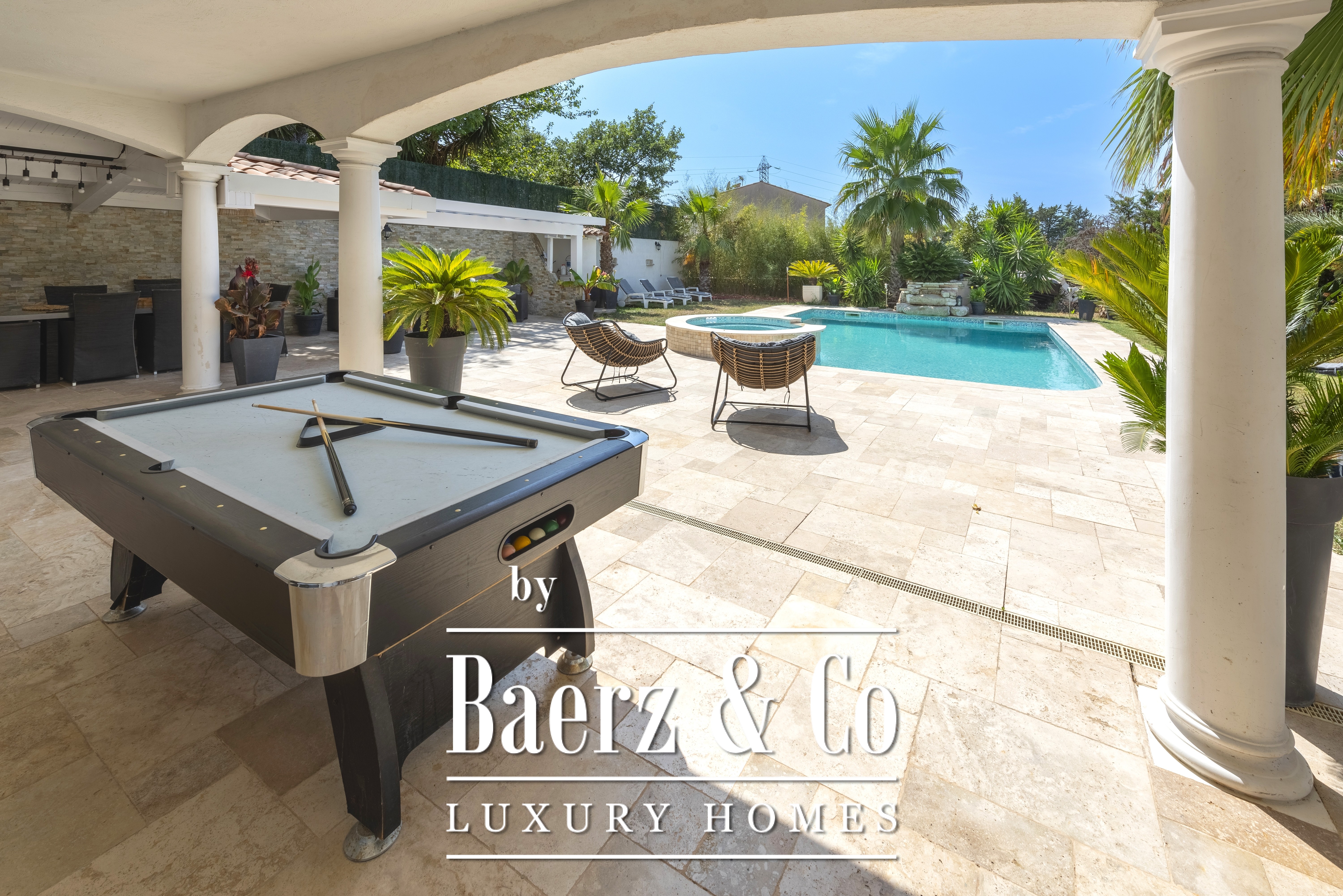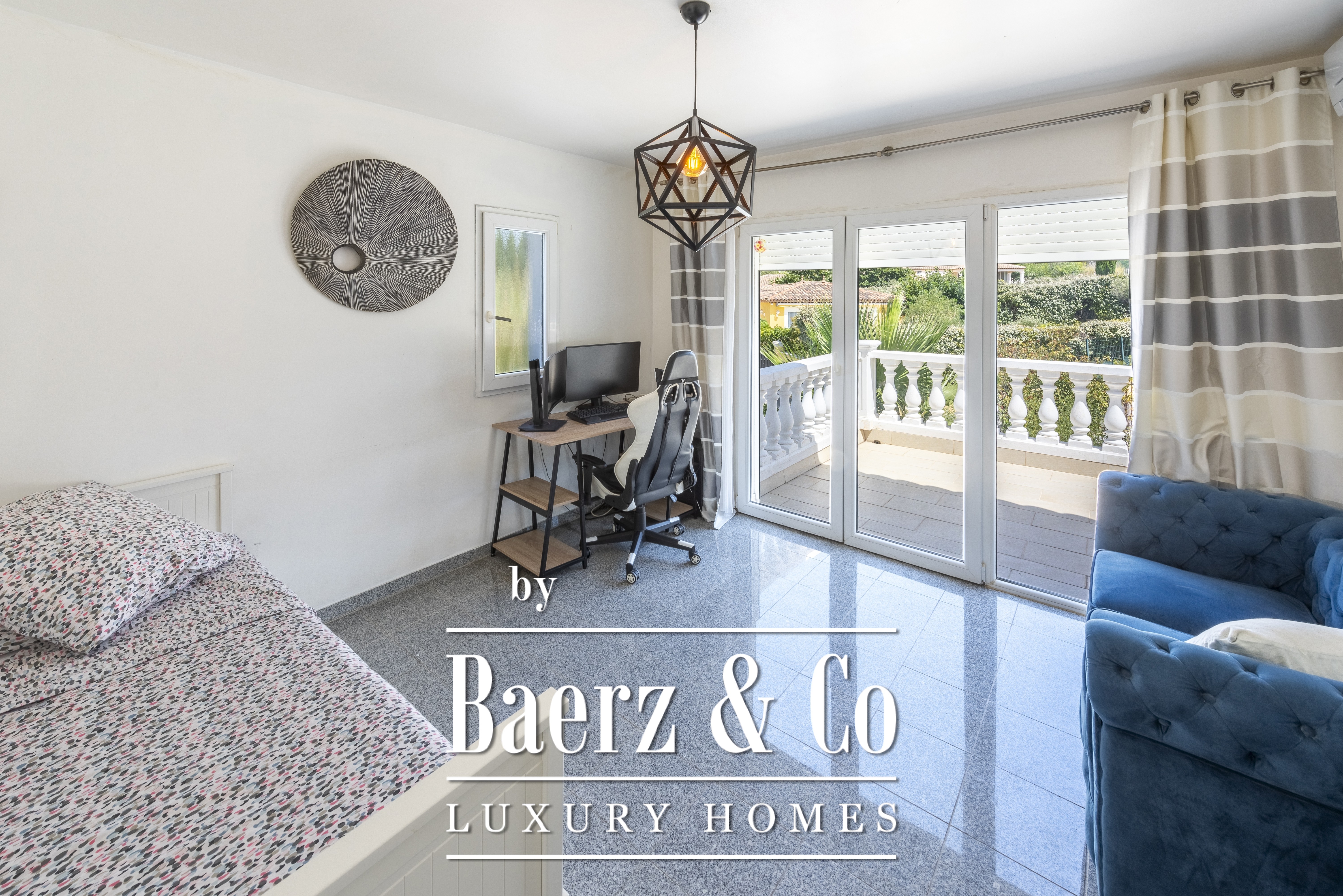 Villa Fréjus präsentiert eine zum Verkauf stehende Villa mit 172 m², die mit großzügigen Räumen und stilvollem Licht gestaltet wurde und sich in einer privaten, gesicherten Wohnanlage befindet. Diese Immobilie liegt in einem ruhigen Wohnumfeld und bietet dennoch unmittelbaren Zugang zu allen Annehmlichkeiten, darunter Geschäfte, Schulen und Hauptverkehrsstraßen. Die Villa Fréjus öffnet sich mit einer lichtdurchfluteten Wohnfläche und einer voll ausgestatteten offenen Küche, die optimal für geselliges Beisammensein gestaltet wurde. Mit Westausrichtung öffnet sich der Bereich elegant auf eine großzügige Terrasse mit Blick auf den Pool und die Gartenanlage. Der Schlaftrakt umfasst vier Schlafzimmer, ein großes Badezimmer, ein Duschbad sowie eine funktionale Waschküche. Das Anwesen erstreckt sich über ein 1.082 m² großes Grundstück mit offenen und überdachten Terrassen, die Bereiche für sommerliches Speisen, Entspannung am Pool sowie einen separaten Jacuzzi schaffen. Granitfliesen, Fußbodenheizung, umkehrbare Klimaanlage und elektrische Rollläden unterstreichen das Augenmerk auf Qualität und Komfort. Die Villa verfügt sowohl über eine Garage als auch über reichlich Innen- und Außenstellplätze, was ein privates und angenehmes Wohnkonzept ermöglicht. Die Energieeffizienzklasse B steht für ausgewogene, moderne Effizienz.