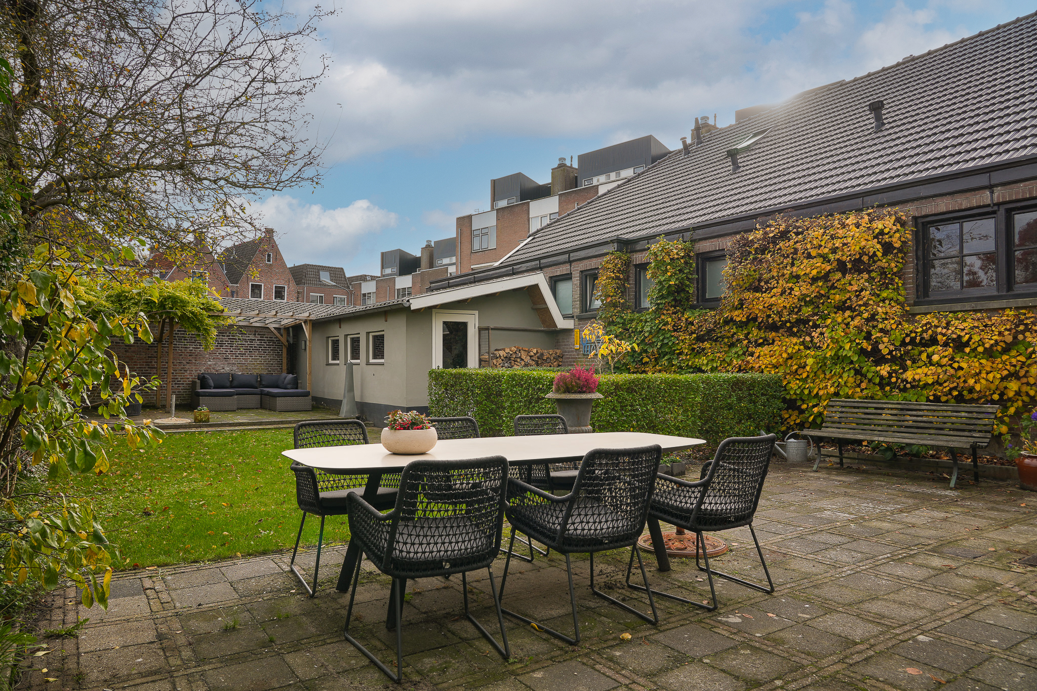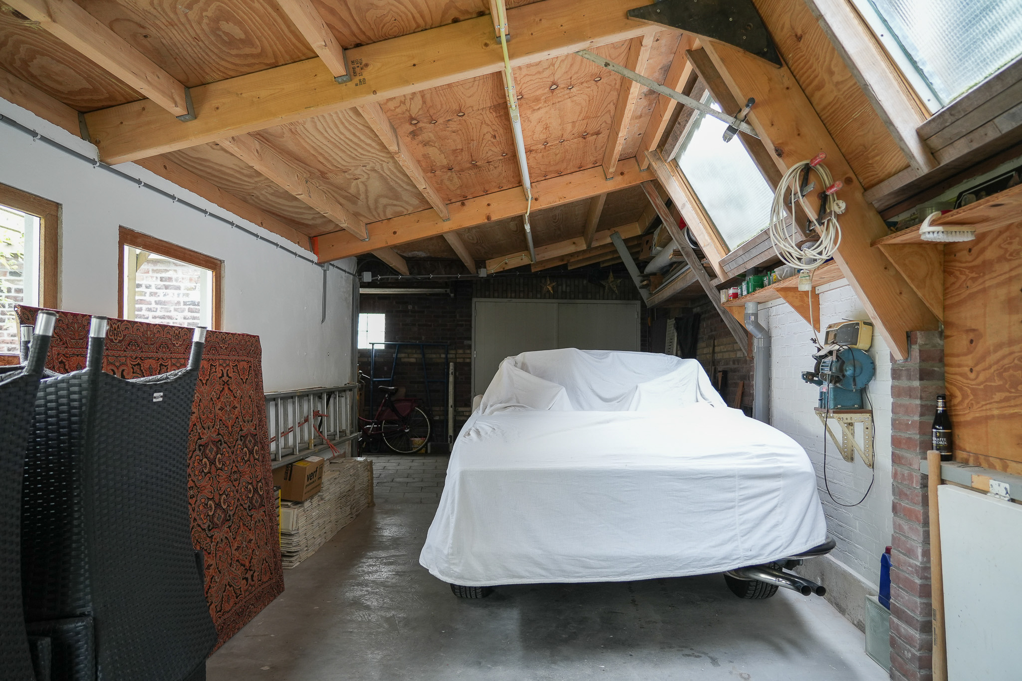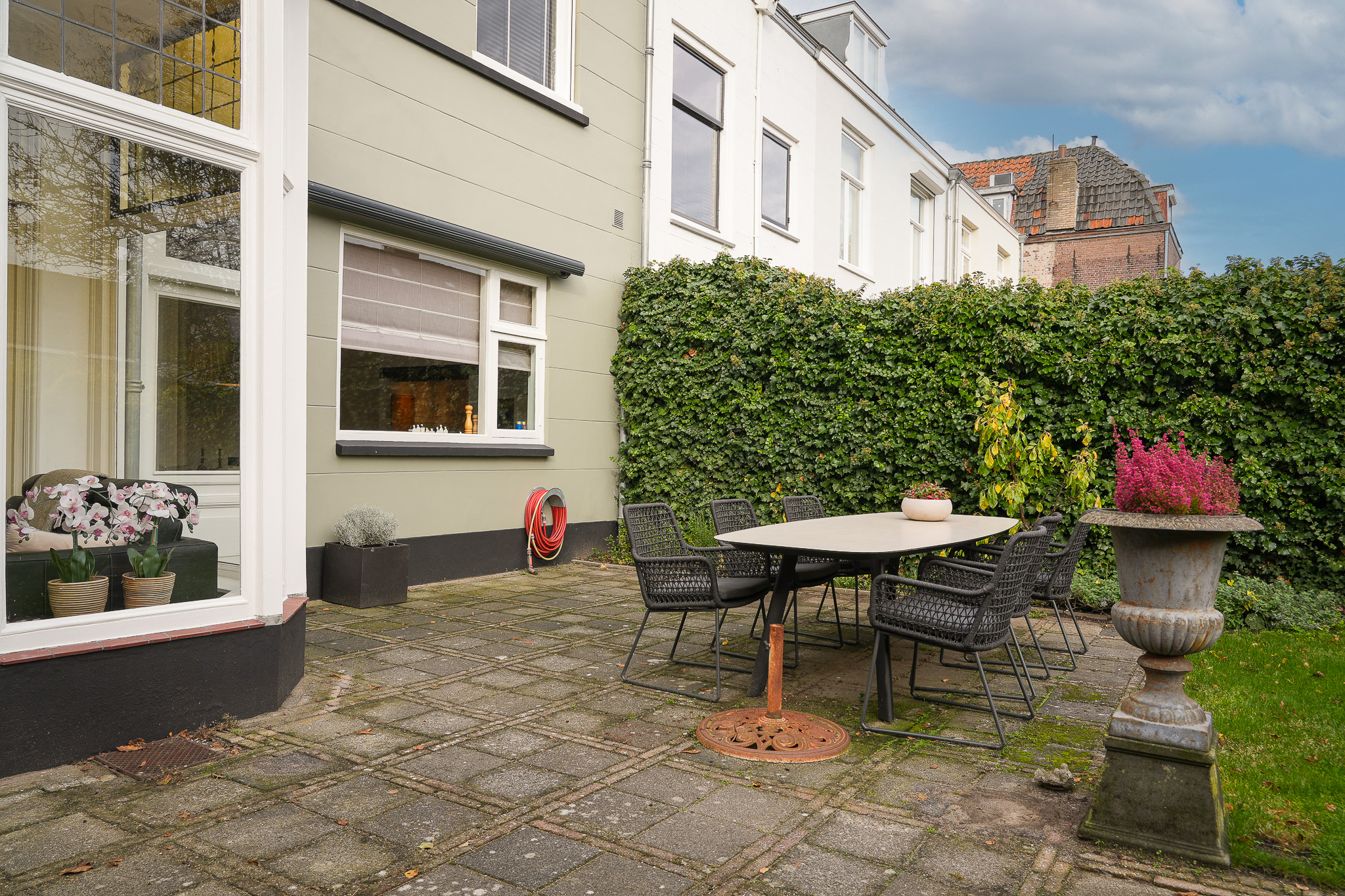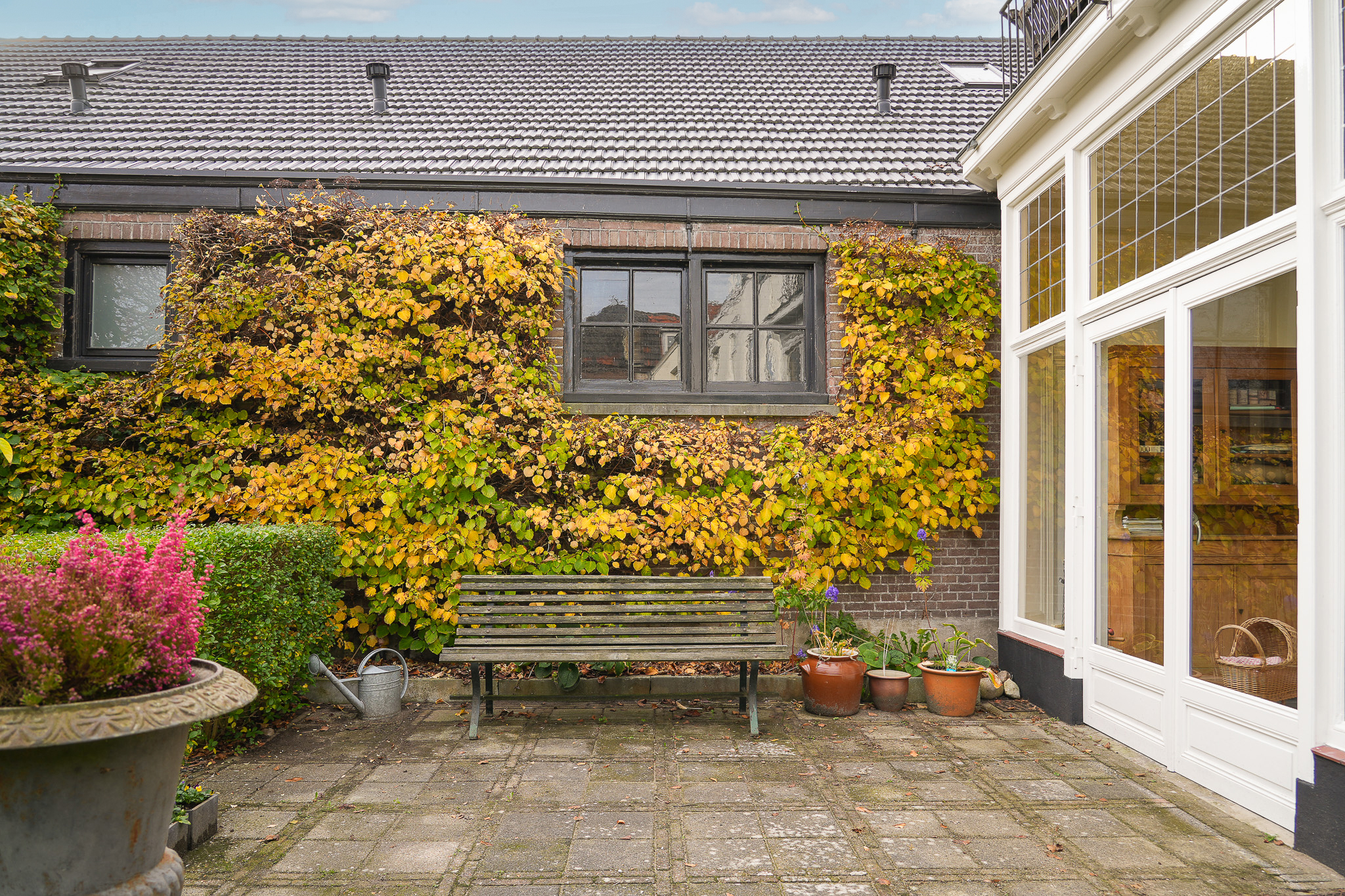 Behind the house lies a unique garden, 9.5 metres wide and 15 metres deep, facing east and south — offering both sunny and shaded spots throughout the day. In 2021, the owners were able to extend the plot, creating space for a large, tiled outbuilding (59 m²). This building is ideal for use as a garage for a classic car or boat, or as an artist’s studio. The double doors open onto the private parking area behind the house.