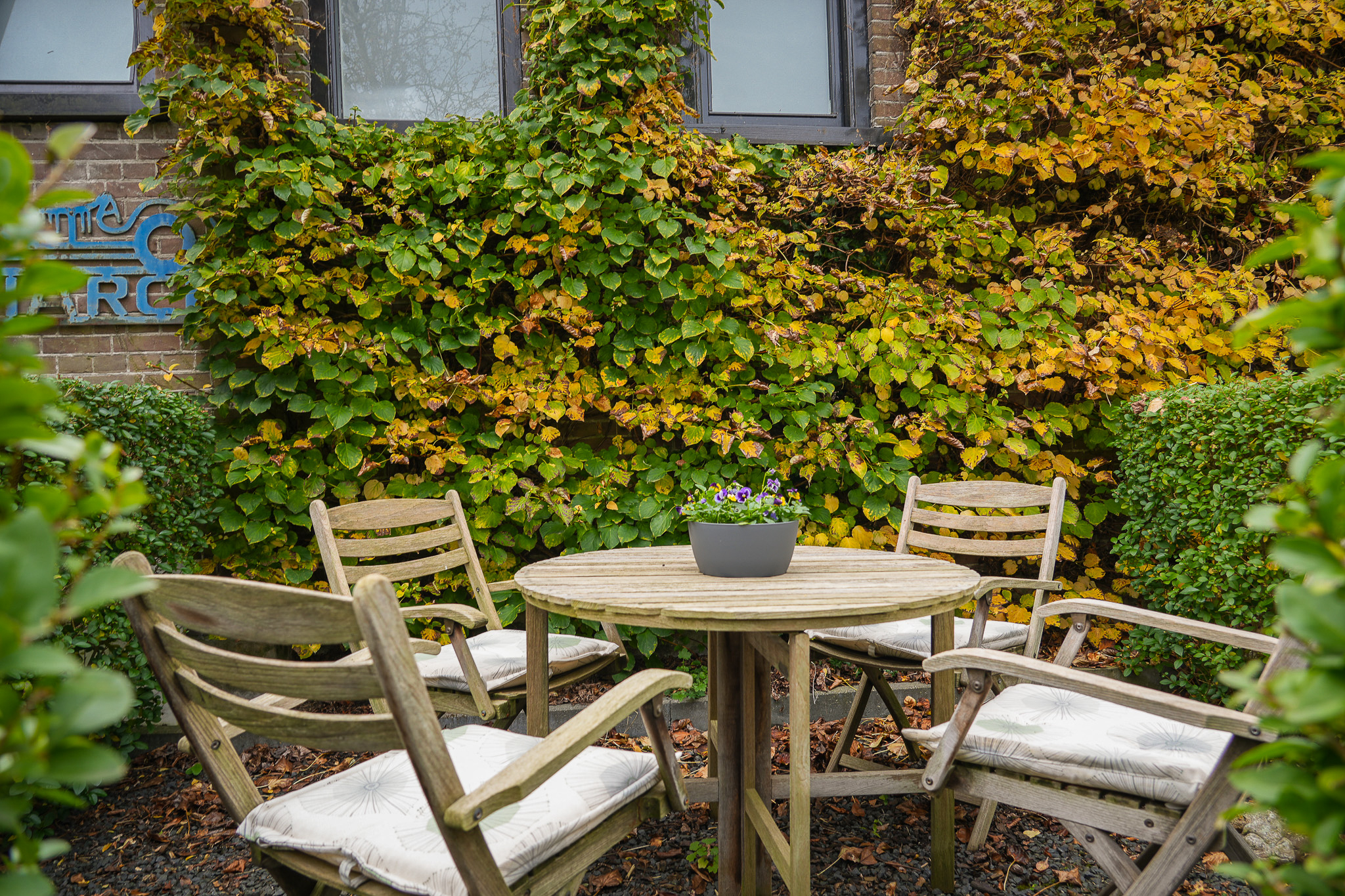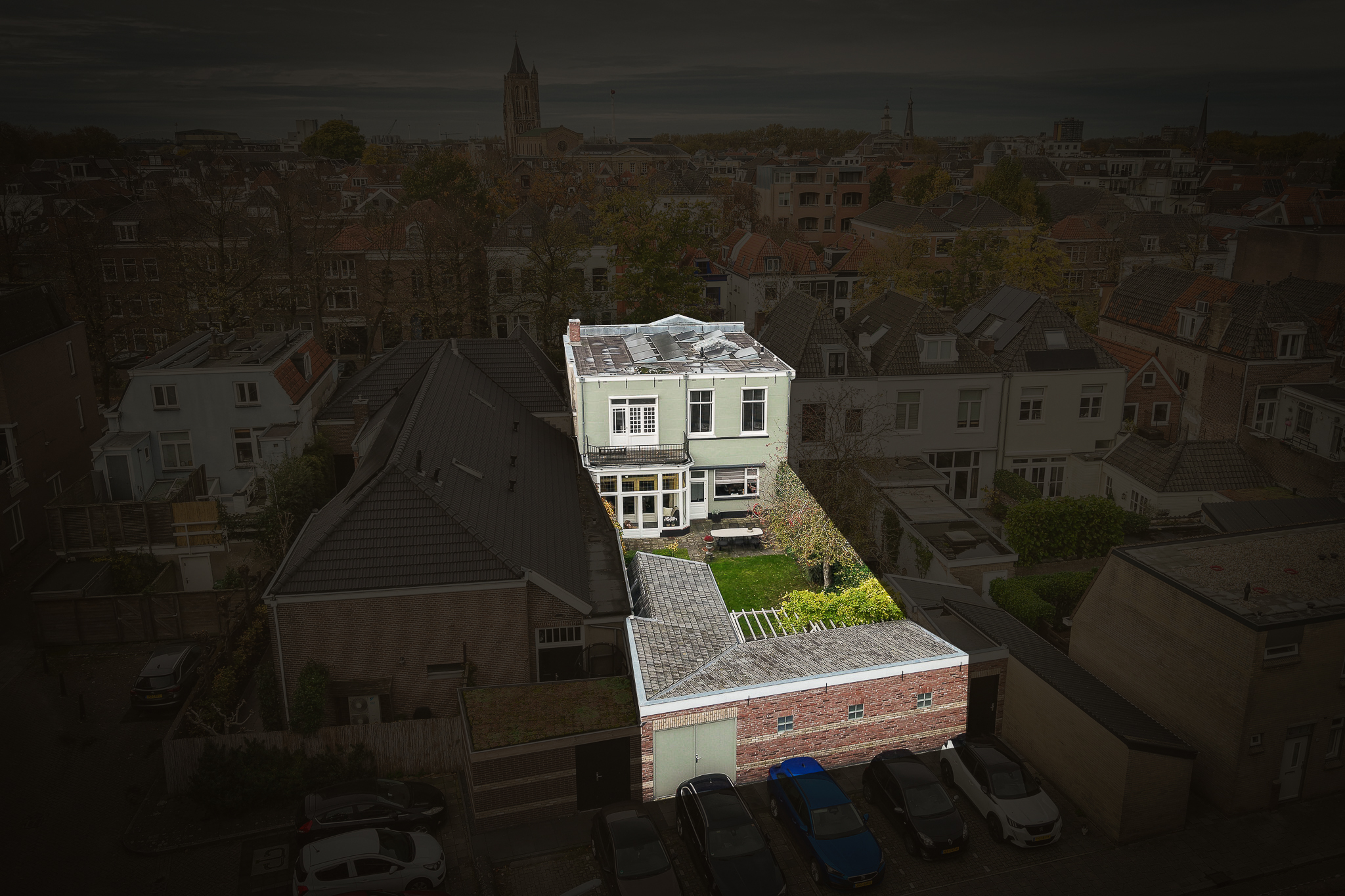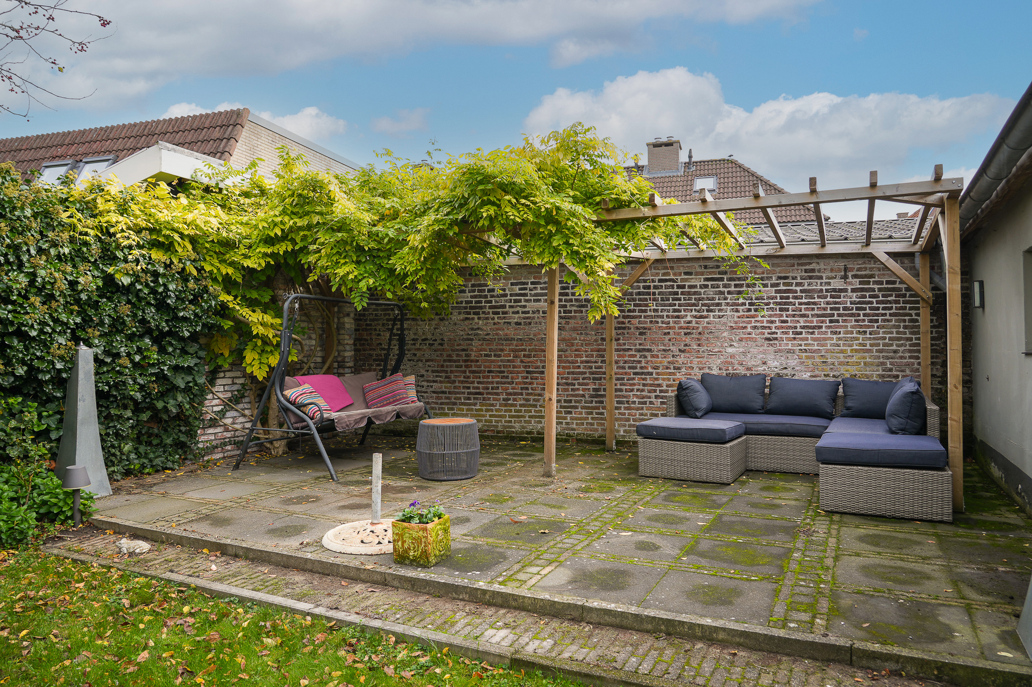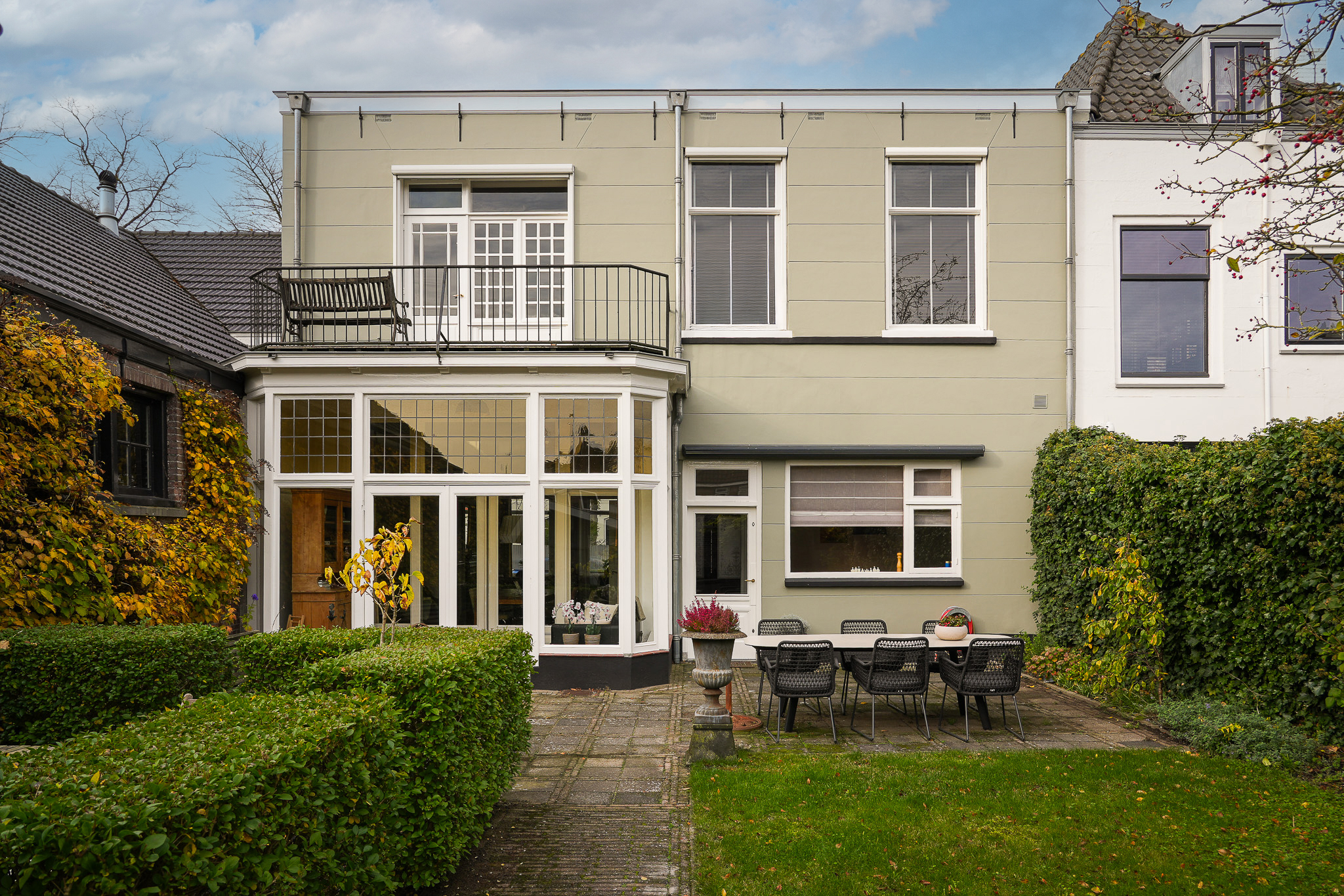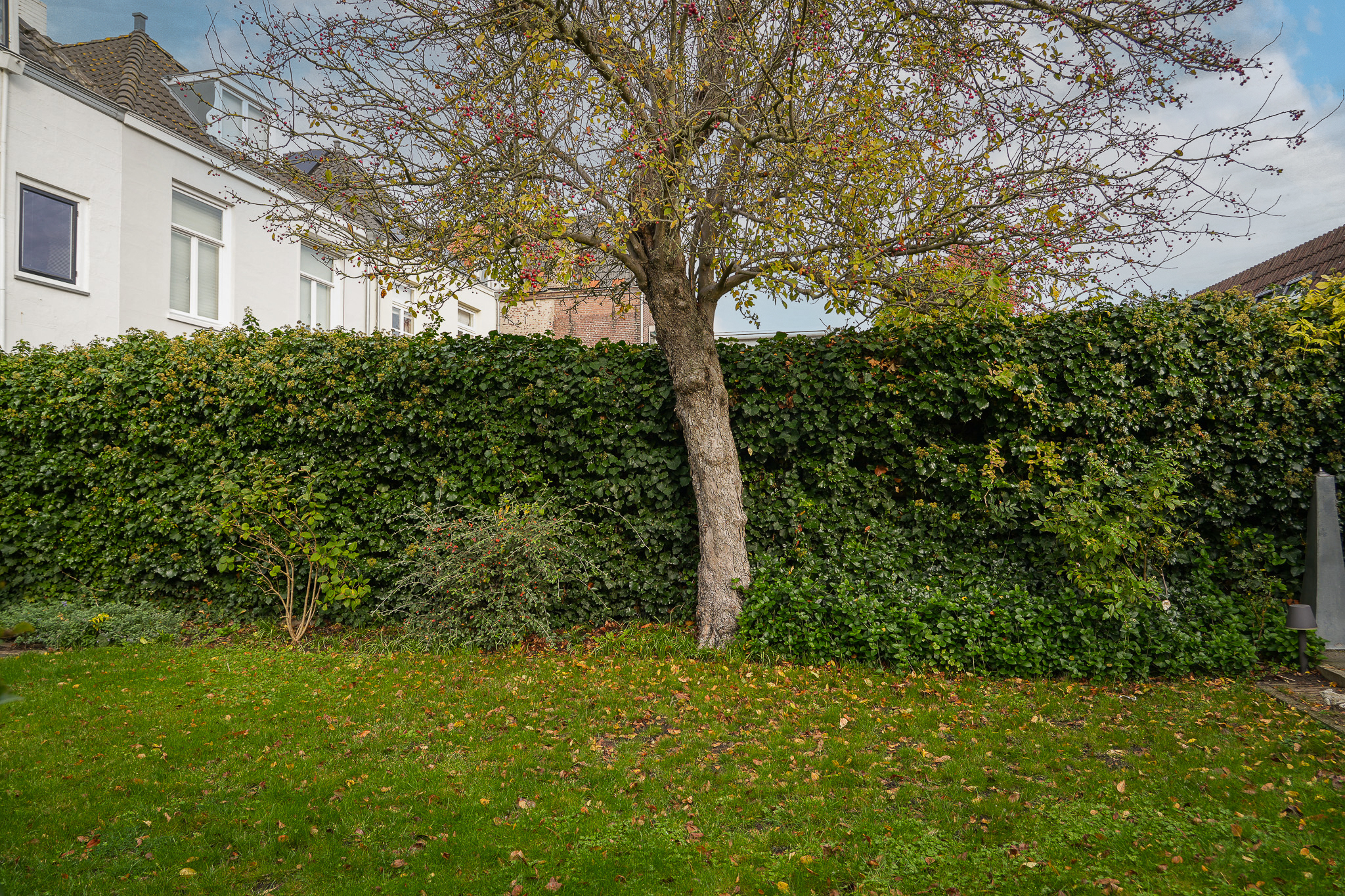 Behind the house lies a unique garden, 9.5 metres wide and 15 metres deep, facing east and south — offering both sunny and shaded spots throughout the day. In 2021, the owners were able to extend the plot, creating space for a large, tiled outbuilding (59 m²). This building is ideal for use as a garage for a classic car or boat, or as an artist’s studio. The double doors open onto the private parking area behind the house.