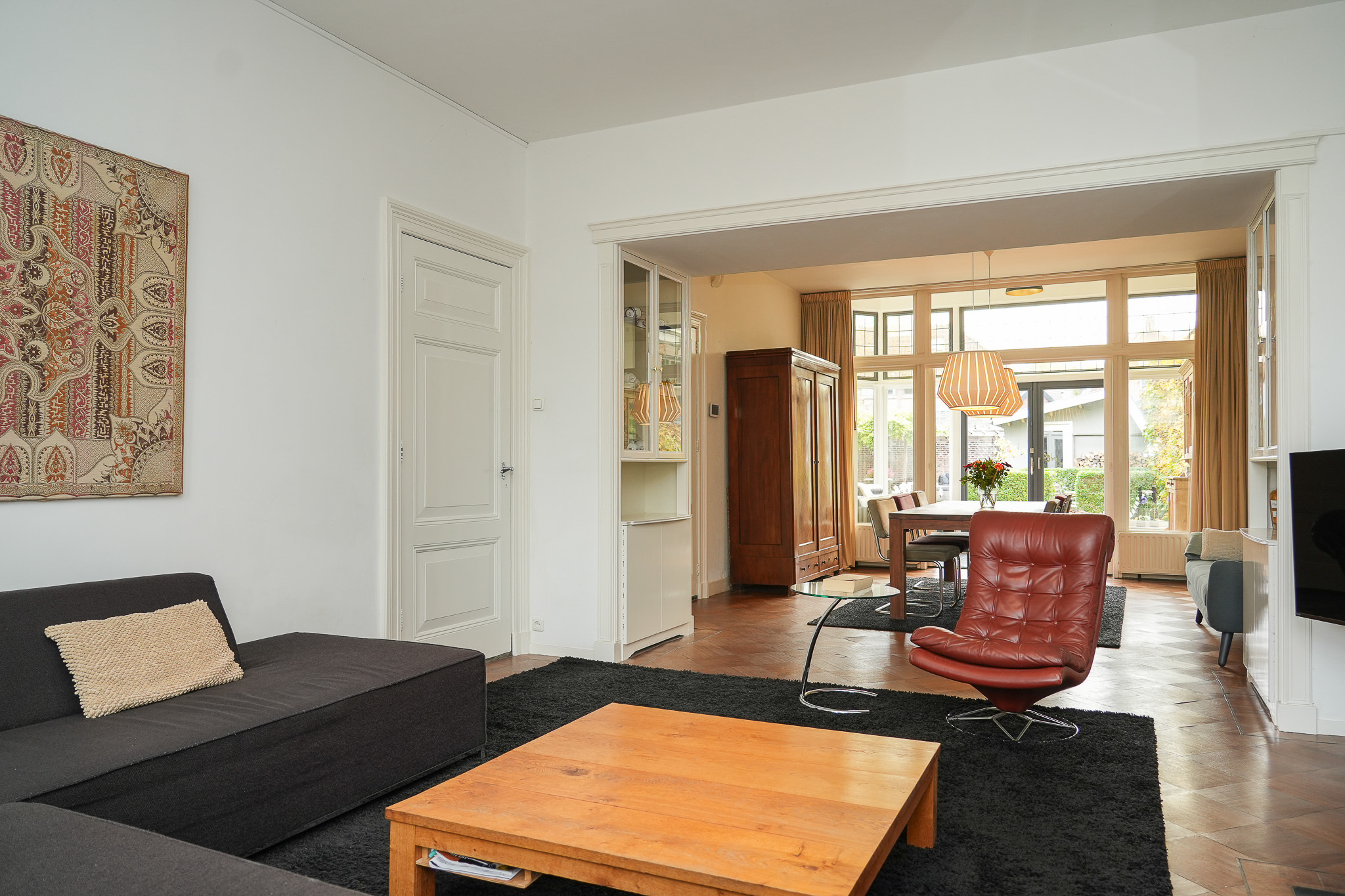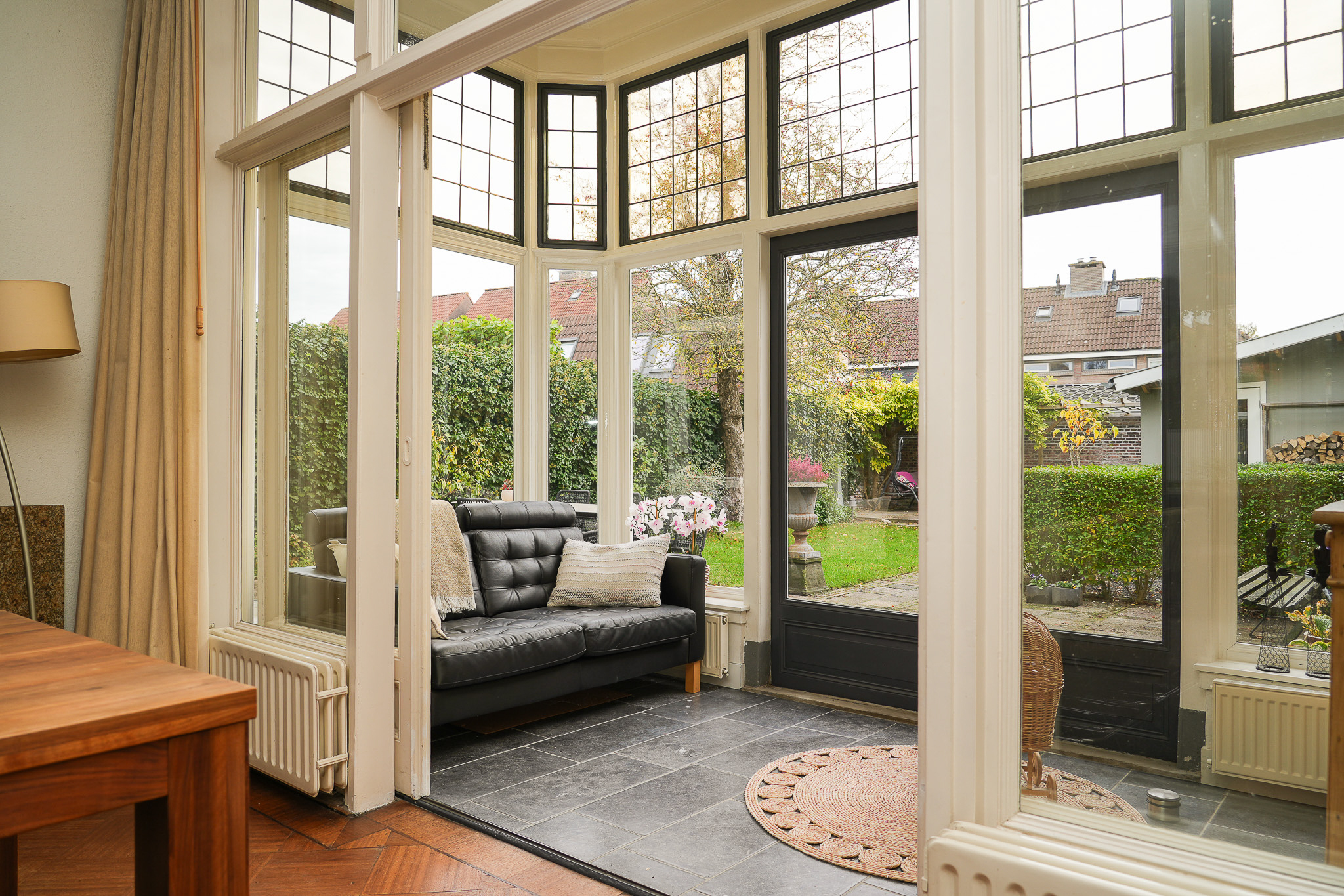 At the rear, a heated garden room with tiled floor can be closed off with glass sliding doors — ideal as a playroom or second sitting area.