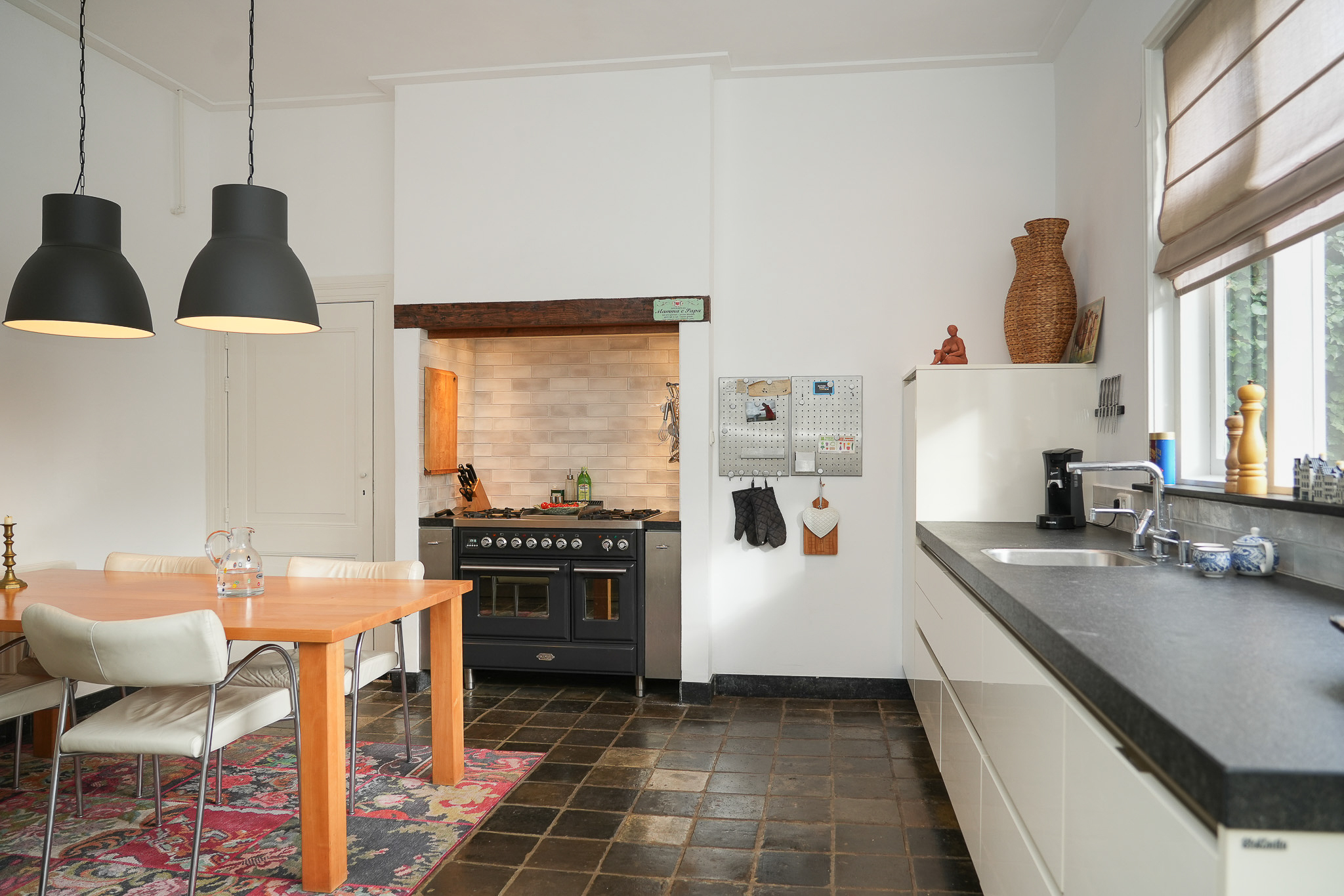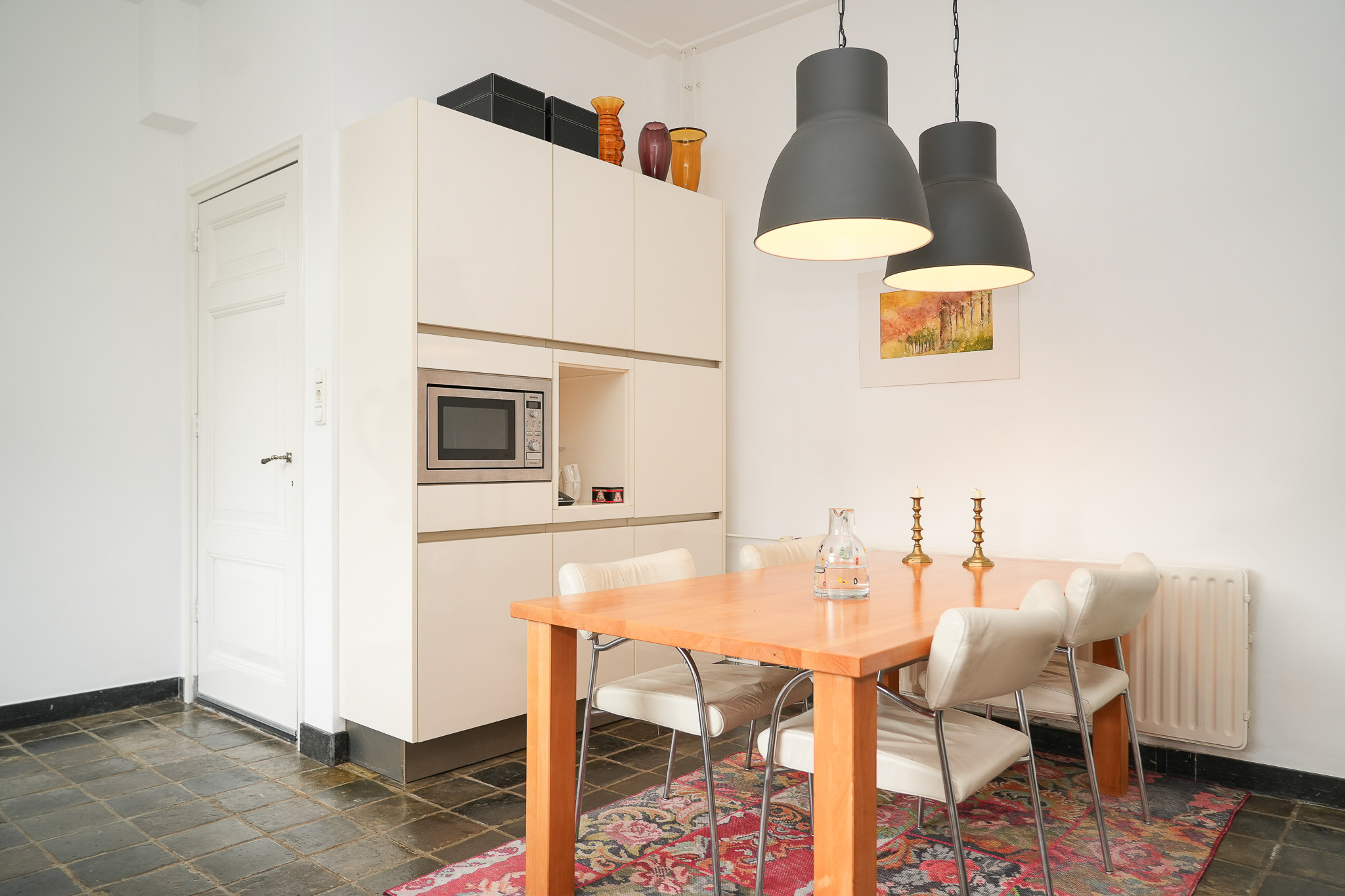 The light and airy kitchen features a Siematic kitchen unit with various built-in appliances and a deep, solid natural-stone countertop in one piece. Beneath the original mantel sits a stainless-steel Boretti stove. From the worktop there is a lovely view of the garden, and the space easily accommodates a large dining table. A wide door opens directly to the terrace.