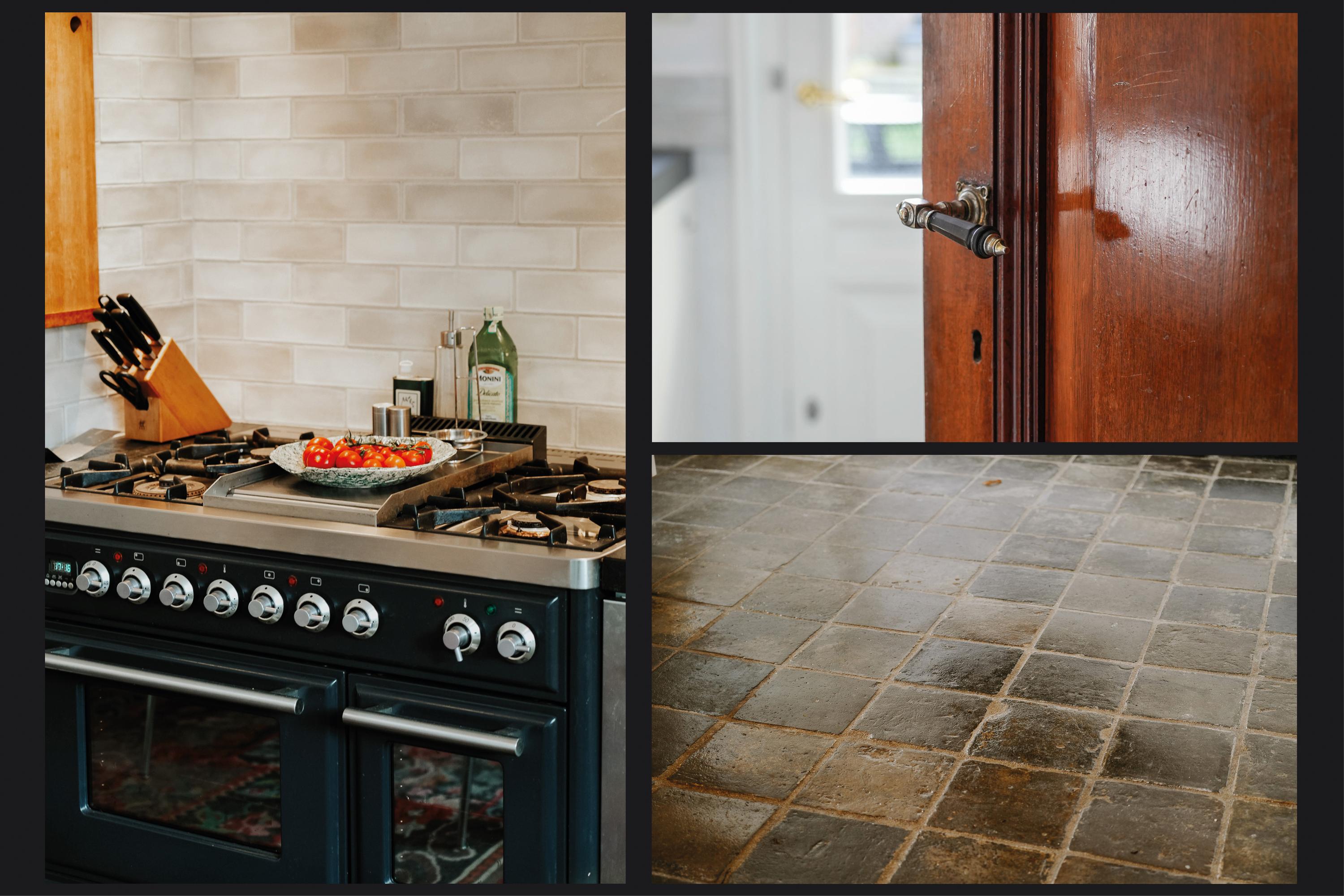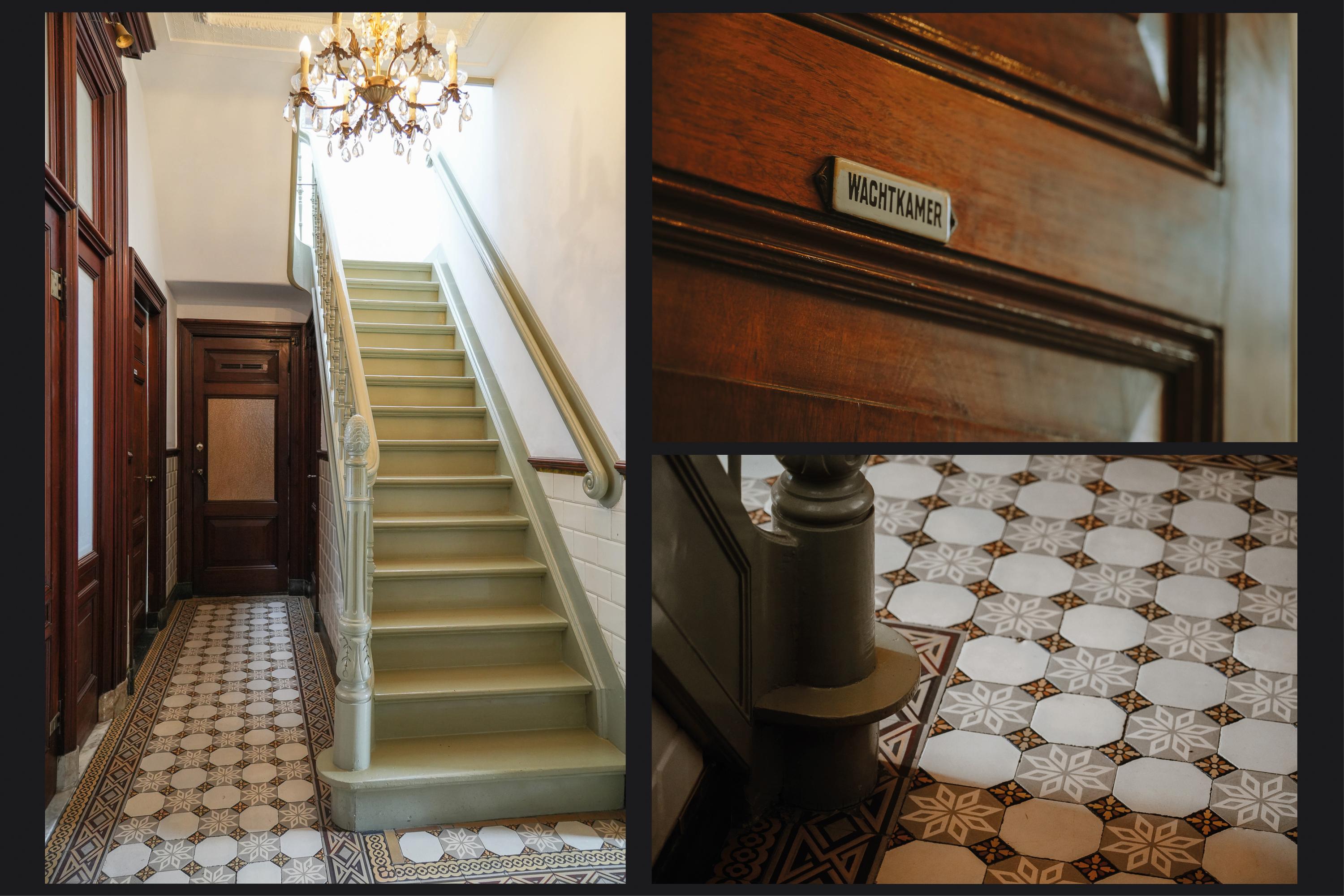 A 19th-century staircase leads from the rear hall to the upper floor. From this hall, panelled doors open to the living room, study, kitchen, cellar cupboard and toilet. The floor is laid with authentic patterned tiles.