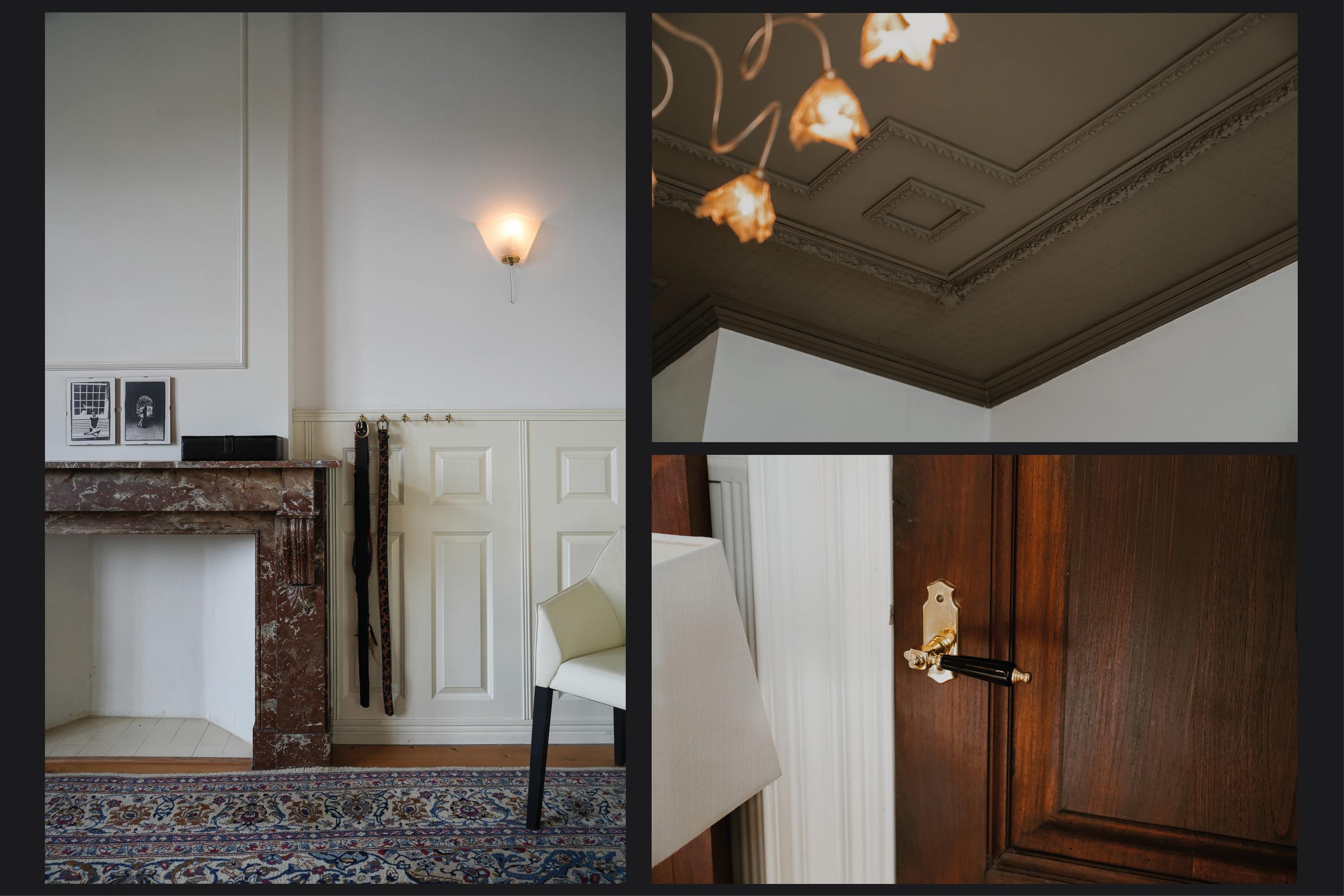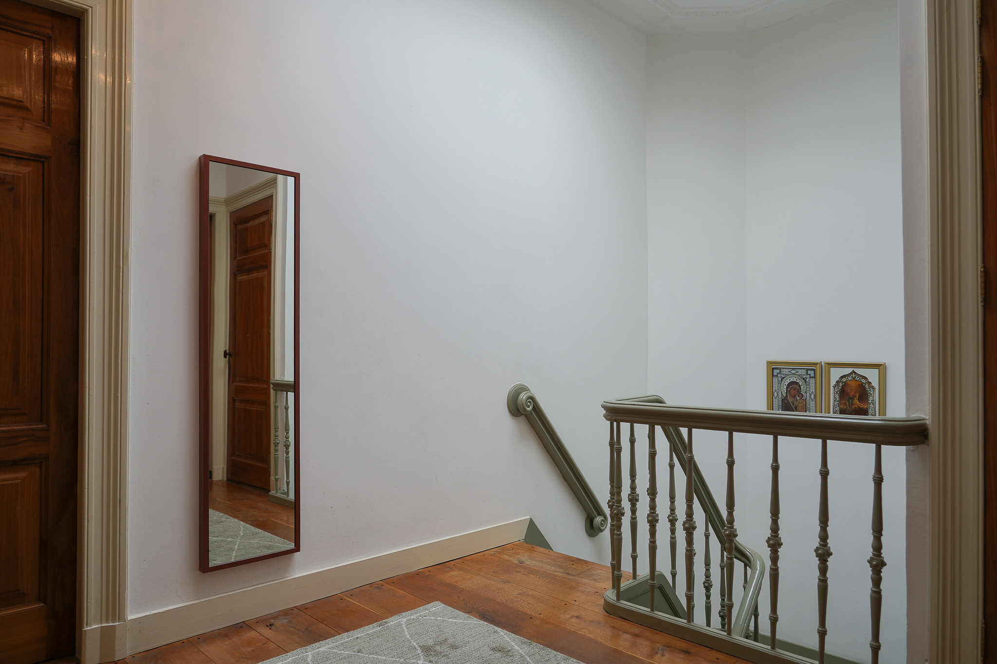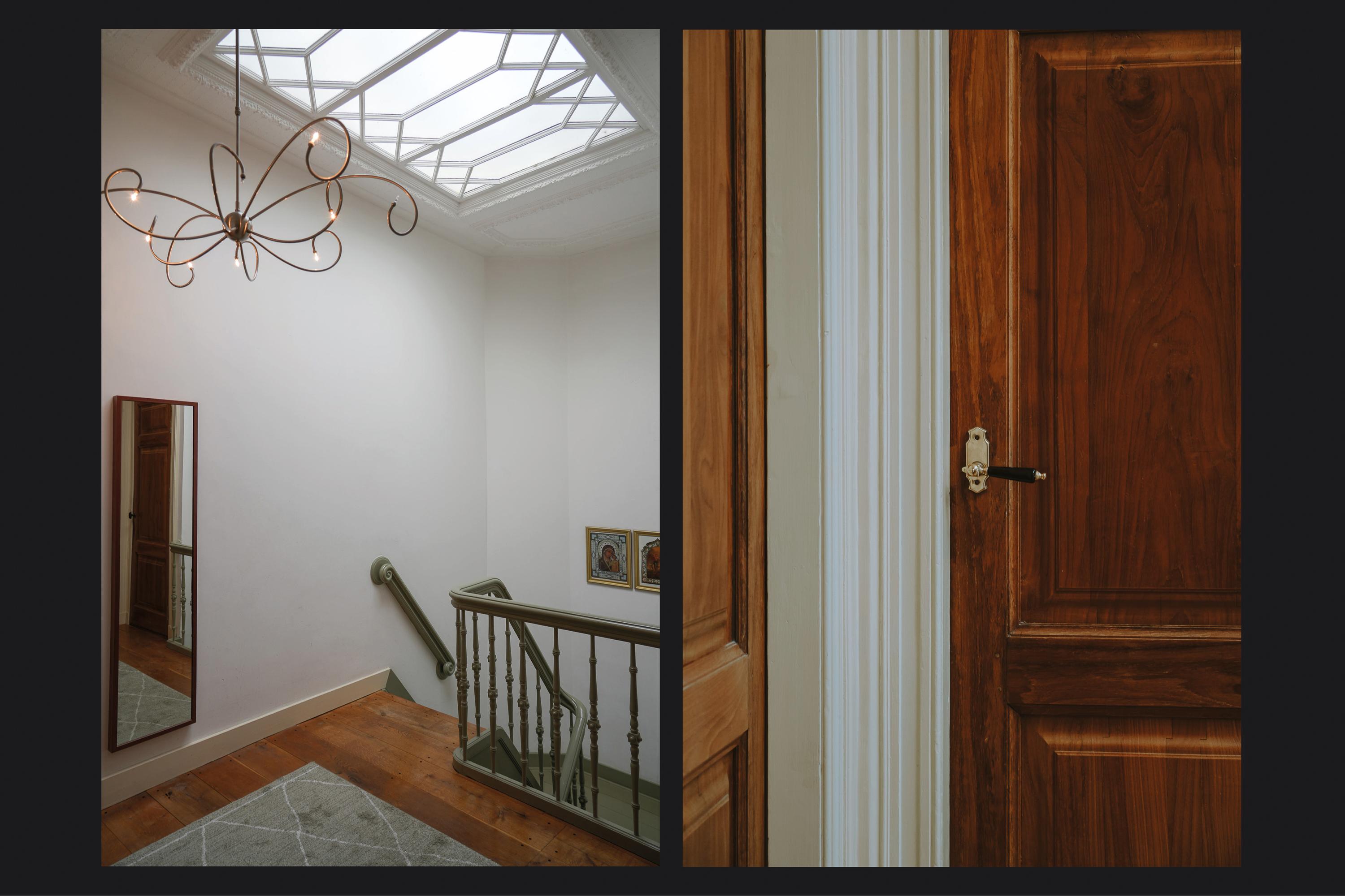 The landing on the first floor is bathed in daylight thanks to a large roof light. Elegant three-panel doors open onto the adjoining rooms. Two bedrooms at the front overlook the green square. In the vestibule of one of these rooms, preparations have been made for a staircase — a remnant of earlier plans to add a second storey.