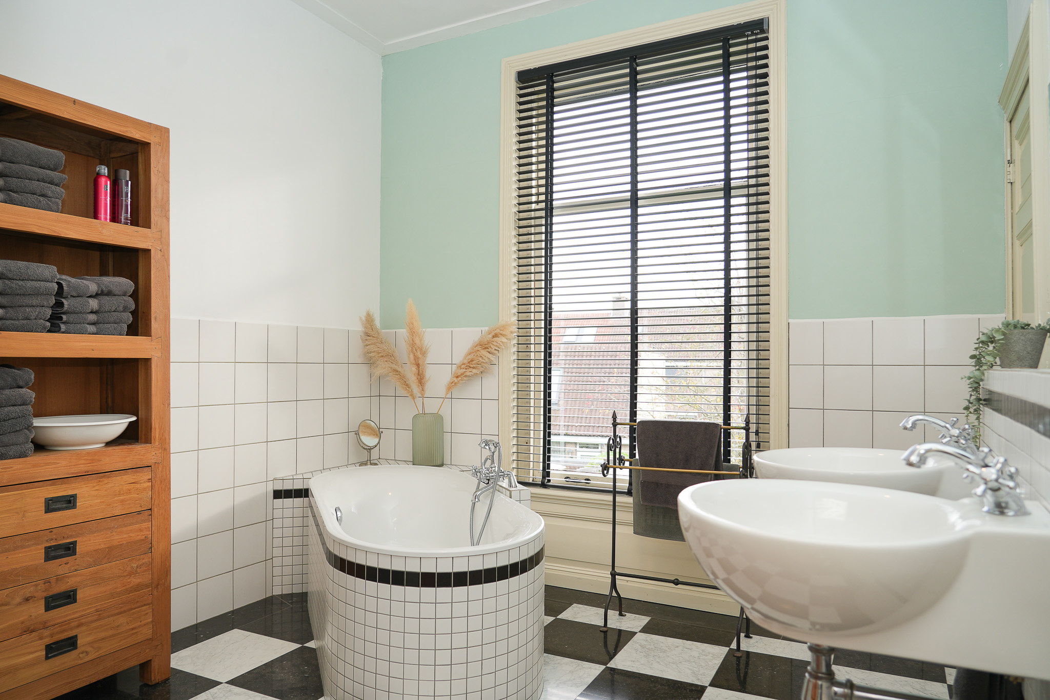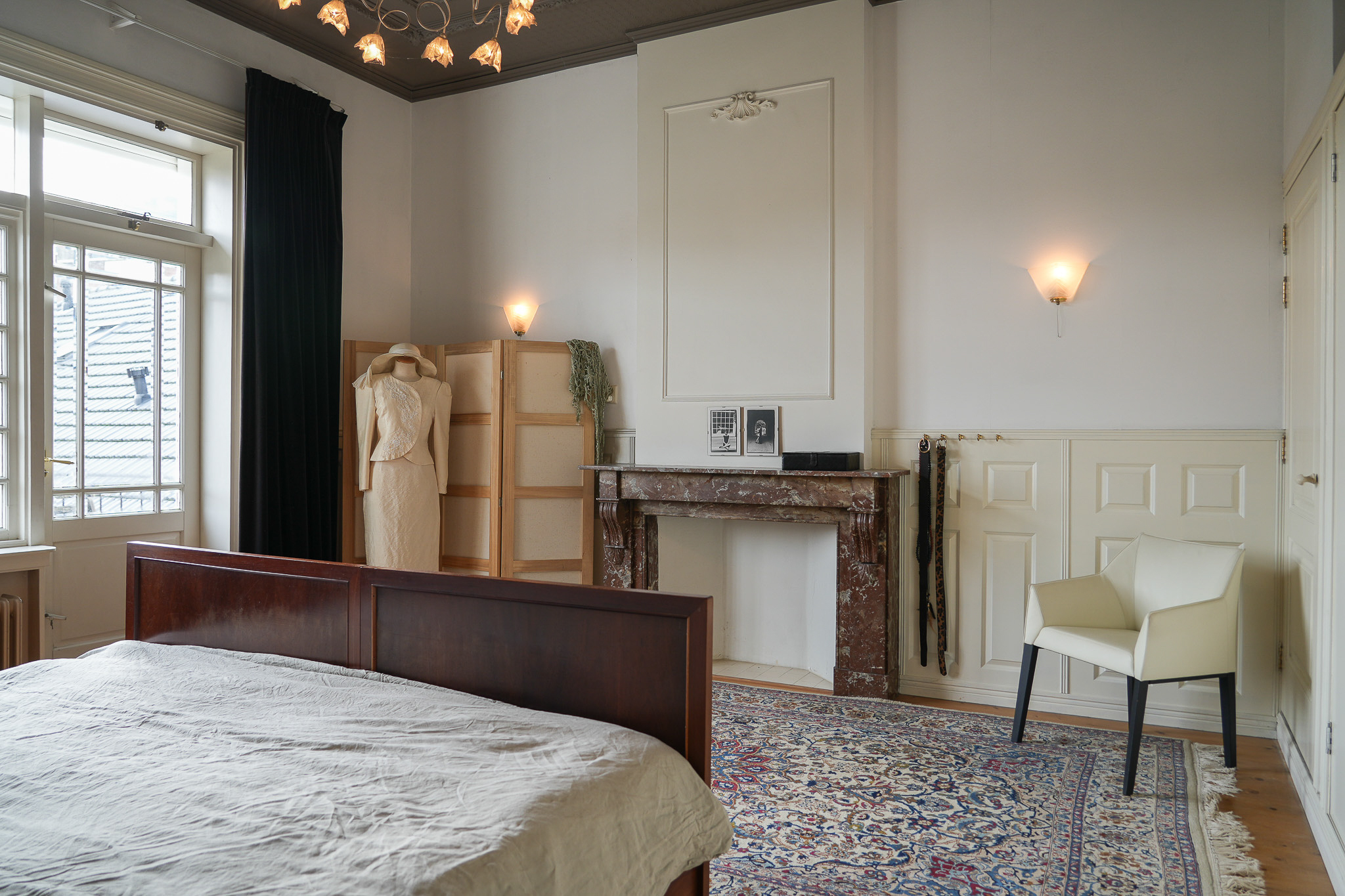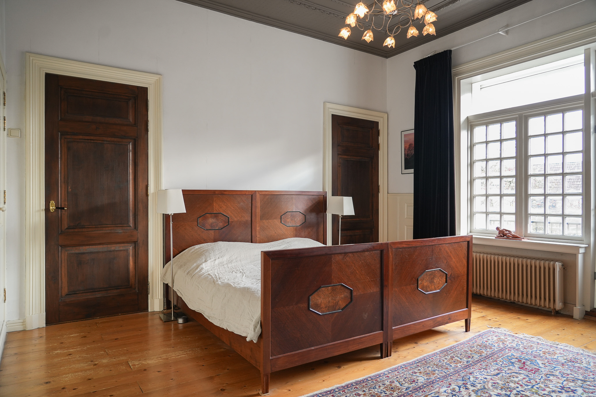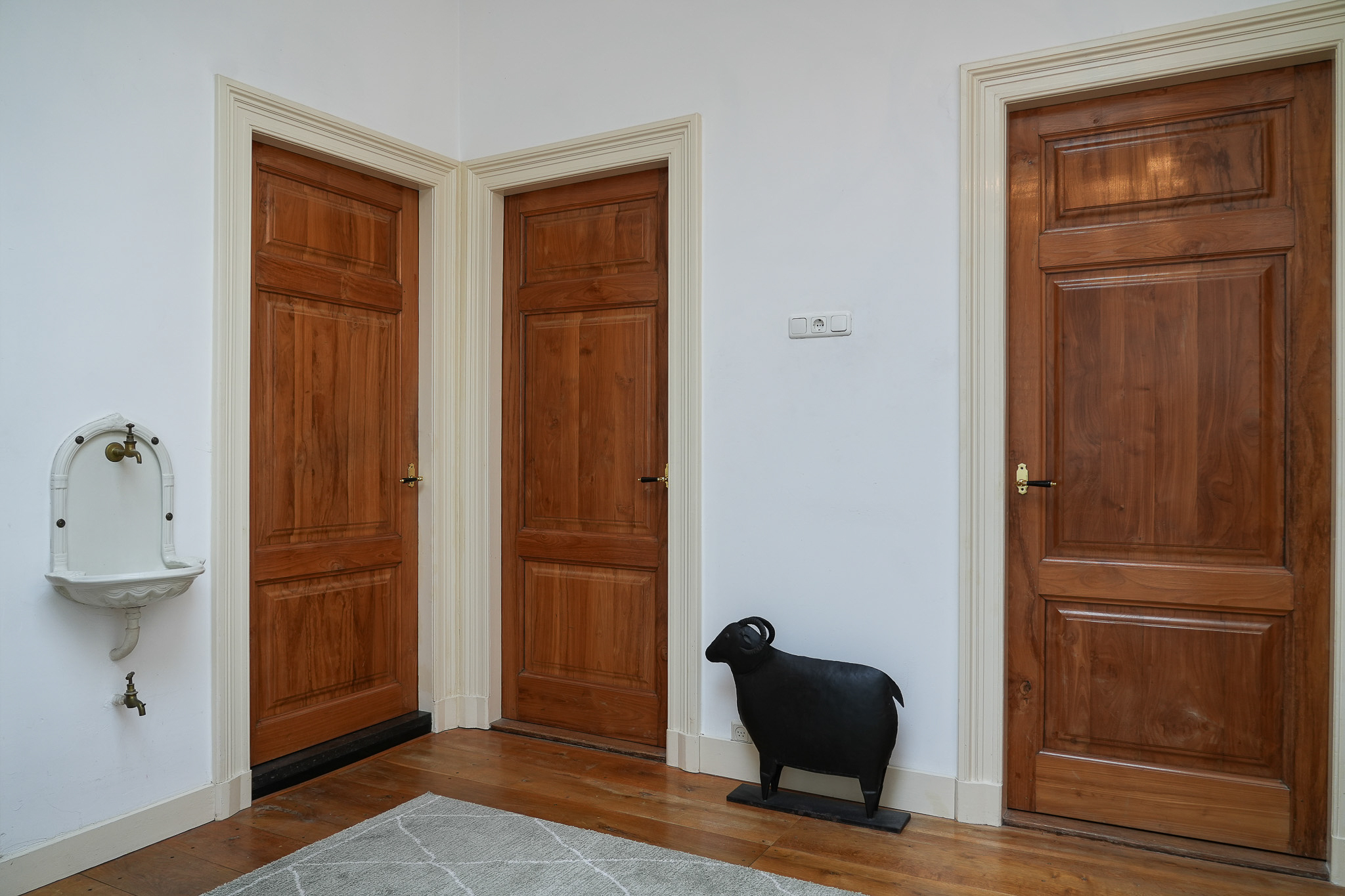 The landing on the first floor is bathed in daylight thanks to a large roof light. Elegant three-panel doors open onto the adjoining rooms. Two bedrooms at the front overlook the green square. In the vestibule of one of these rooms, preparations have been made for a staircase — a remnant of earlier plans to add a second storey.