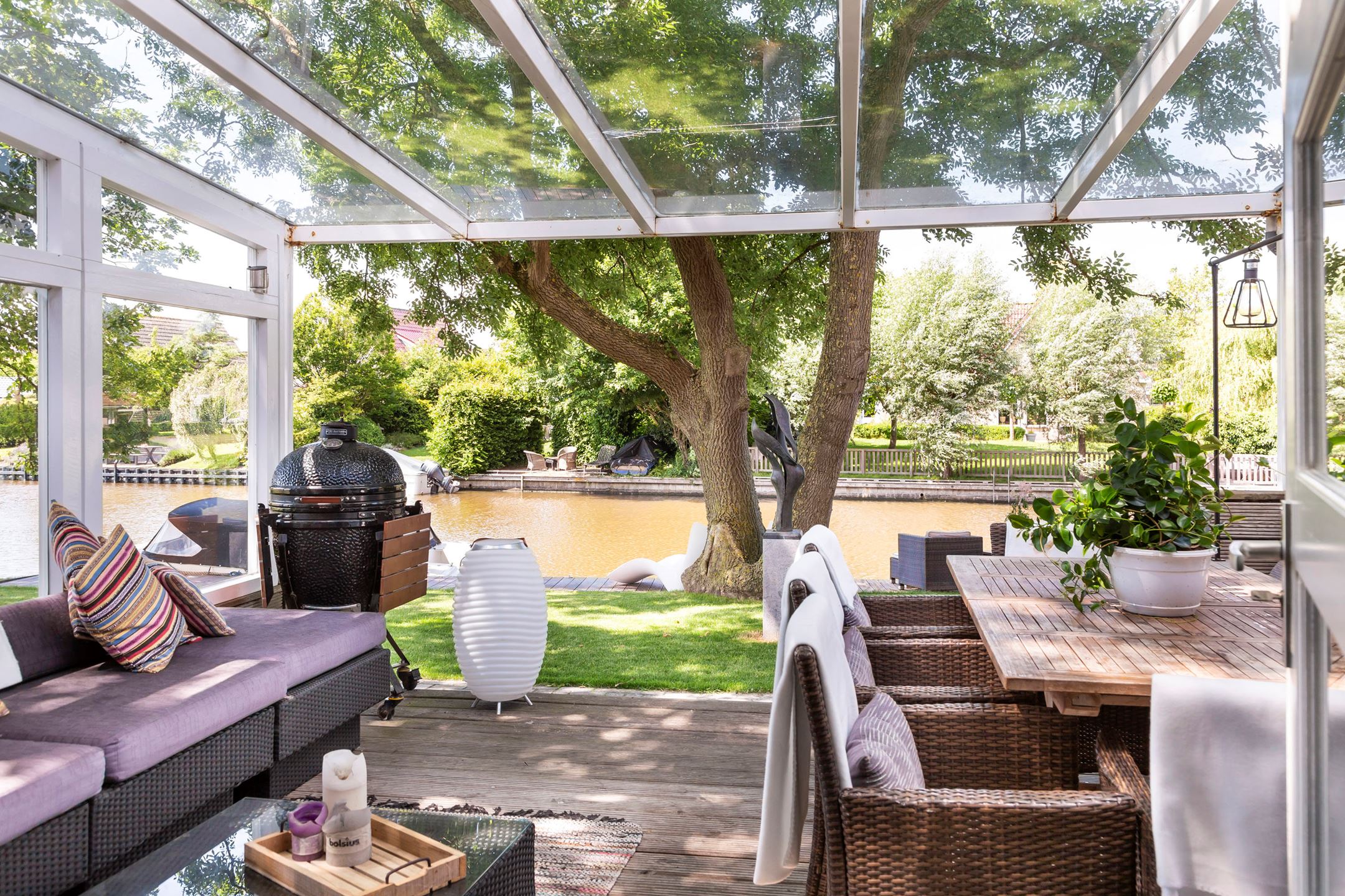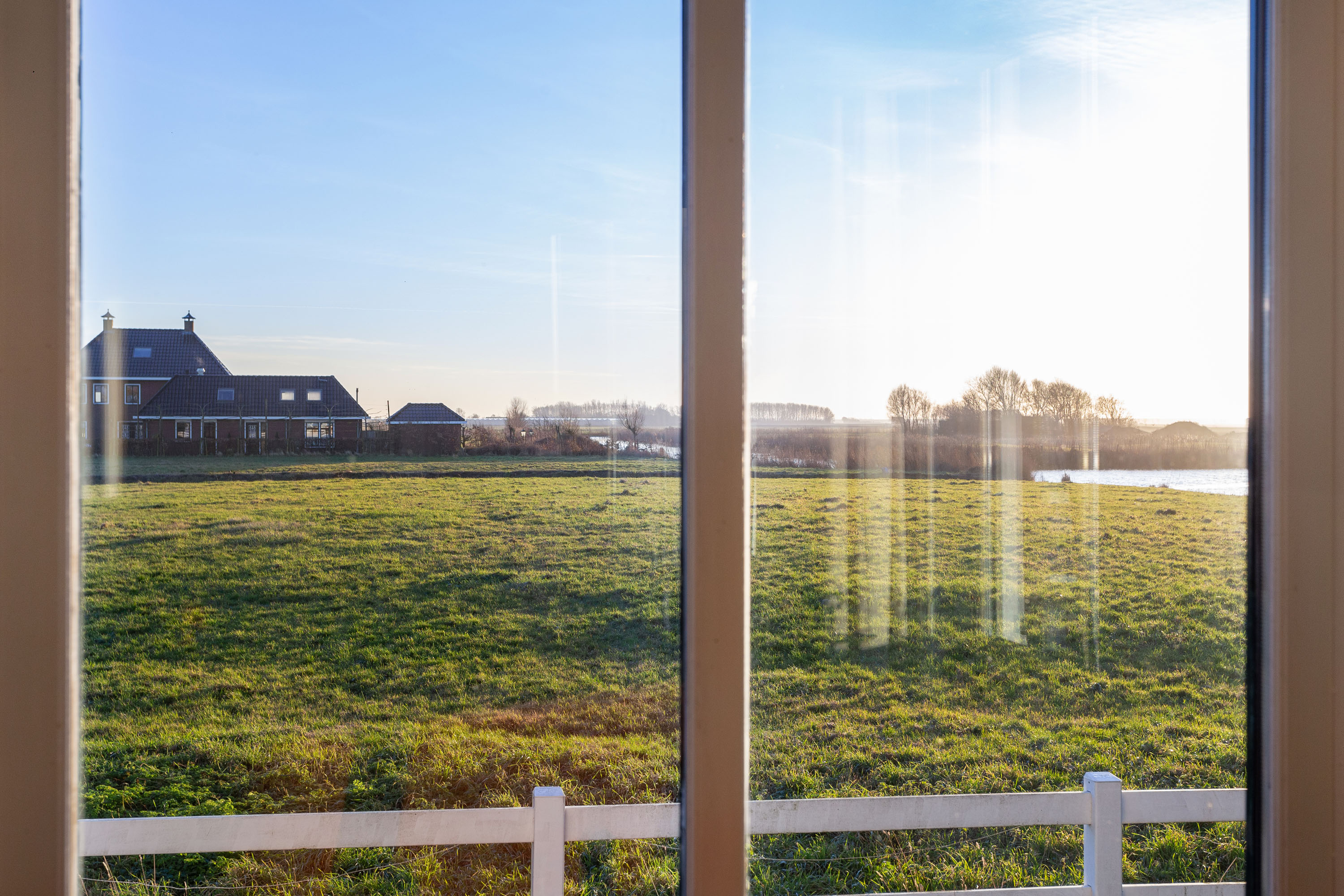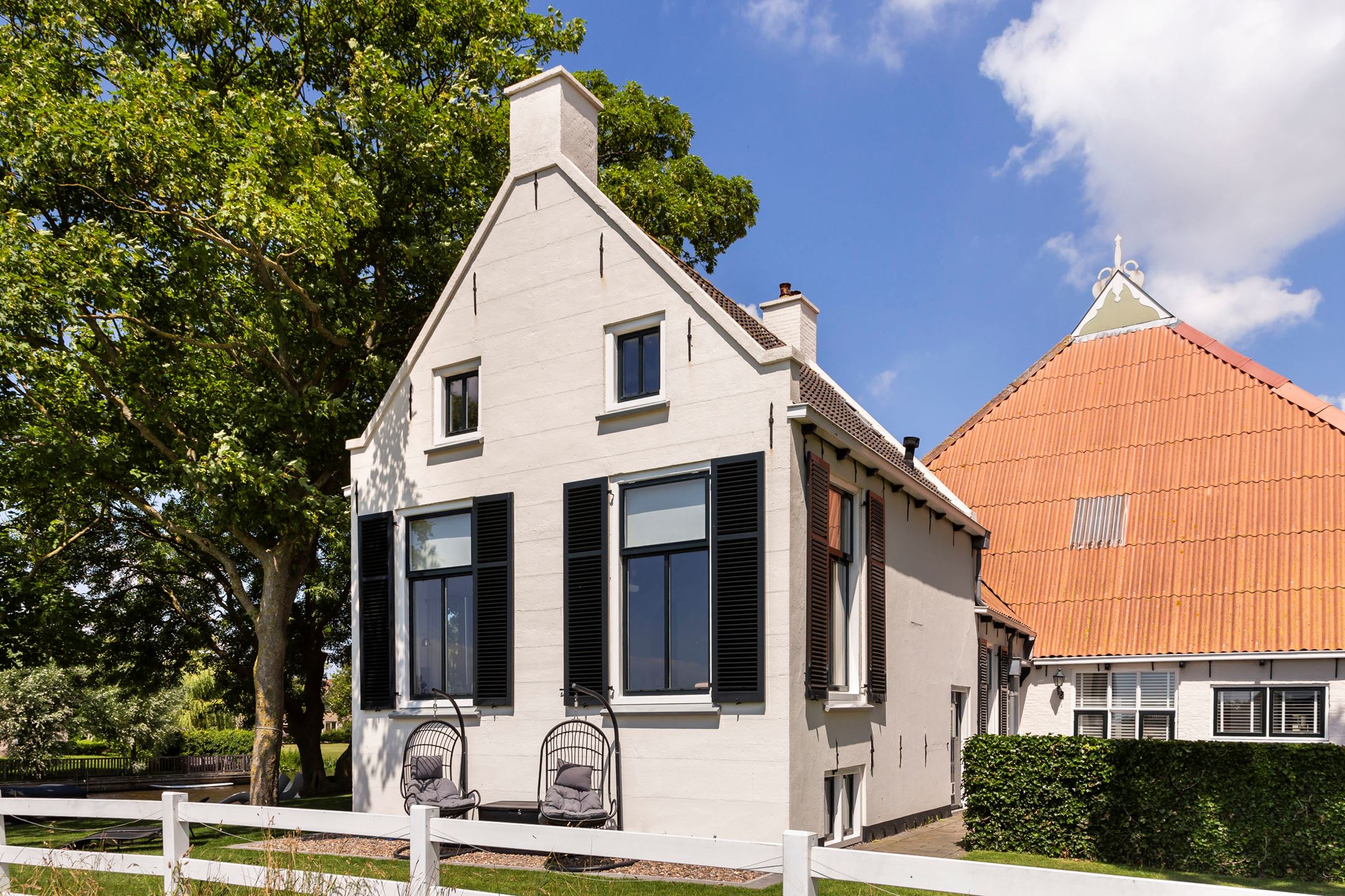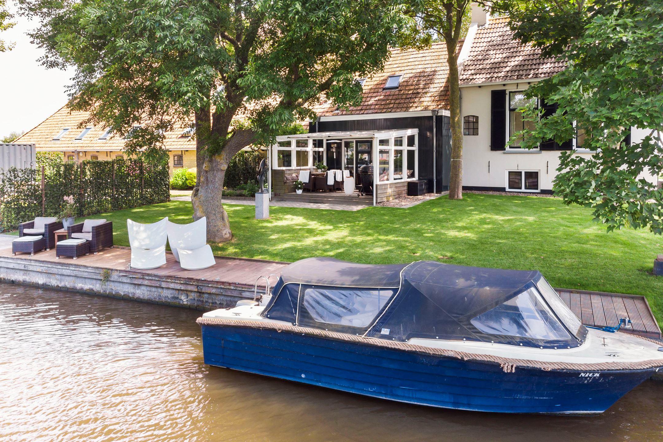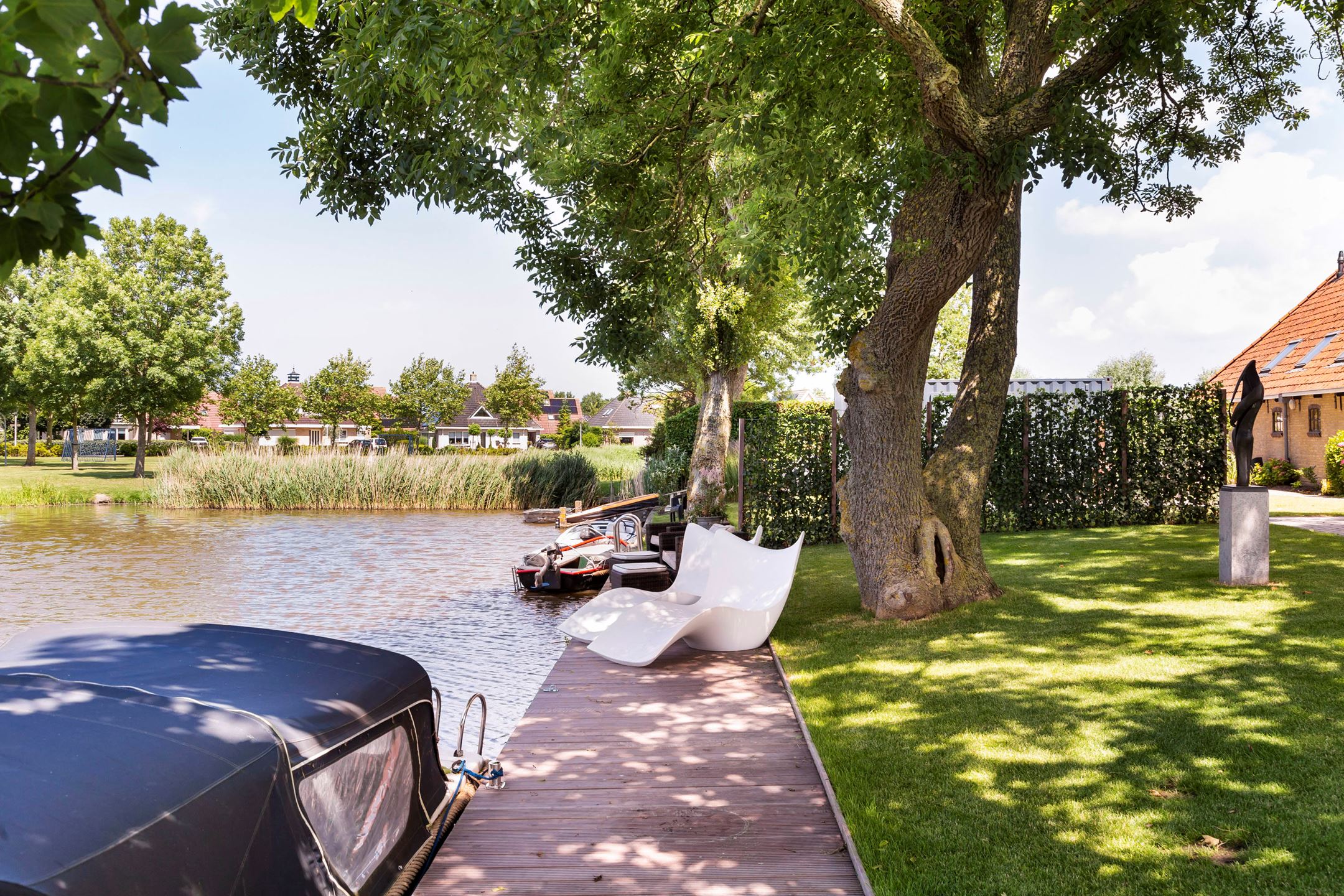 The farmhouse is situated on an island, it is bordered by water with the Elfsteden Harlingervaart on the south side of the plot. The beautiful trees and weeping willows along the jetties and canoe/boat ramp emphasize the maritime environment. The hardwood jetties provide ample mooring for numerous boats.