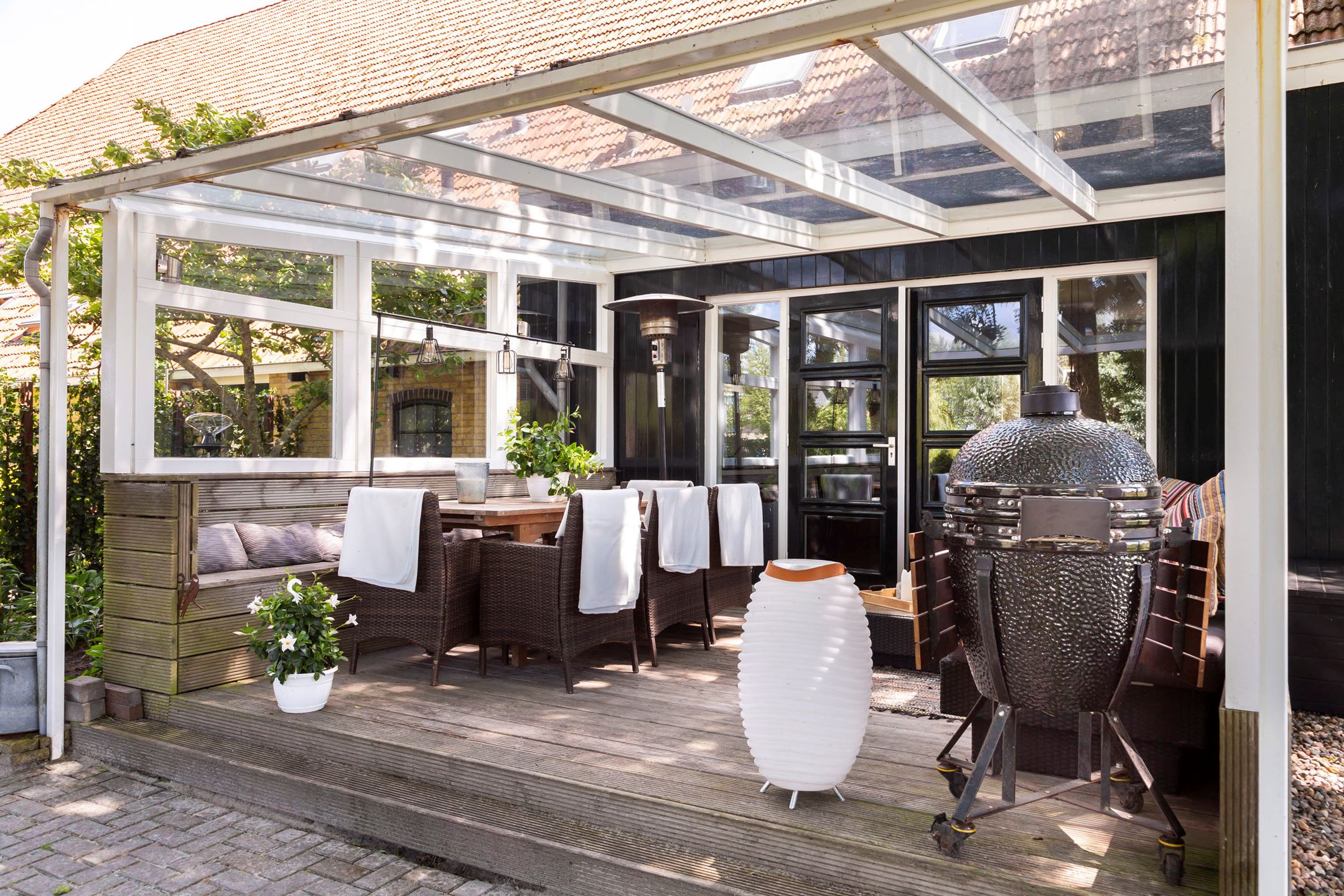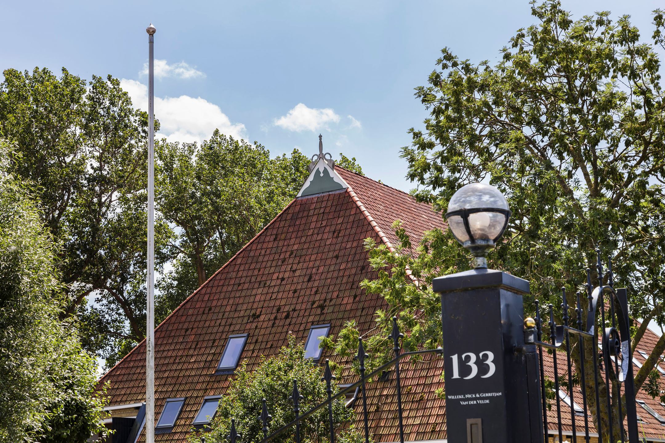 The modernized front house on the south side of the farmhouse can be entered via the terrace with front door to the hall on the side of the house or inside through a connecting door in the former barn. It has a bright attractive spacious upstairs room used as a living room where the old fireplace and authentic round "box bed" doors catch the eye. The upper room gives a panoramic view of its own pasture, the bird nesting area, the Harlingervaart and the dike with the Wadden Sea beyond. The new modern kitchen with beautiful oak floor is spacious, equipped with a pantry and all possible luxury appliances and has doors to the "conservatory" terrace where you can sit in the shade overlooking the beautiful garden and the waterfront. The wrought iron gas stove gives the kitchen a nostalgic look. Under the kitchen is the former milking parlor with original estriken floor transformed into a recently insulated entertainment room, equipped with radiators.