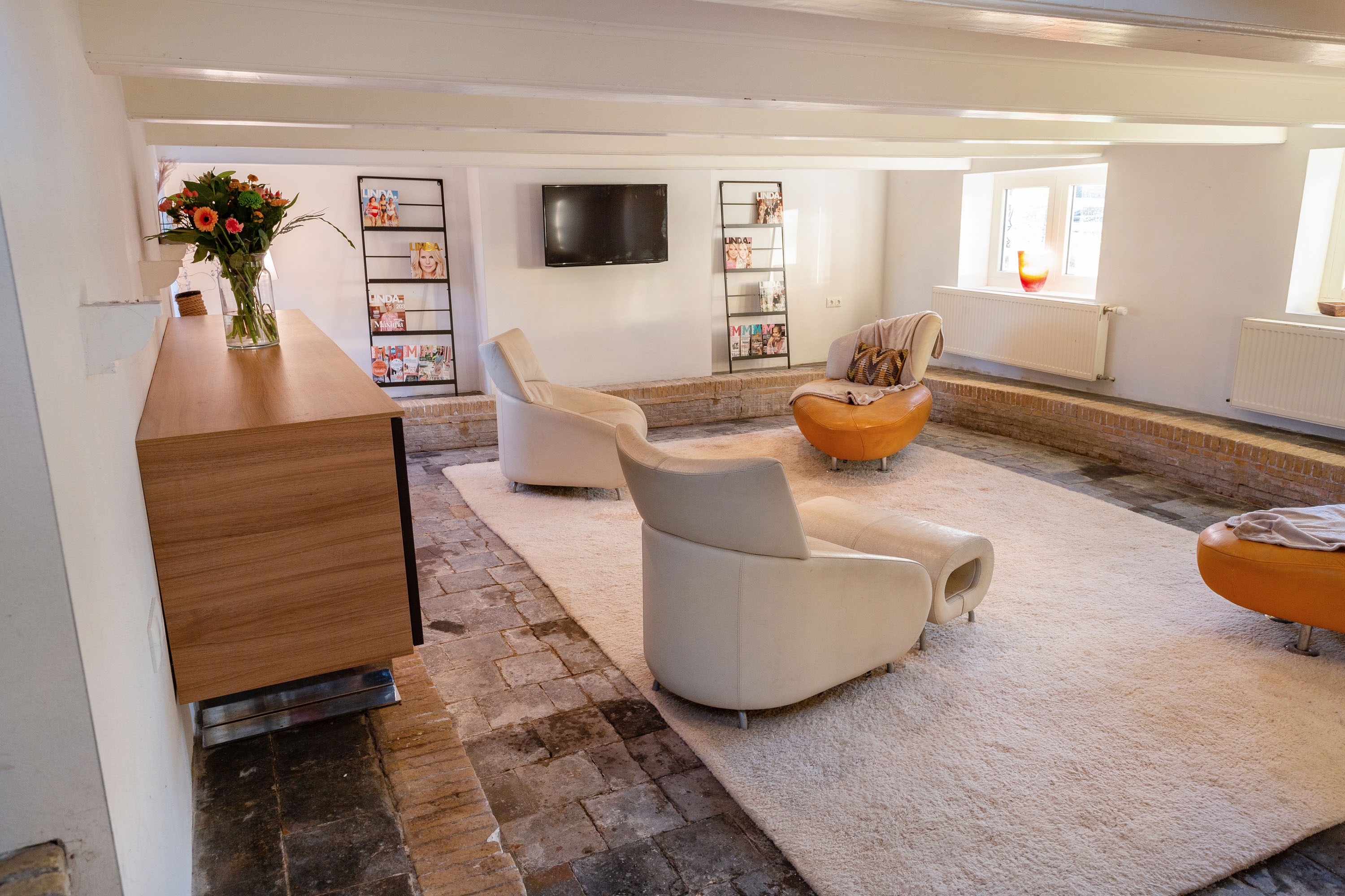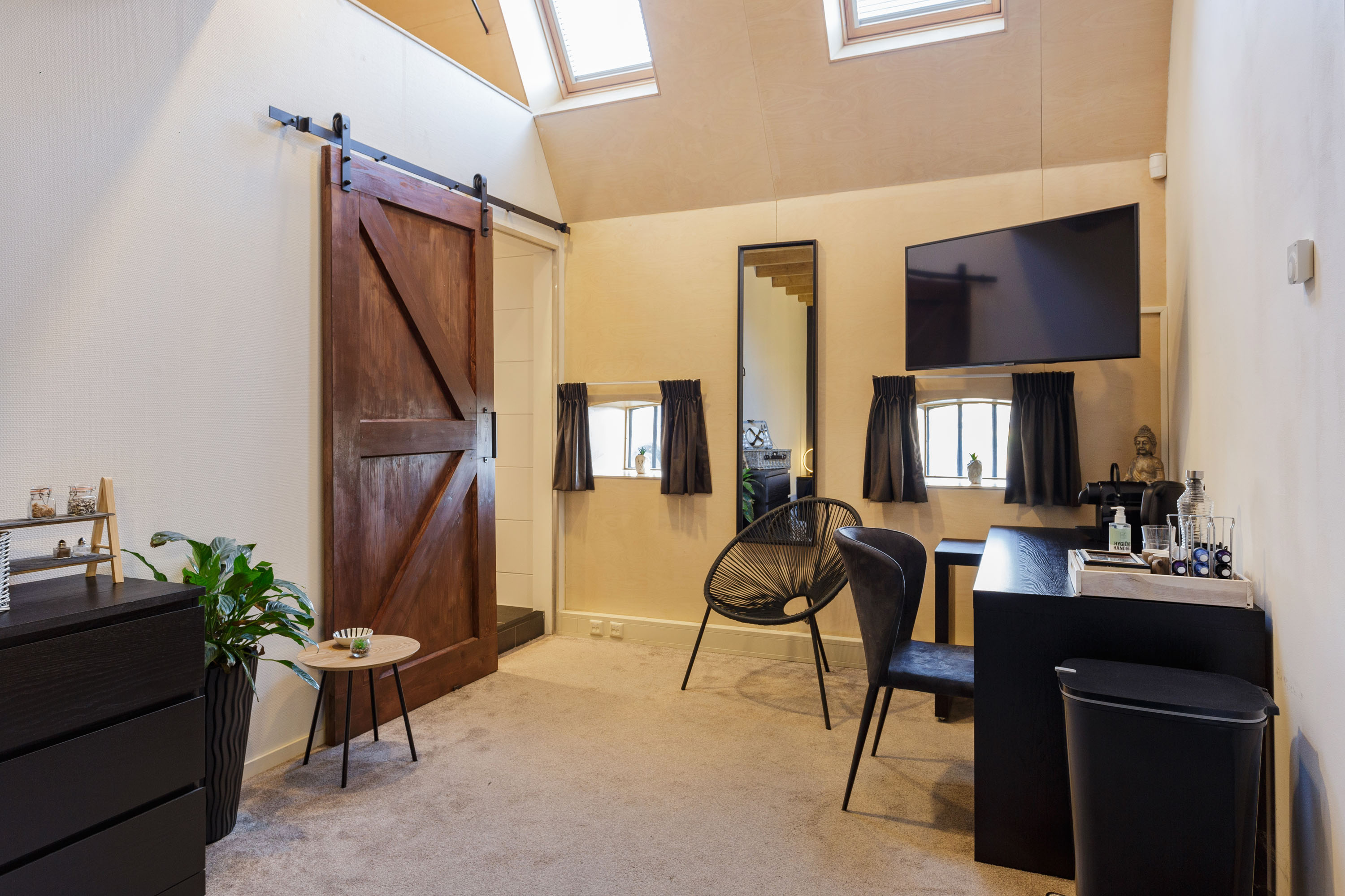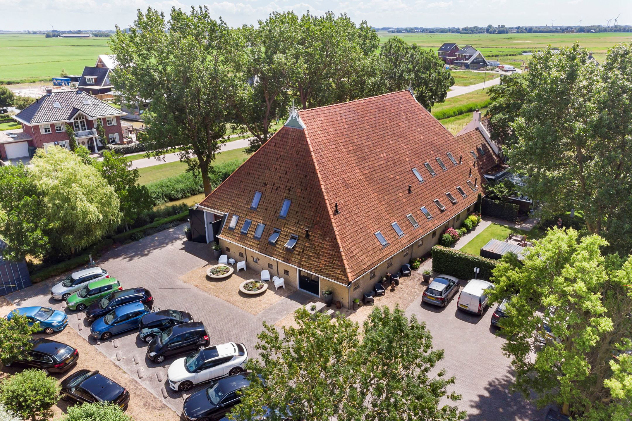 The former barn has been professionally renovated and completely modernized. Imposing open stable doors with glass entrance, is a striking feature upon arrival at Harlingen Staete. There are now 4 beautiful fully furnished rooms with en-suite bathroom. Furthermore, downstairs are 3 spacious multifunctional rooms situated around a large open-plan hall with a view of the imposing ridge in the middle of the barn. All rooms are light and atmospheric due to the use of a lot of glass, the preservation of the old stable windows and the beautiful old beams of the 6-sided part of the barn in sight. It goes without saying that all high-tech connections/wiring for internet, light, presentations etc. are present as well as a pantry and separate toilet groups.