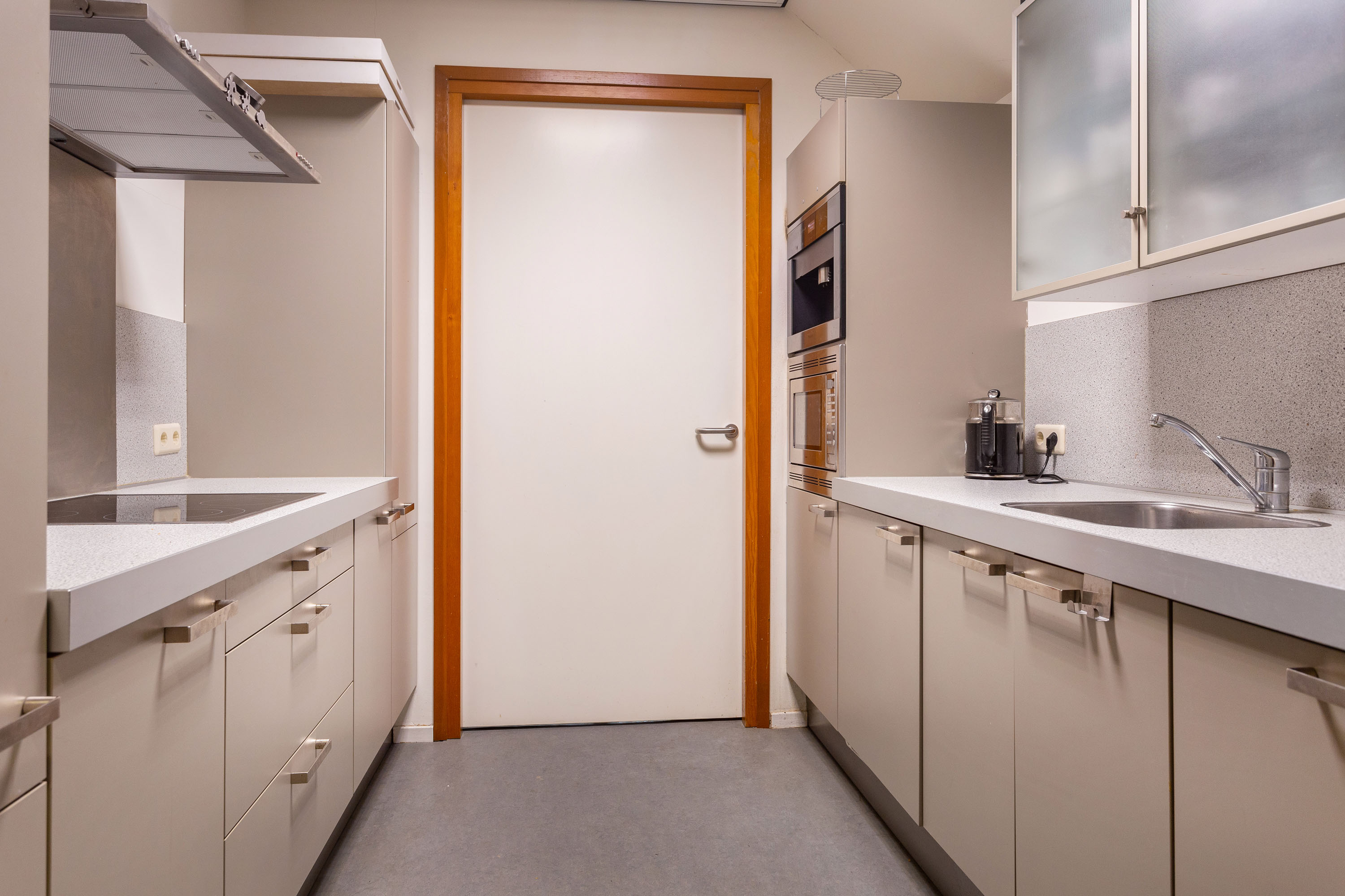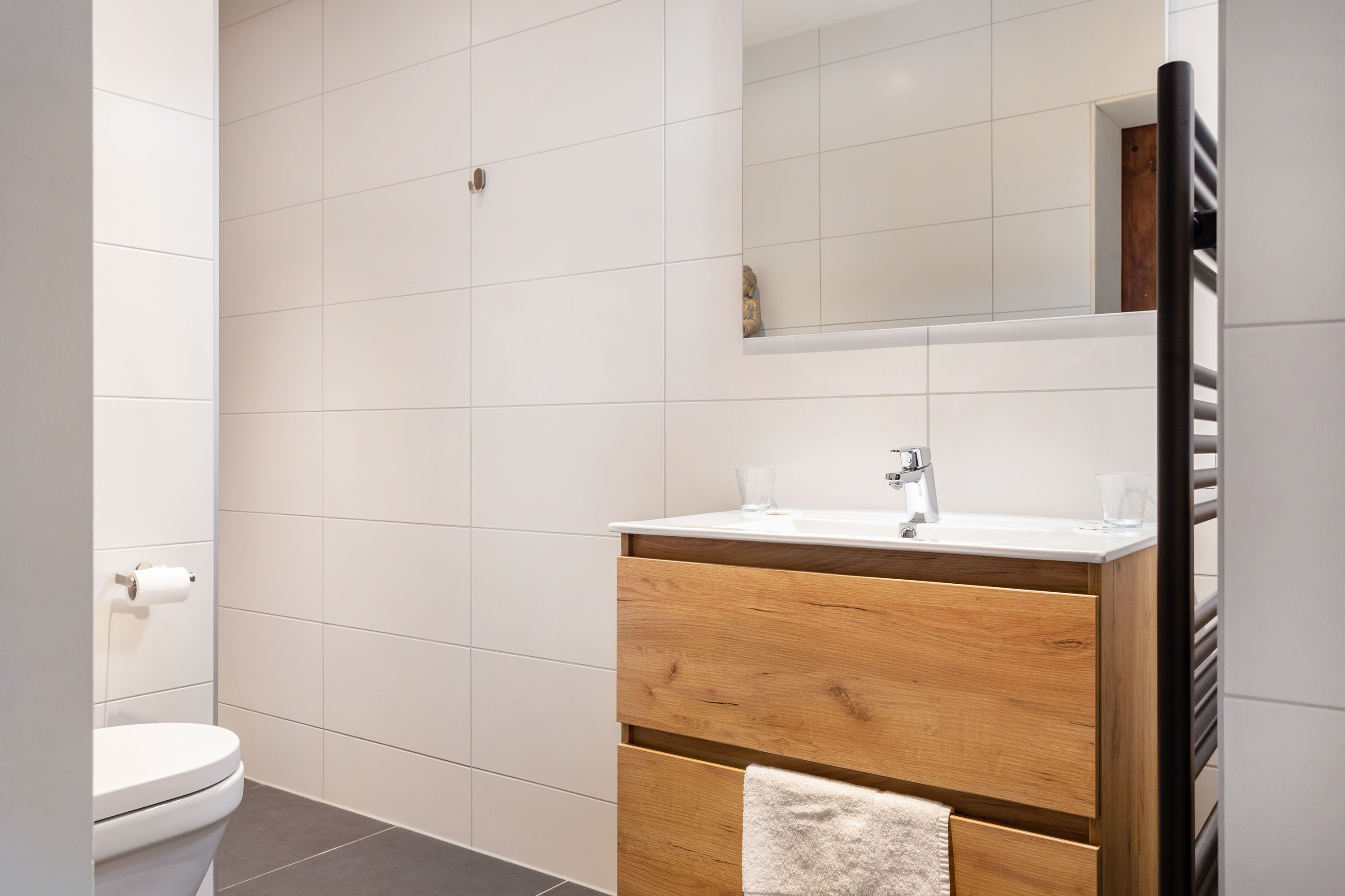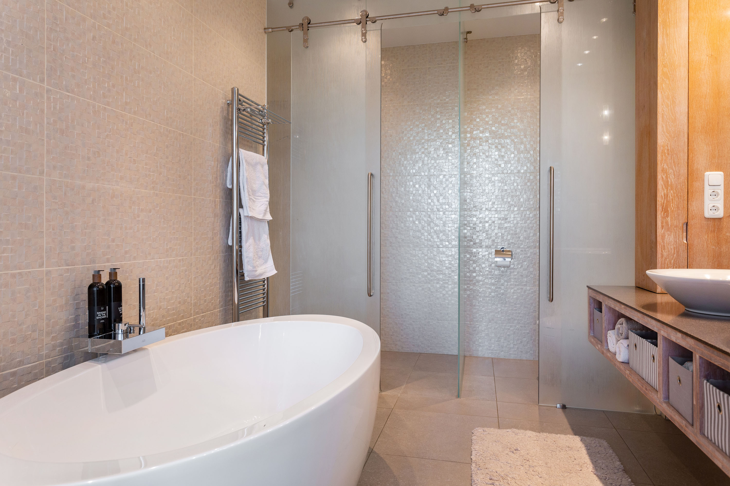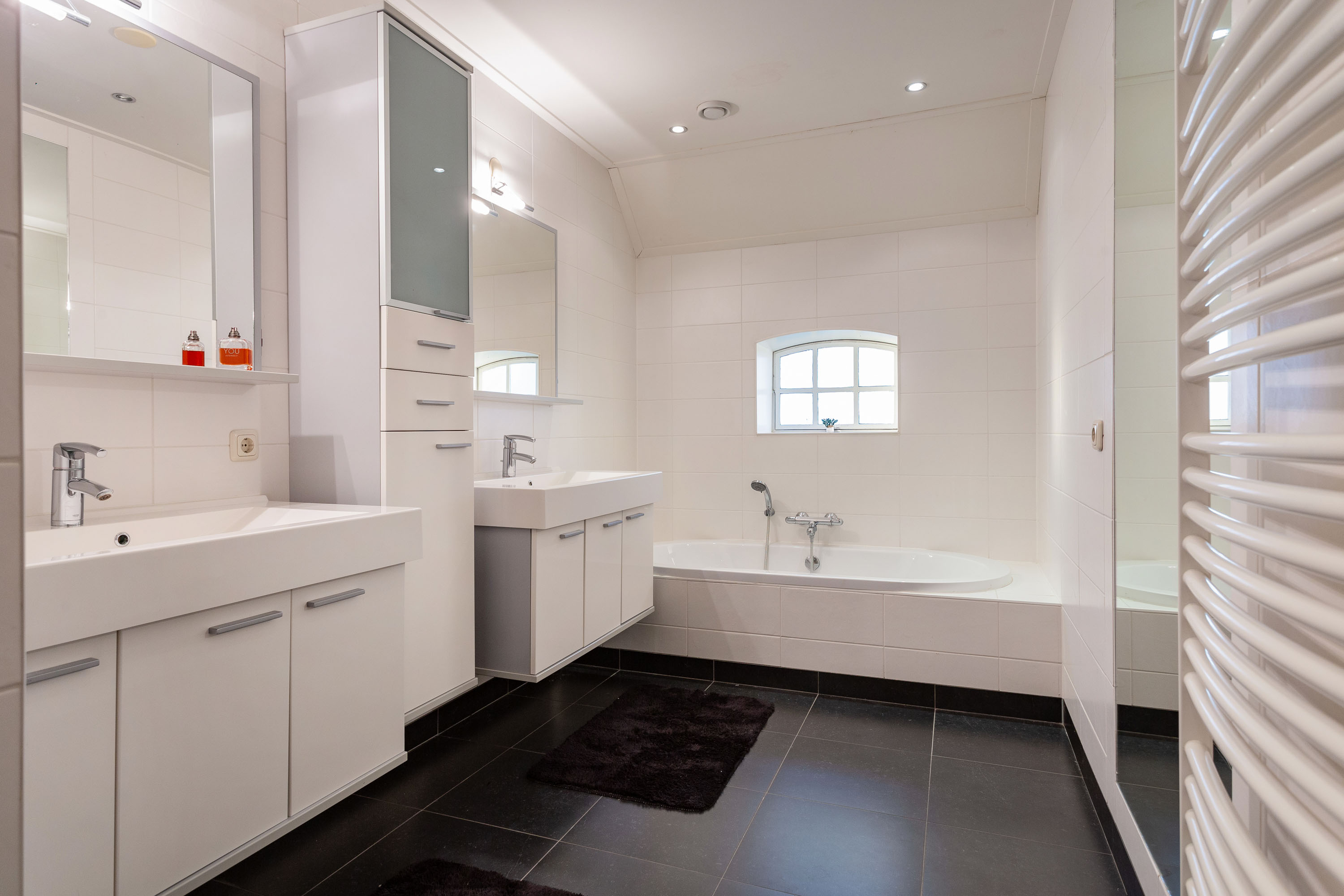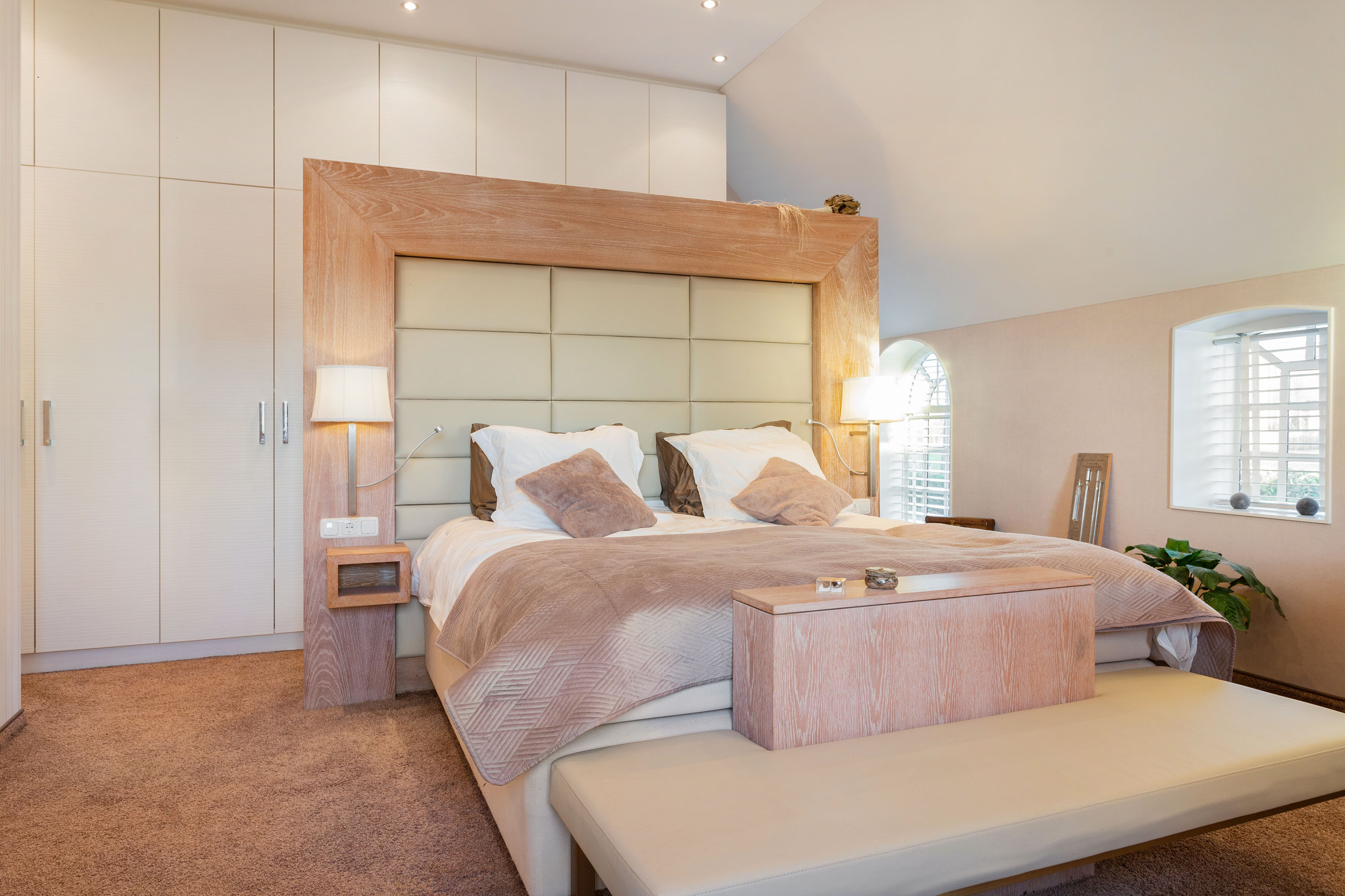 The hall gives access to the master bedroom equipped with a stylish en-suite bathroom with freestanding bathtub, separate toilet, walk-in rain shower and double washbasins. Between the bathroom and bedroom a generous walk-in closet with frosted-glass doors is situated. The master bedroom has a door to the south terrace and insulated characteristic stable windows. The bed with an electrically integrated recessed TV cabinet stands prominently in the room with behind it a large fixed cabinet wall as "dressing room". These rooms all have underfloor heating.