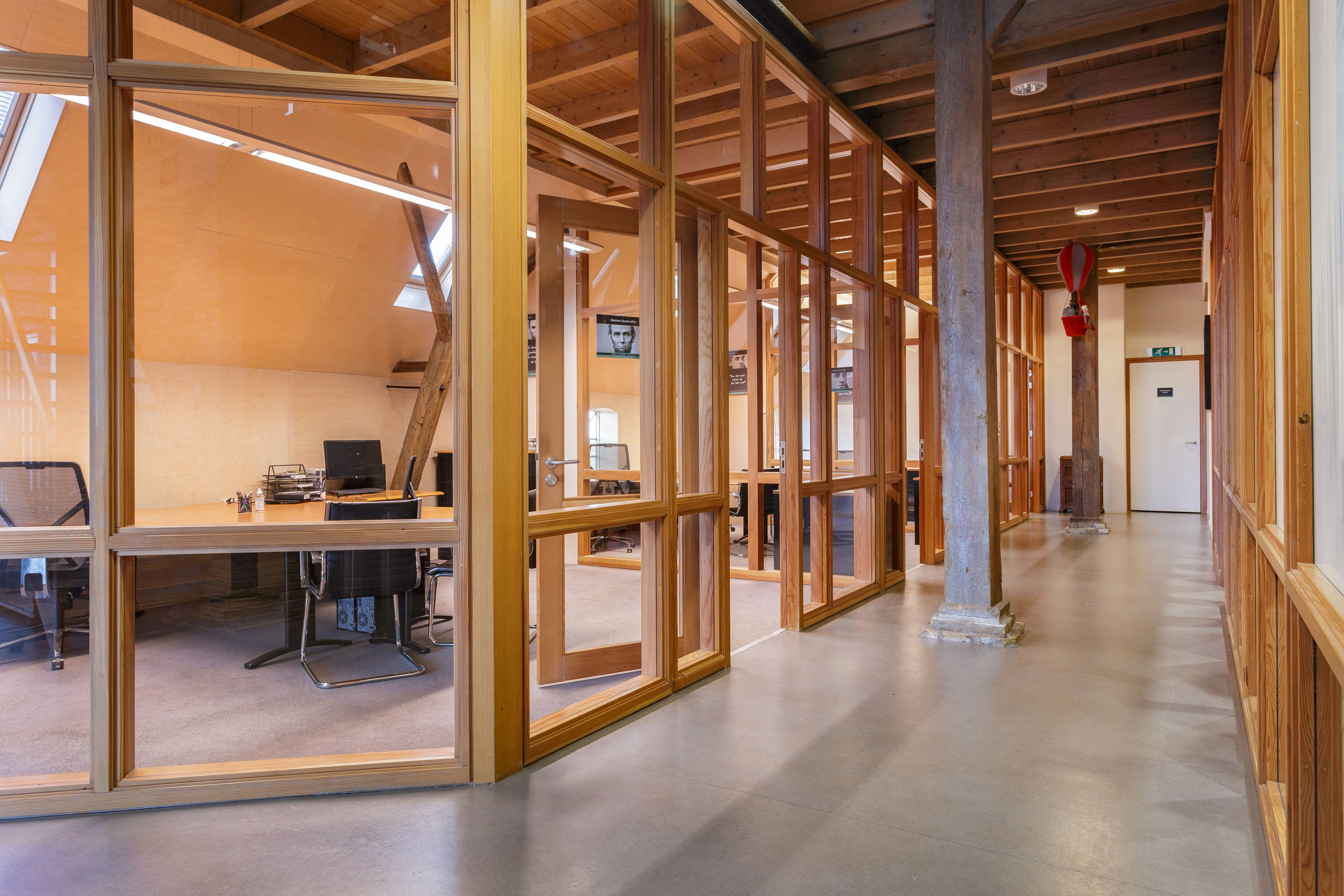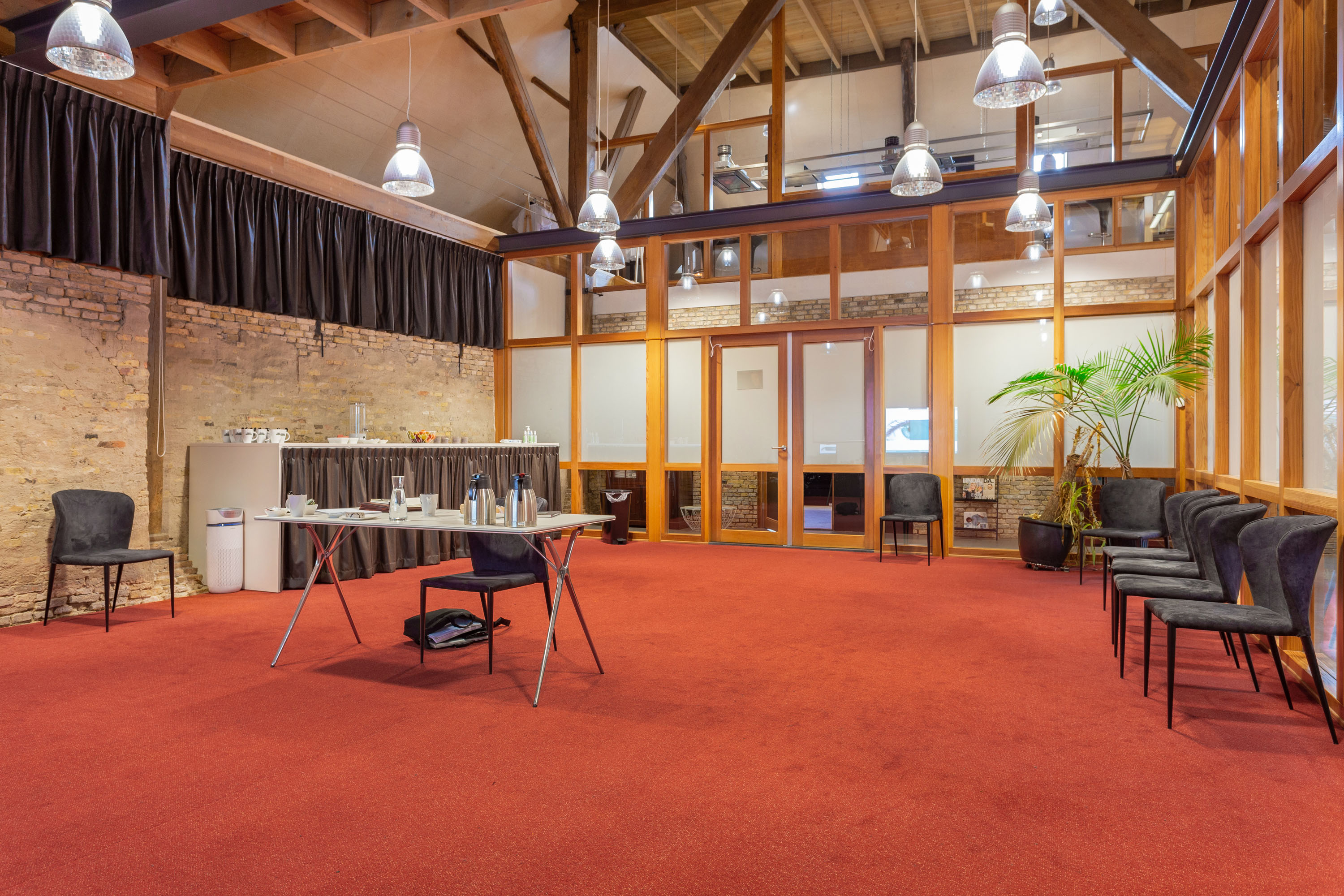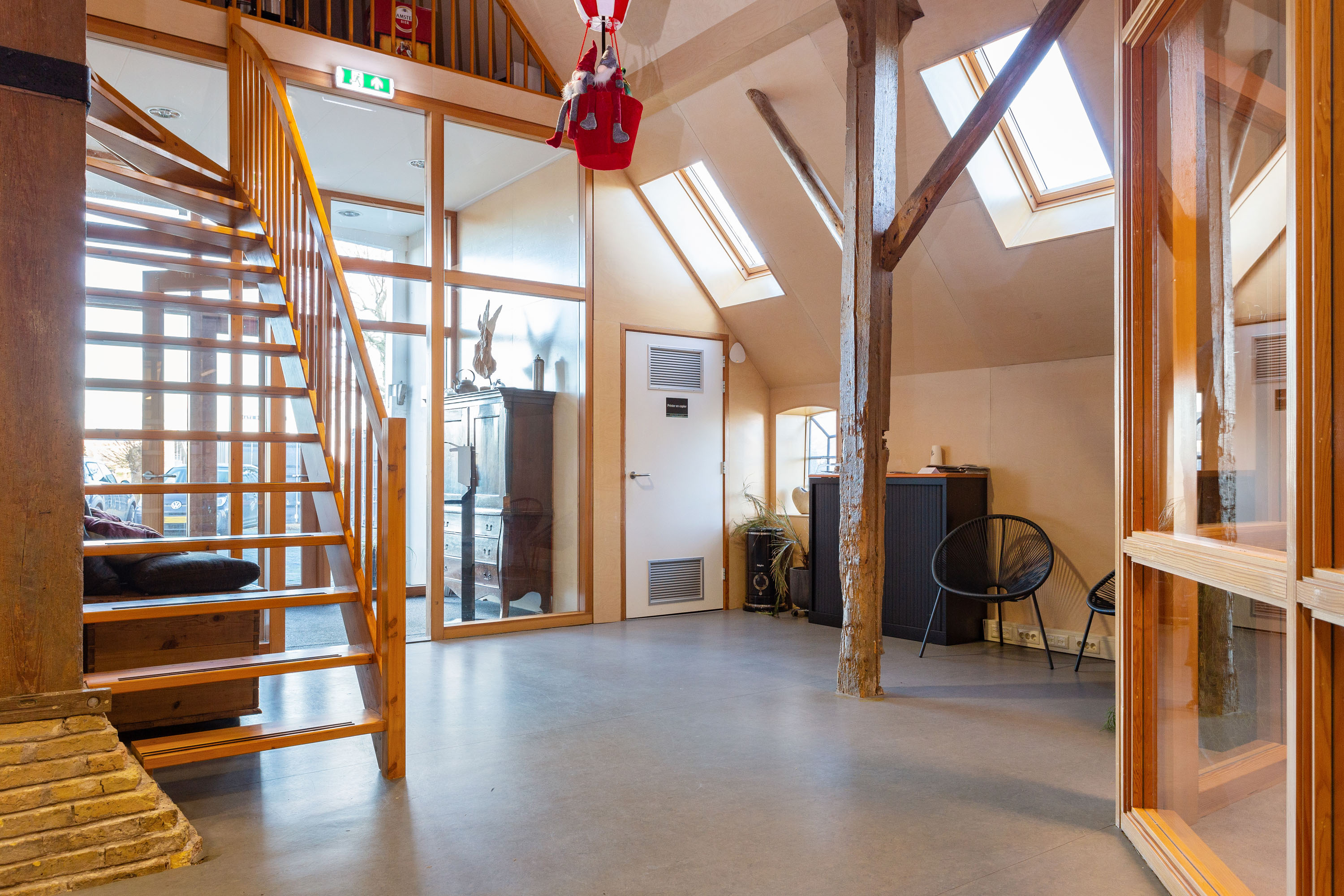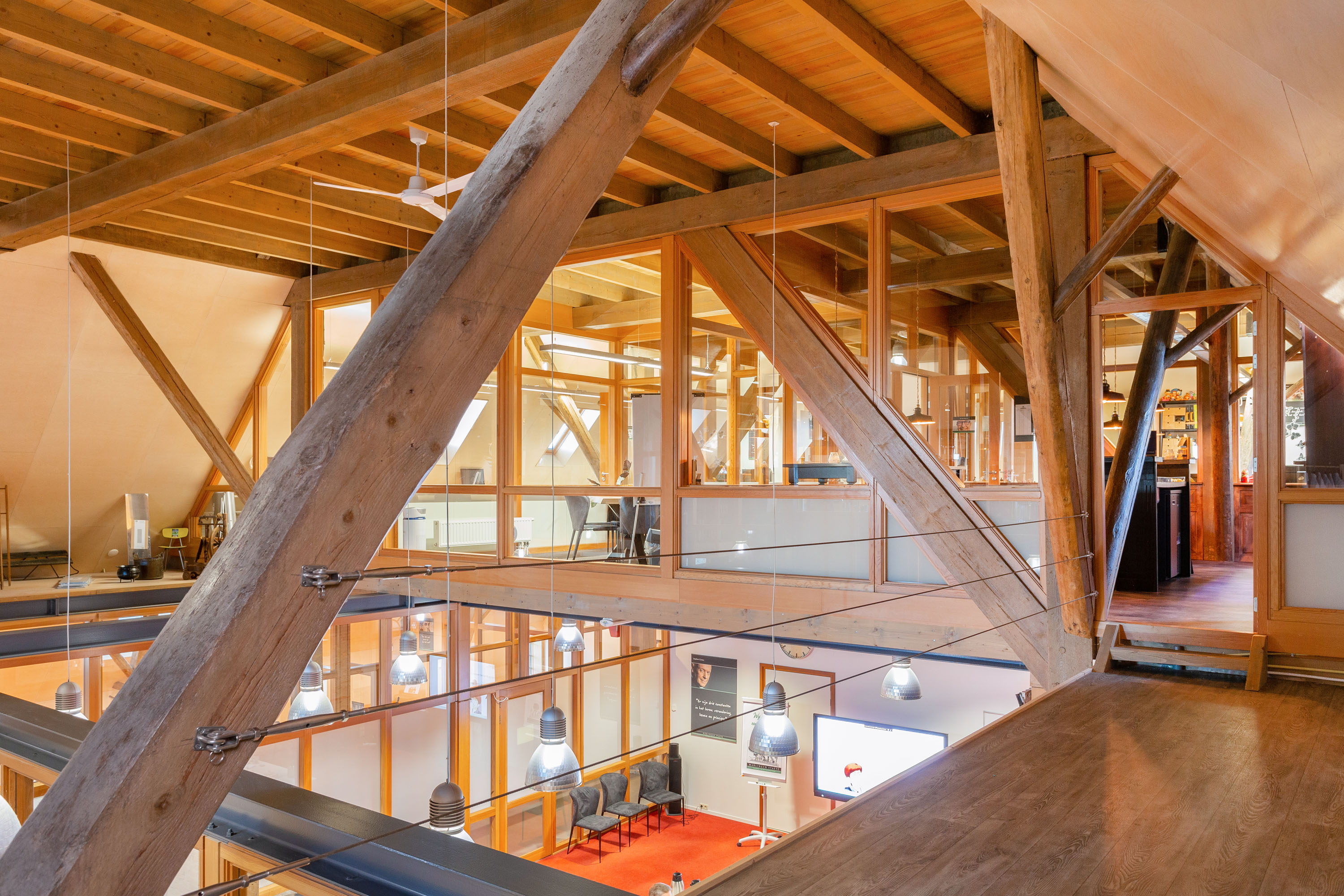 The imposing wooden former stable doors immediately indicate where the entrance is located. As you enter through these doors into the glass front porch you will discover 3 modern rooms that are set up as offices, but can be used for a variety of purposes. The open center of the large section can be used as a living room, fitness or meeting room. All rooms look light and attractive because of the glass walls and the impressive old beams and trusses left in sight up to the ridge. The spacious pantry and separate toilets are located at the rear of the former barn.
