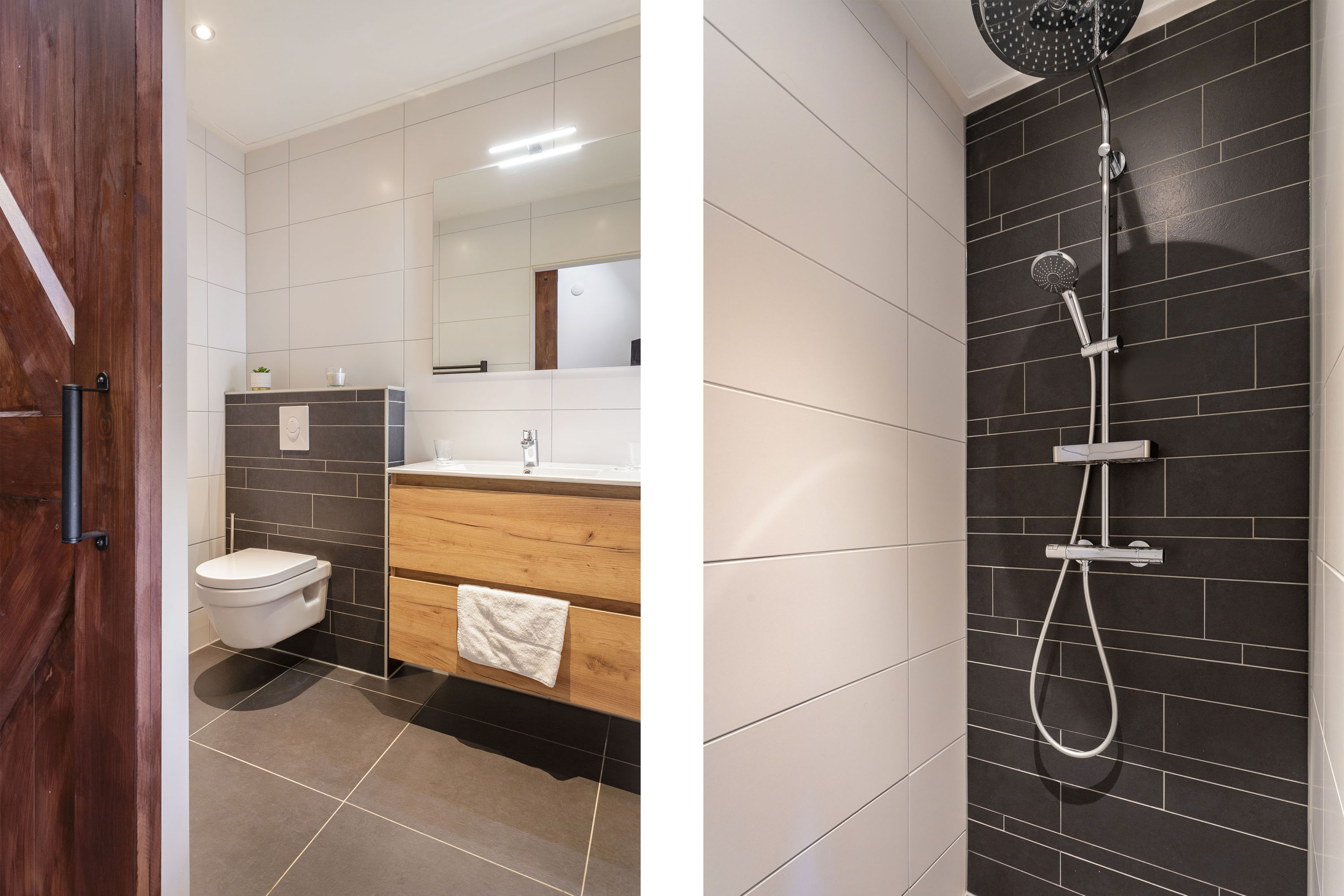 On the right side of the barn downstairs, 4 modern rooms with en-suite bathrooms have been created. The rustic atmosphere and feeling of outdoor living has been retained. Each room has its own entrance.