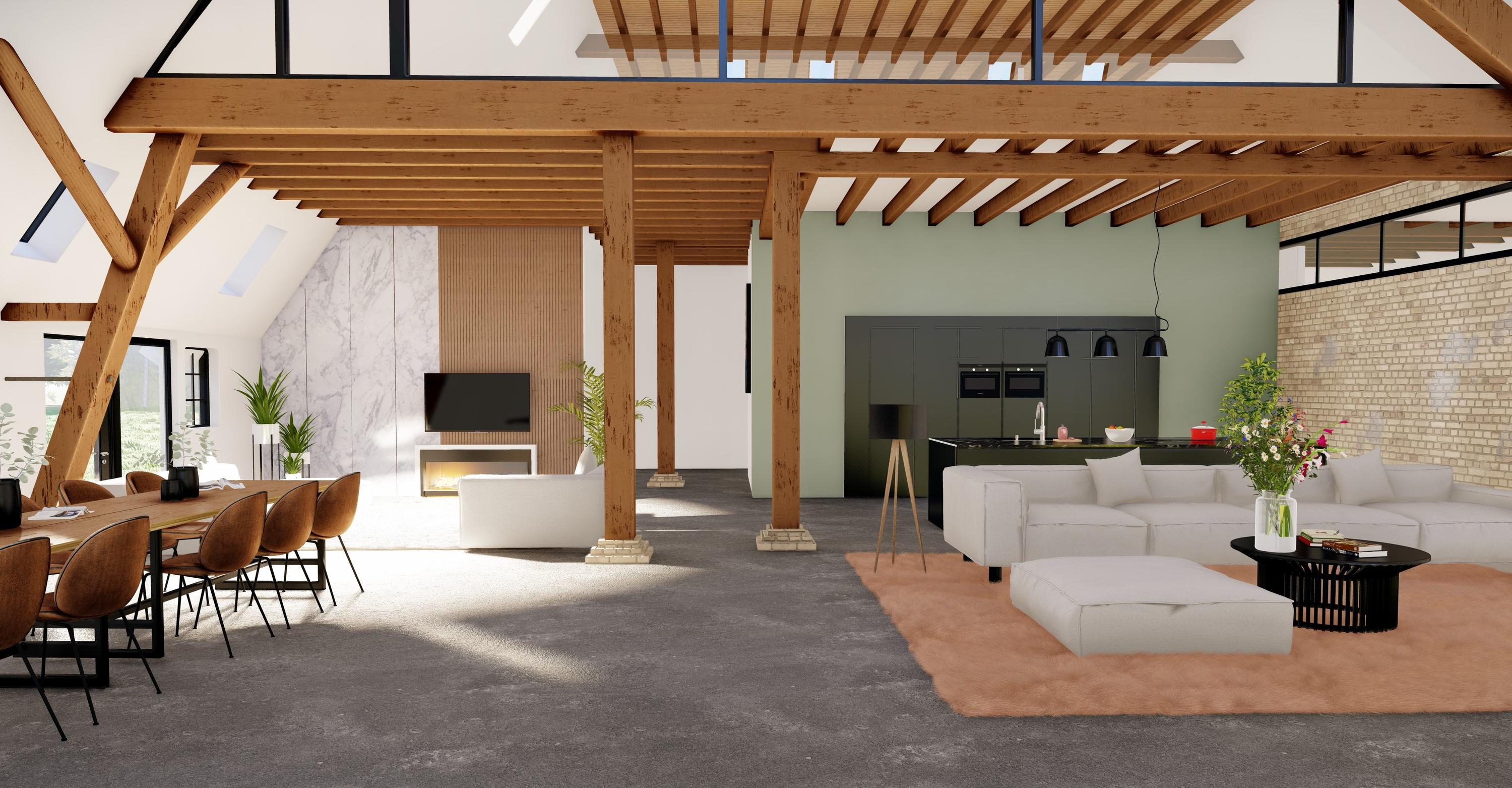 Via two staircases you can reach the 1st floor of the barn where you will also notice the beautiful old wooden trusses and the modern and attractively panelled ridge. This floor has 3 large multifunctional rooms, a large entertainment room with loft, a cozy bar and a professional cooking studio.