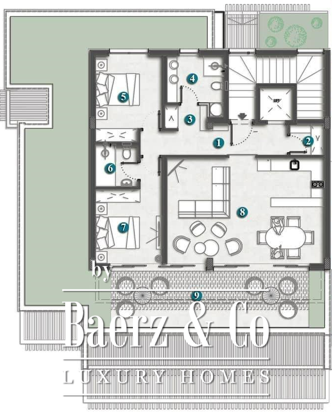Structure of the apartment: hallway, living room with kitchen and dining table, 2 bedrooms, 2 bathrooms, a terrace and a rooftop terrace. The apartment itself has 76,40m2, its terrace has 22,40m2, its rooftop terrace has 64,02m2, which sums up to the total of 162,82m2. It has a view of the sea and the mountains that surround it. The apartment will be delivered with finished tiles, finished floors, equipped bathroom and equipped air conditioning.