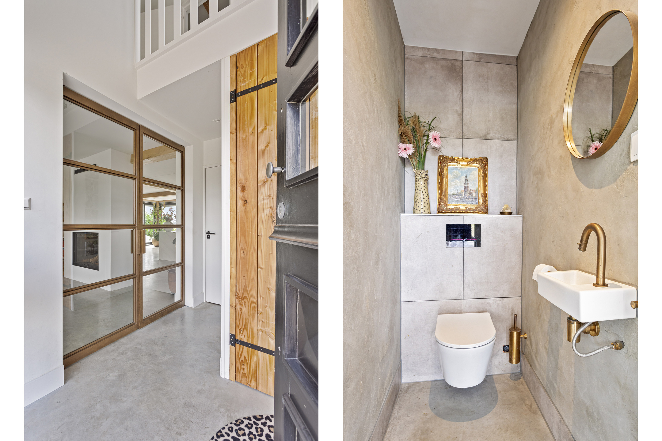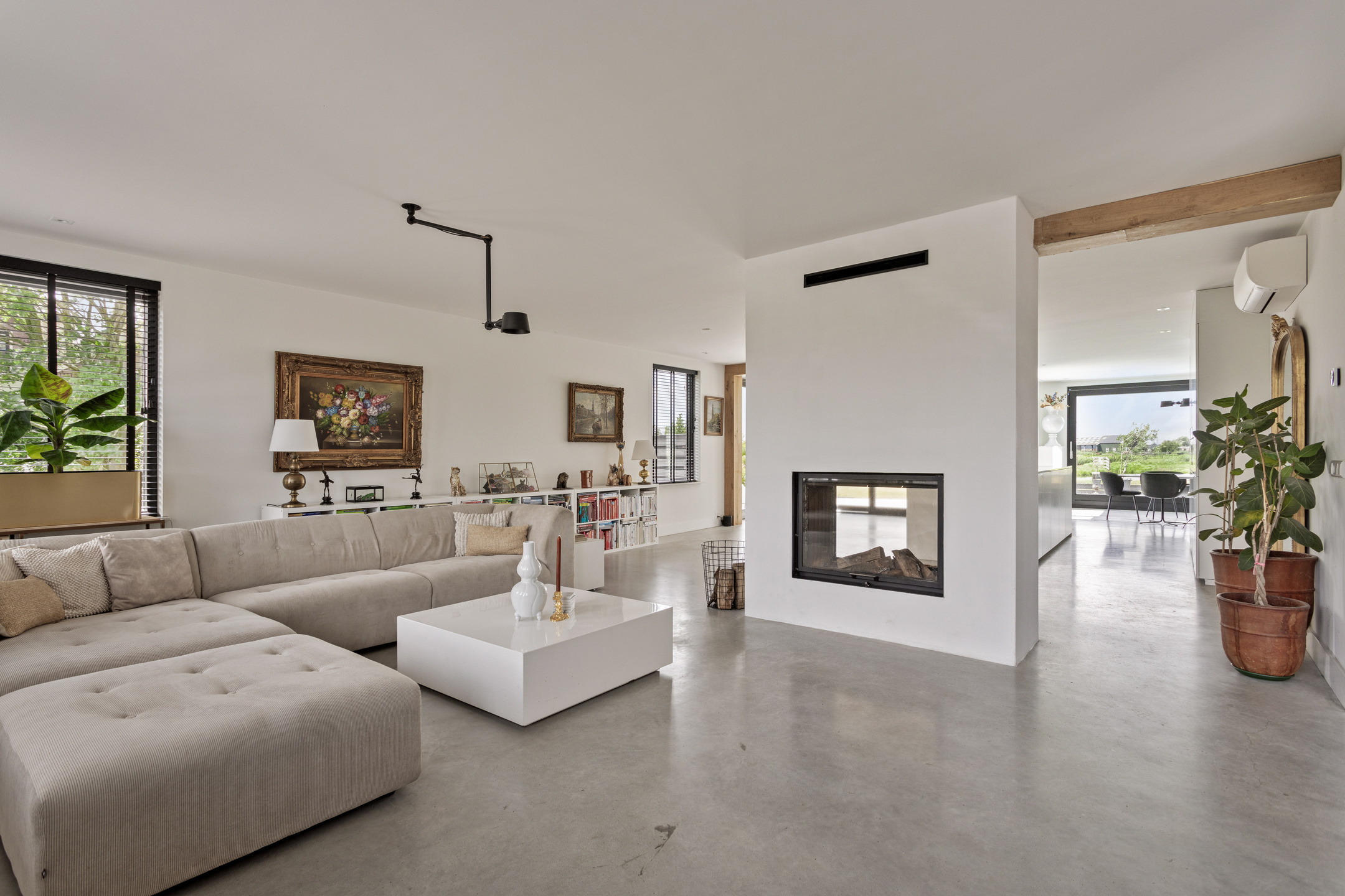 A spacious entrance with a mezzanine (creating a high ceiling) and custom-made steel pivot doors in bronze metal that lead to the living room. The living room, featuring beautiful French oak beams, is bright and airy thanks to the large windows and sliding glass doors. At its heart is an open fireplace with double-sided glass, creating a cozy atmosphere in both the living room and the kitchen.