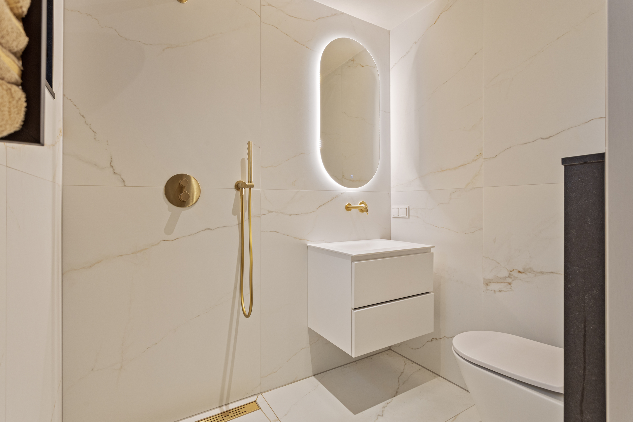 Here you’ll find two spacious bedrooms and a modern bathroom. The master bedroom, located at the rear, comes with air conditioning, double doors, and a magnificent panoramic view. The luxurious bathroom includes a freestanding bathtub, a large walk-in shower, double sinks, and Hotbath Cobber faucets.